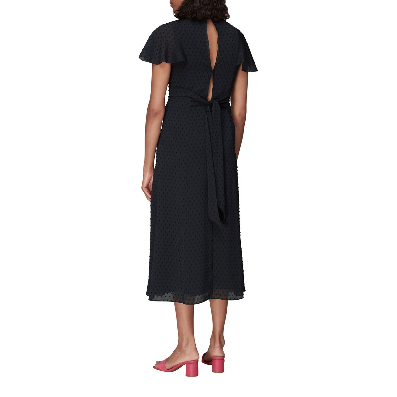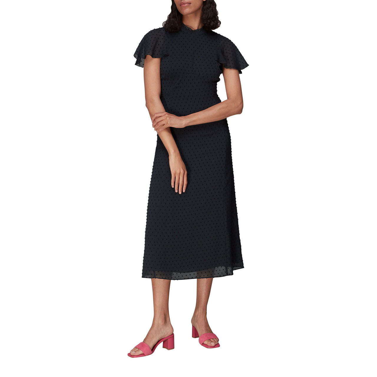 - Short sleeve, fluted sleeve, high neck, zip fastening, fit and flare design, textural polka dot pattern.