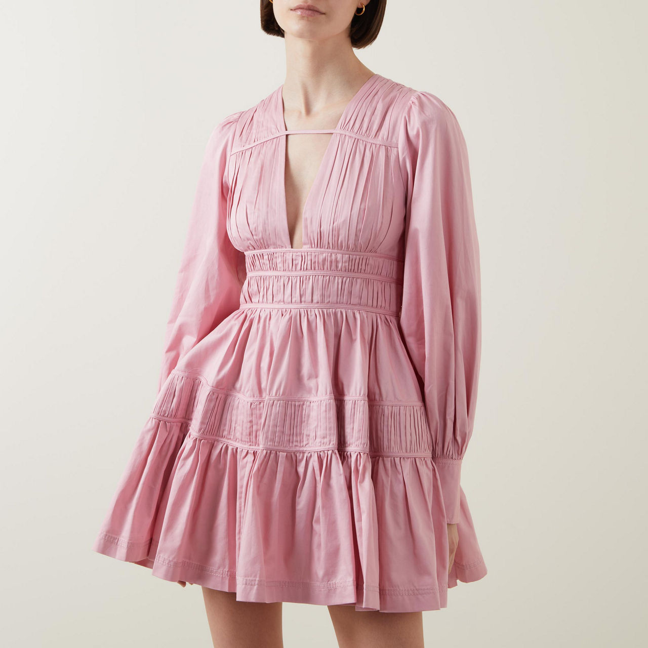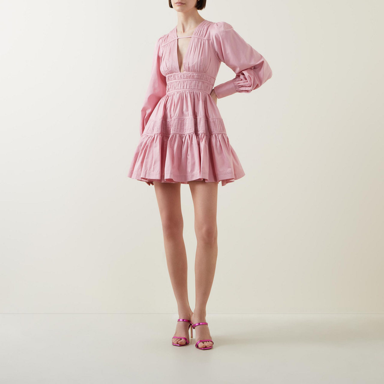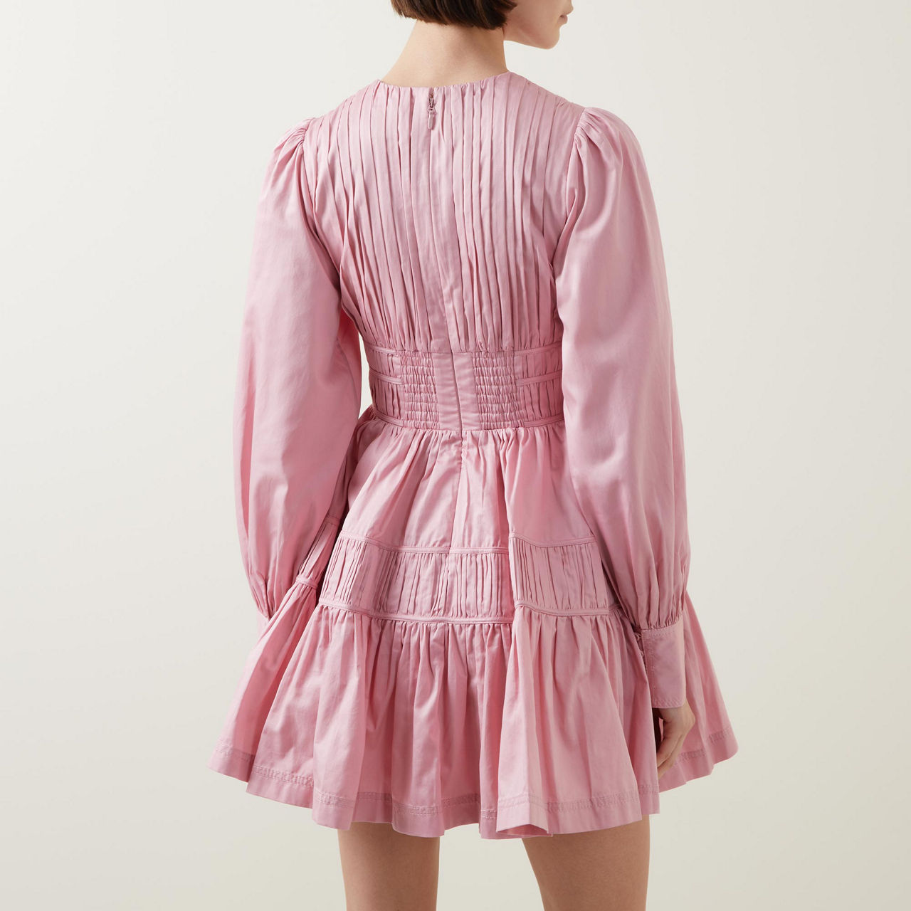 - Deep V-neckline with horizontal strap detail, long blouson sleeves, buttoned cuffs, fitted waist with fixed drawcord panels, zip fastening with hook-and-eye closure, full skirt, two in-seam pockets, lined, mini length