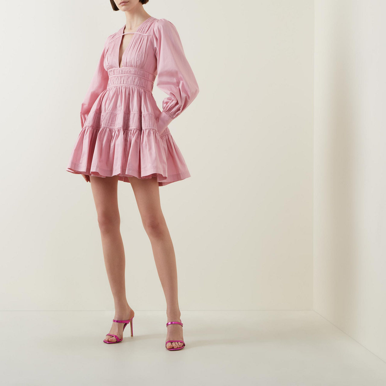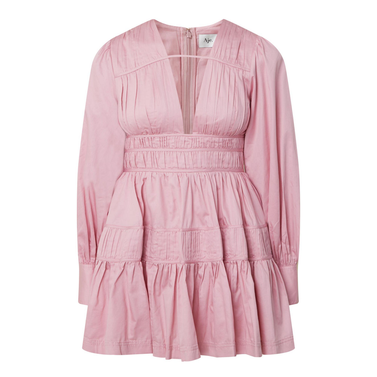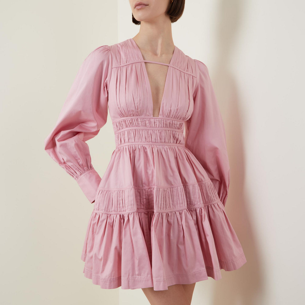 - Deep V-neckline with horizontal strap detail, long blouson sleeves, buttoned cuffs, fitted waist with fixed drawcord panels, zip fastening with hook-and-eye closure, full skirt, two in-seam pockets, lined, mini length