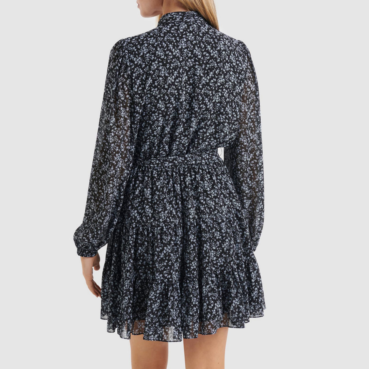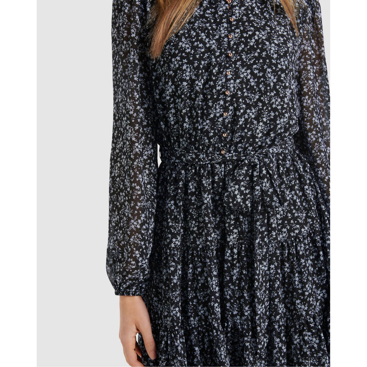 - Long sleeve, high neck, button fastening, belt detail, floral print.