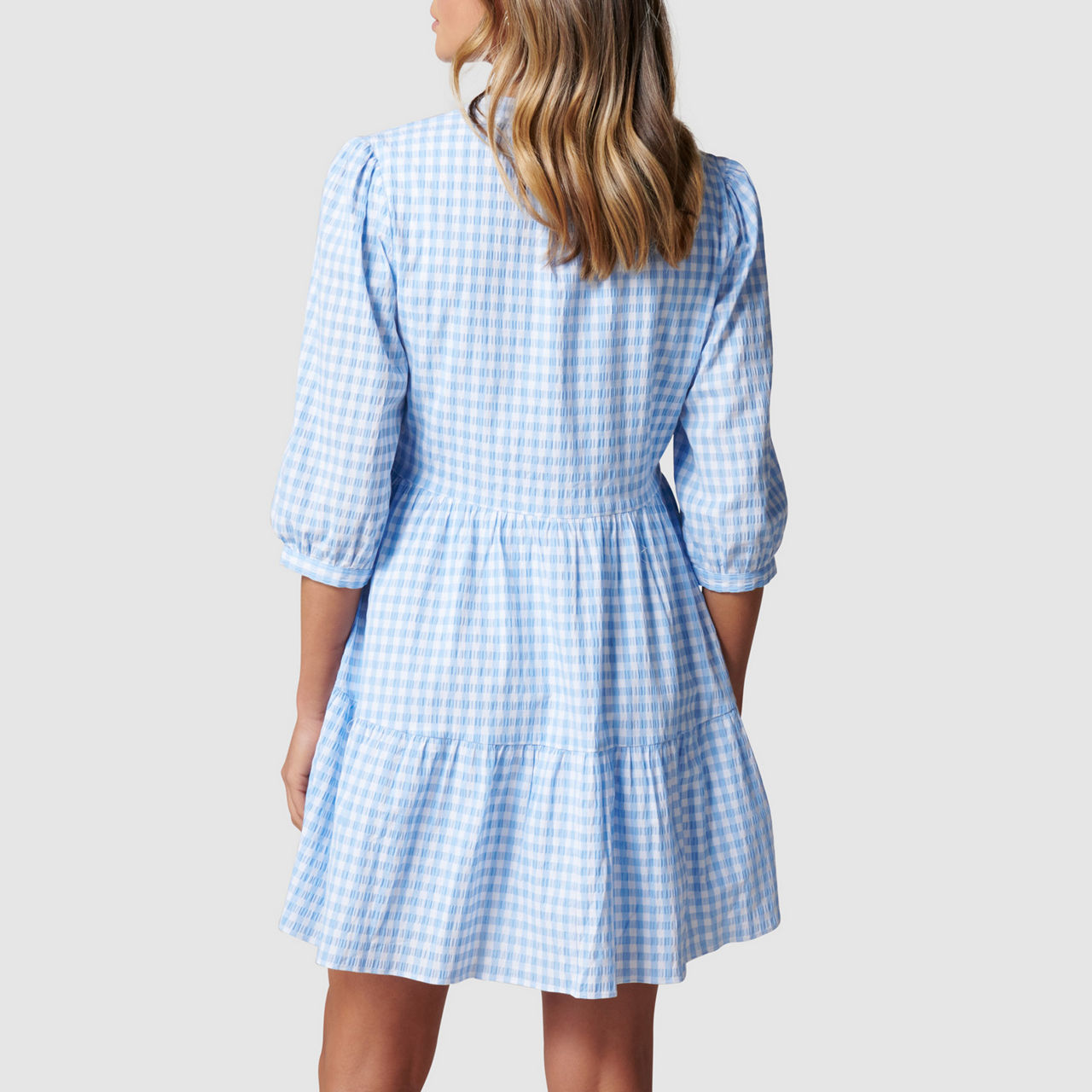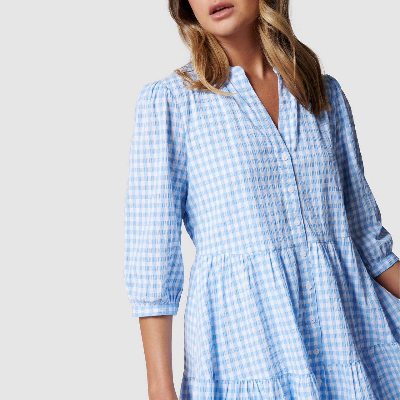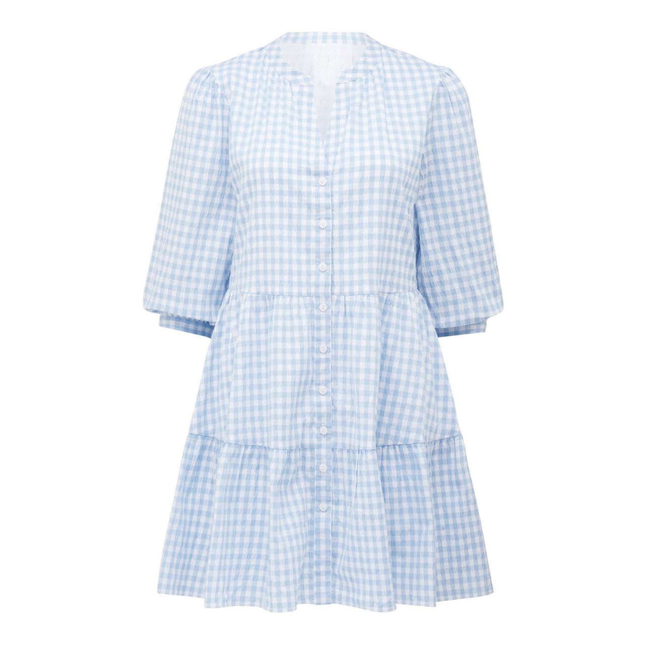 - Relaxed fit, lightweight gingham fabric, round neck with V-placket, button-through design, cropped sleeves with button-up cuffs, tiered hem.