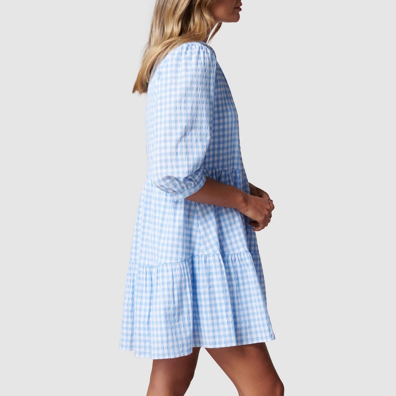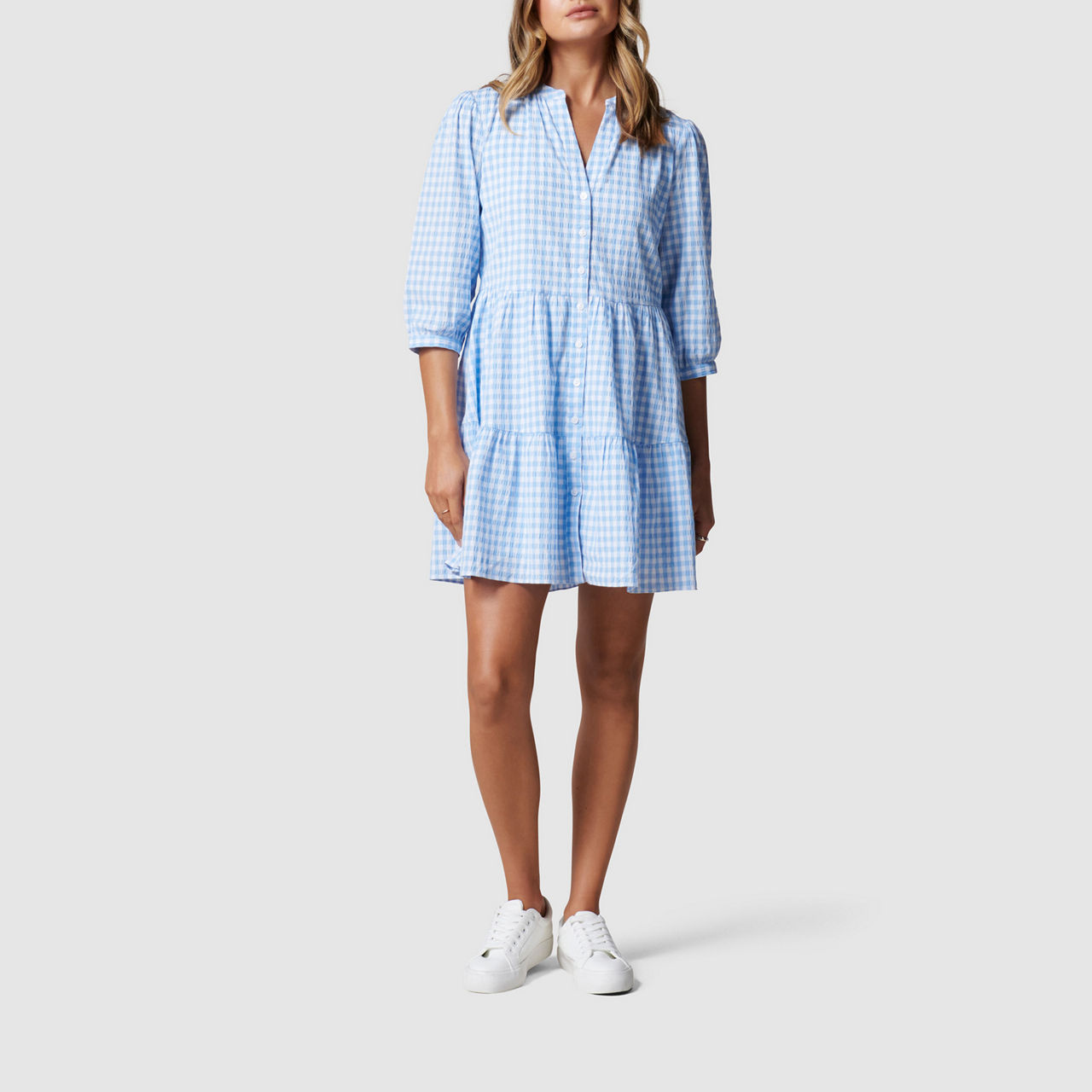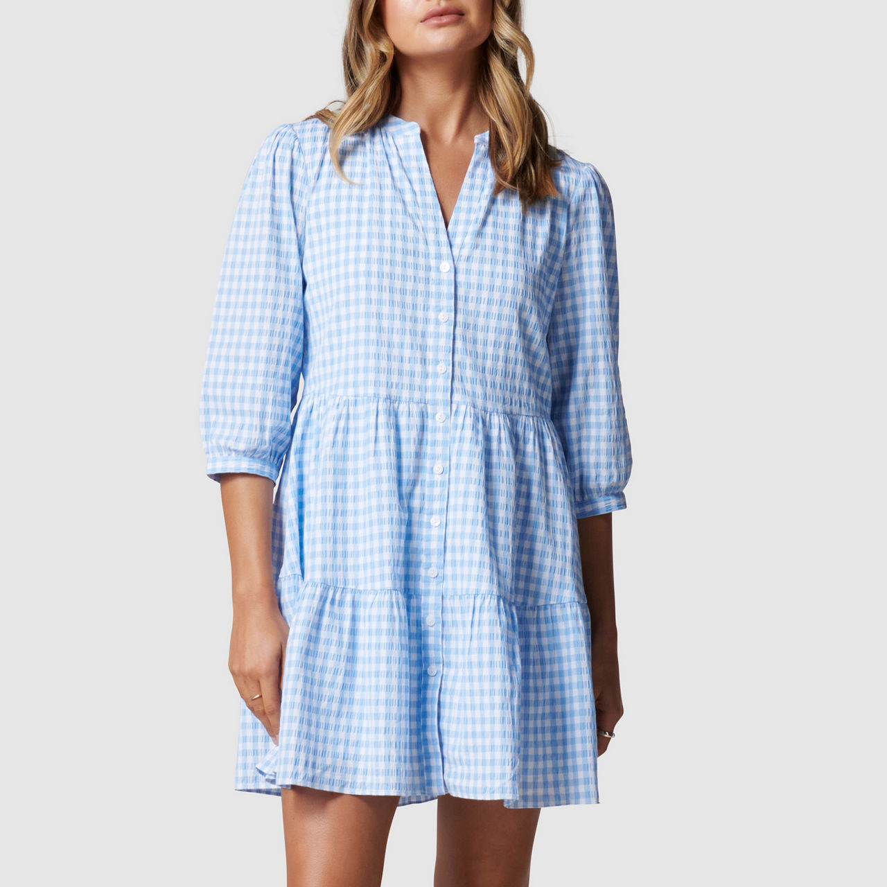 - Relaxed fit, lightweight gingham fabric, round neck with V-placket, button-through design, cropped sleeves with button-up cuffs, tiered hem.
