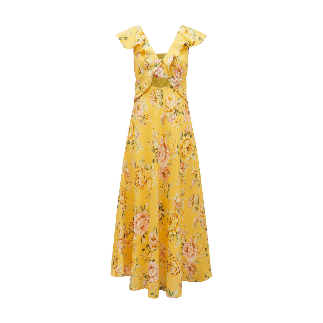 - Flounce trim along neck and over shoulders, cap-sleeve look, twist bodice, floral print, shirred back, lined