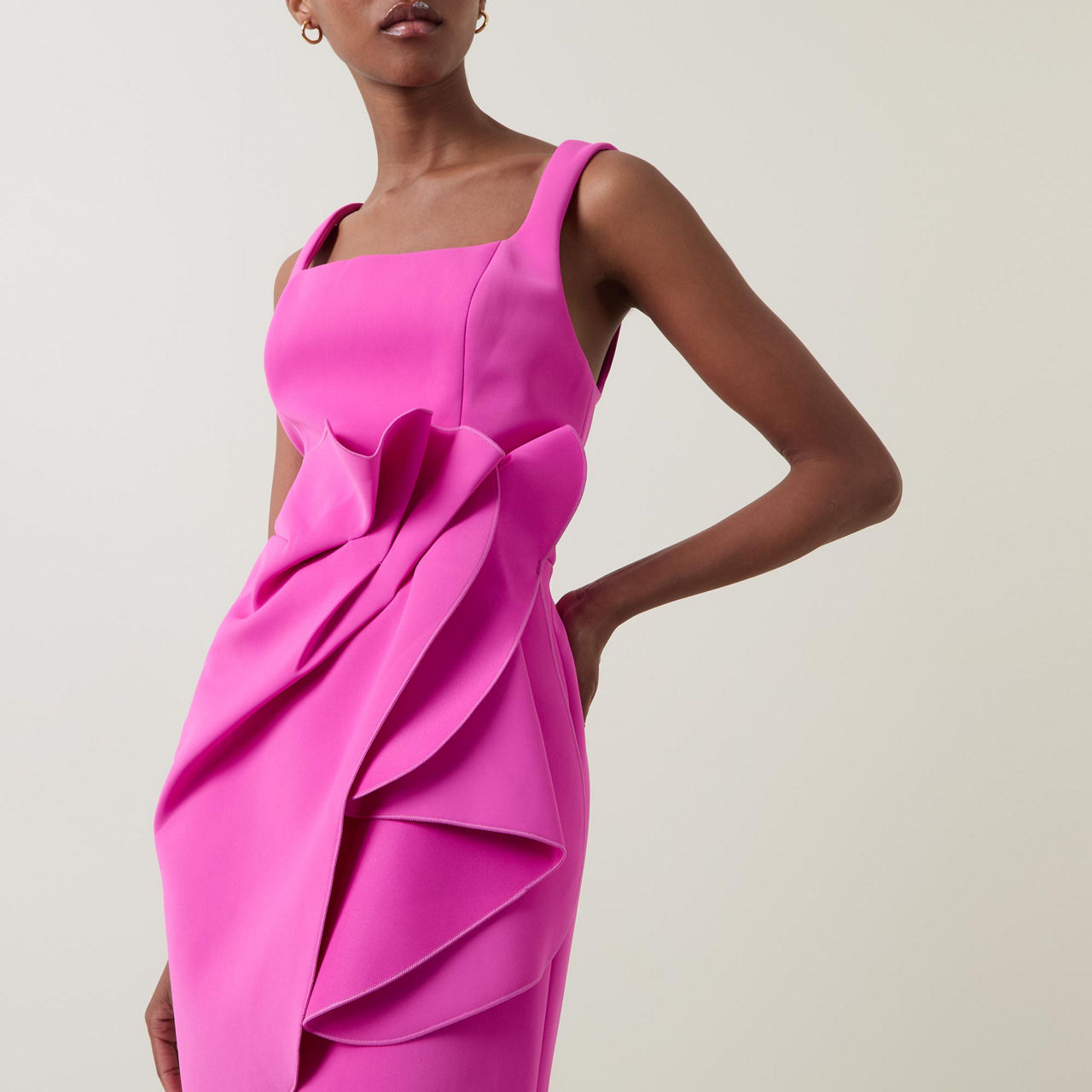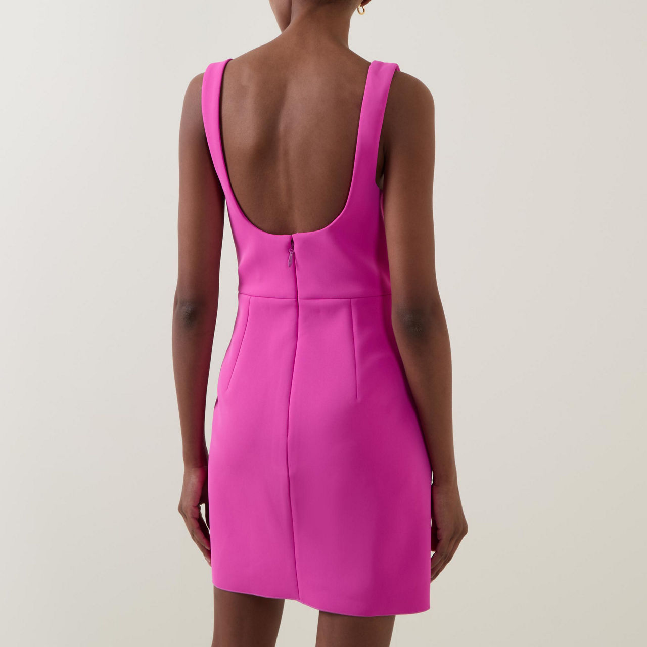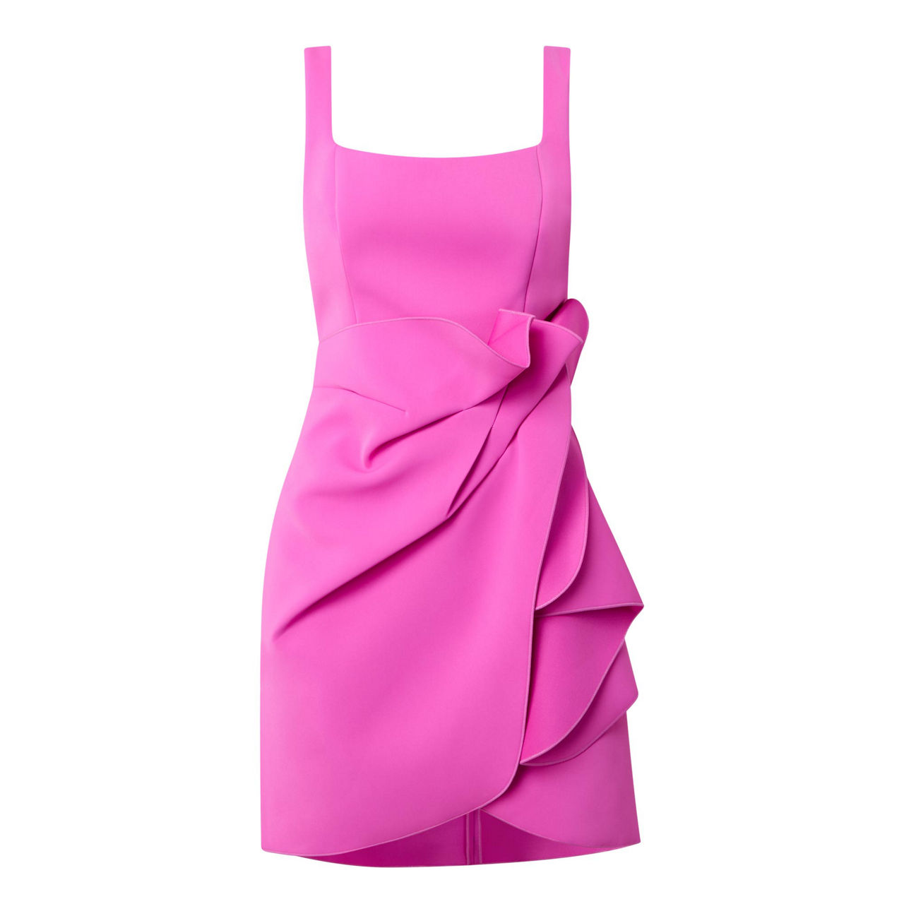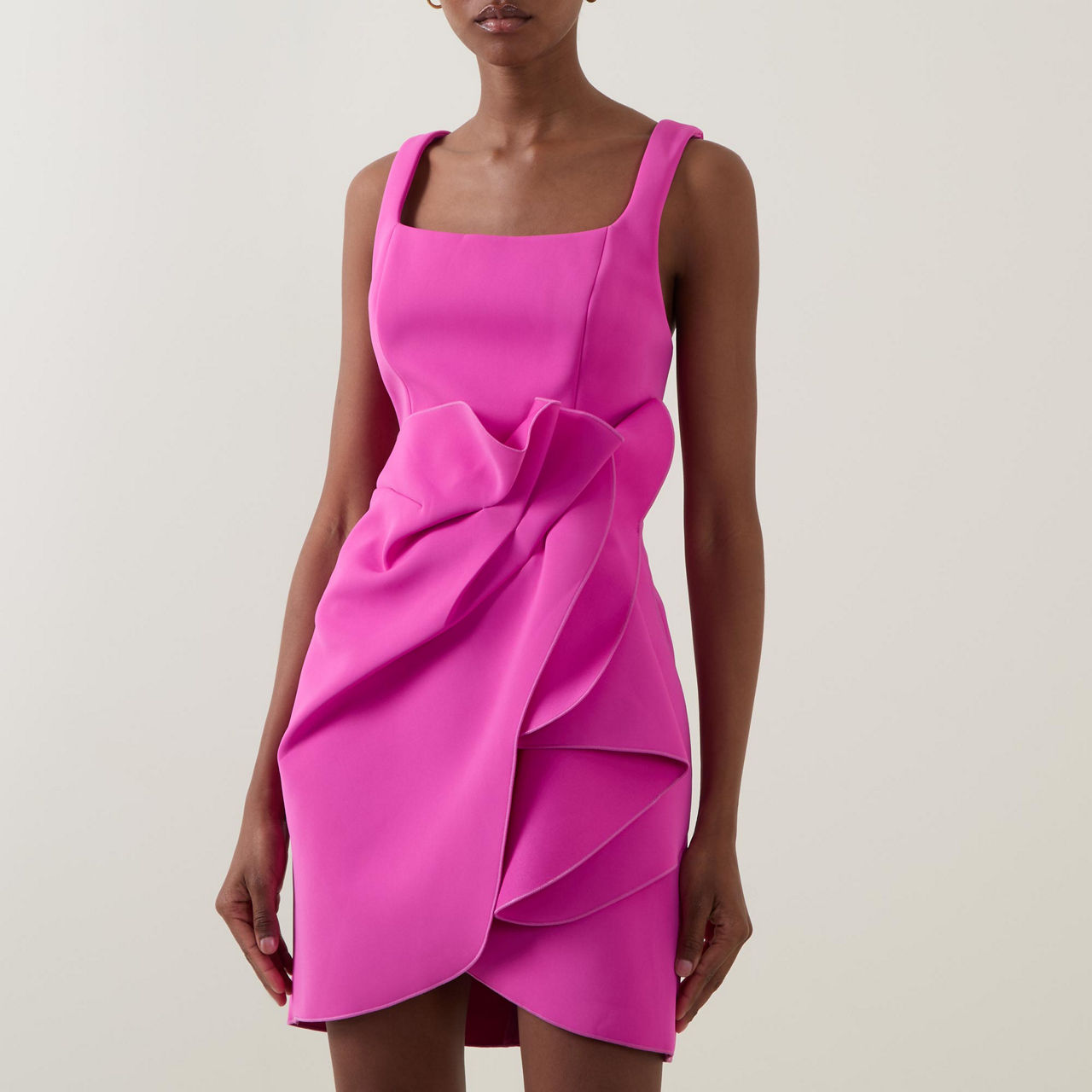 - Square neck, sleeveless, wide fixed straps, rear concealed zip fastening, 3D pin and tuck detailing at the hip, textured gathered design, mini length, bonded fabric