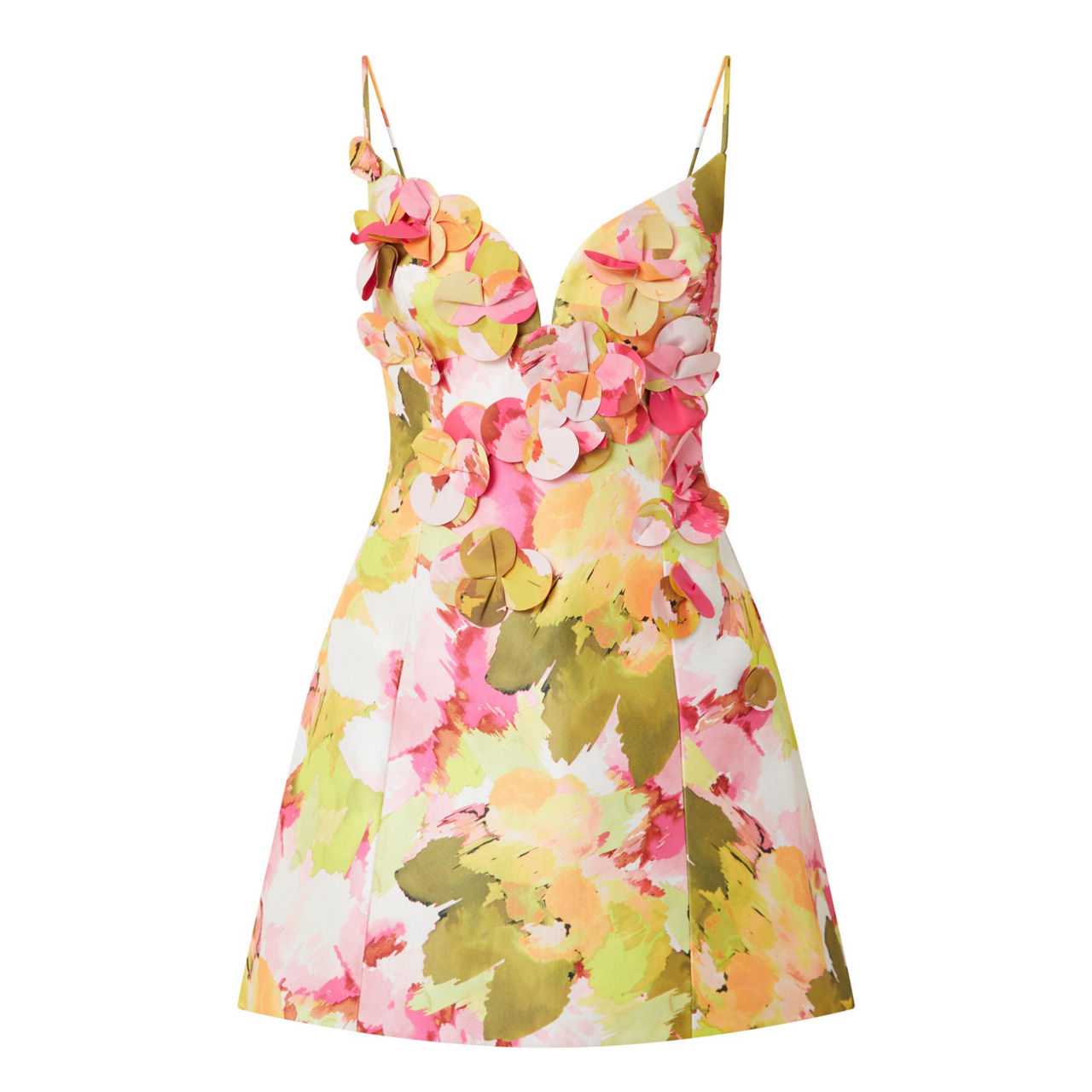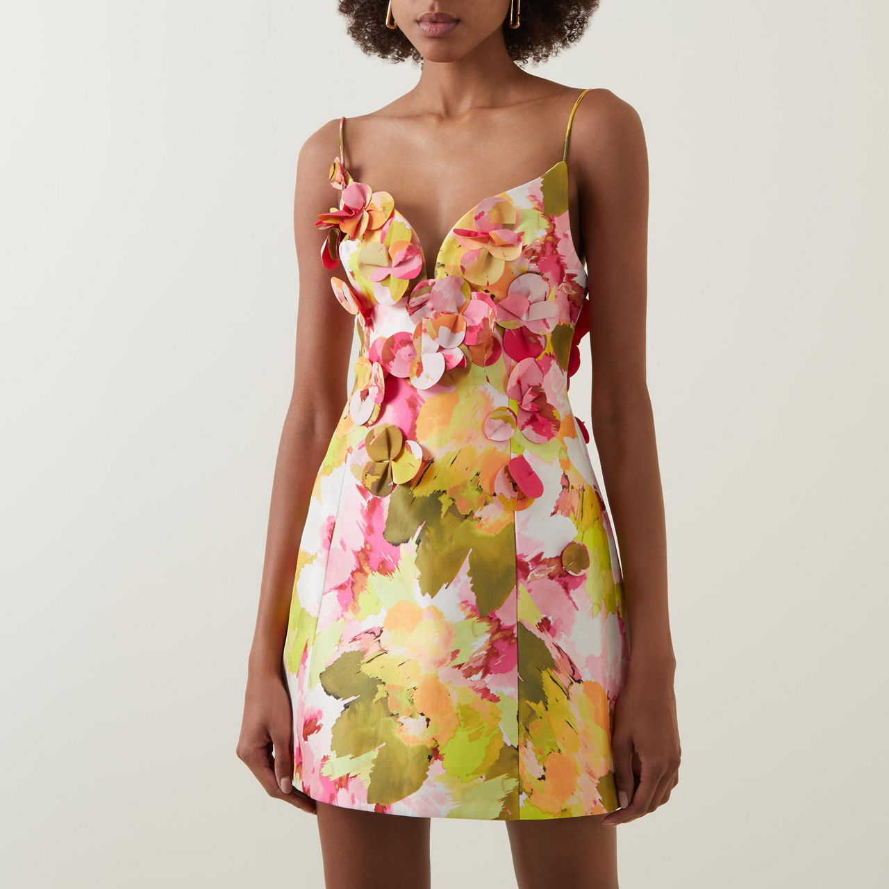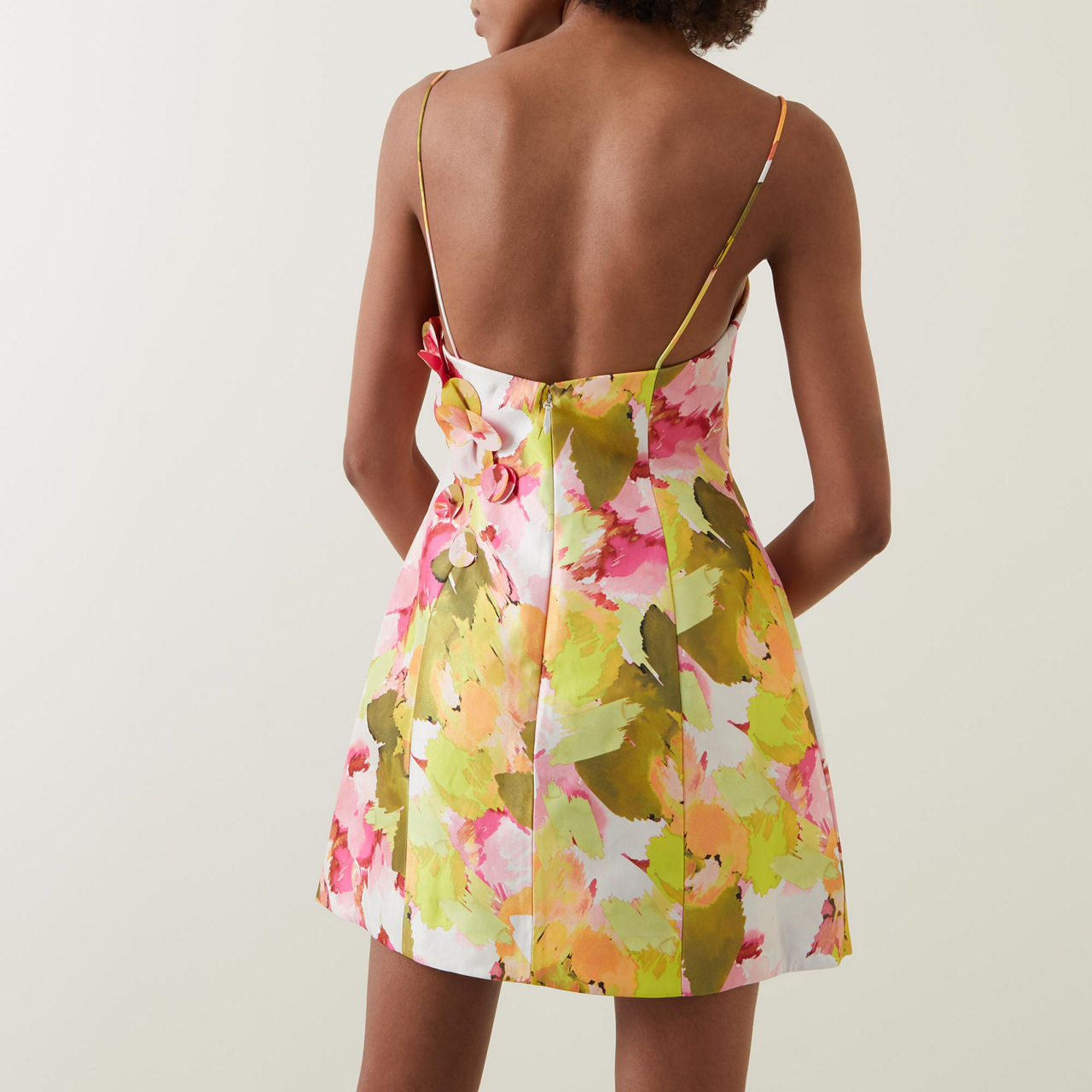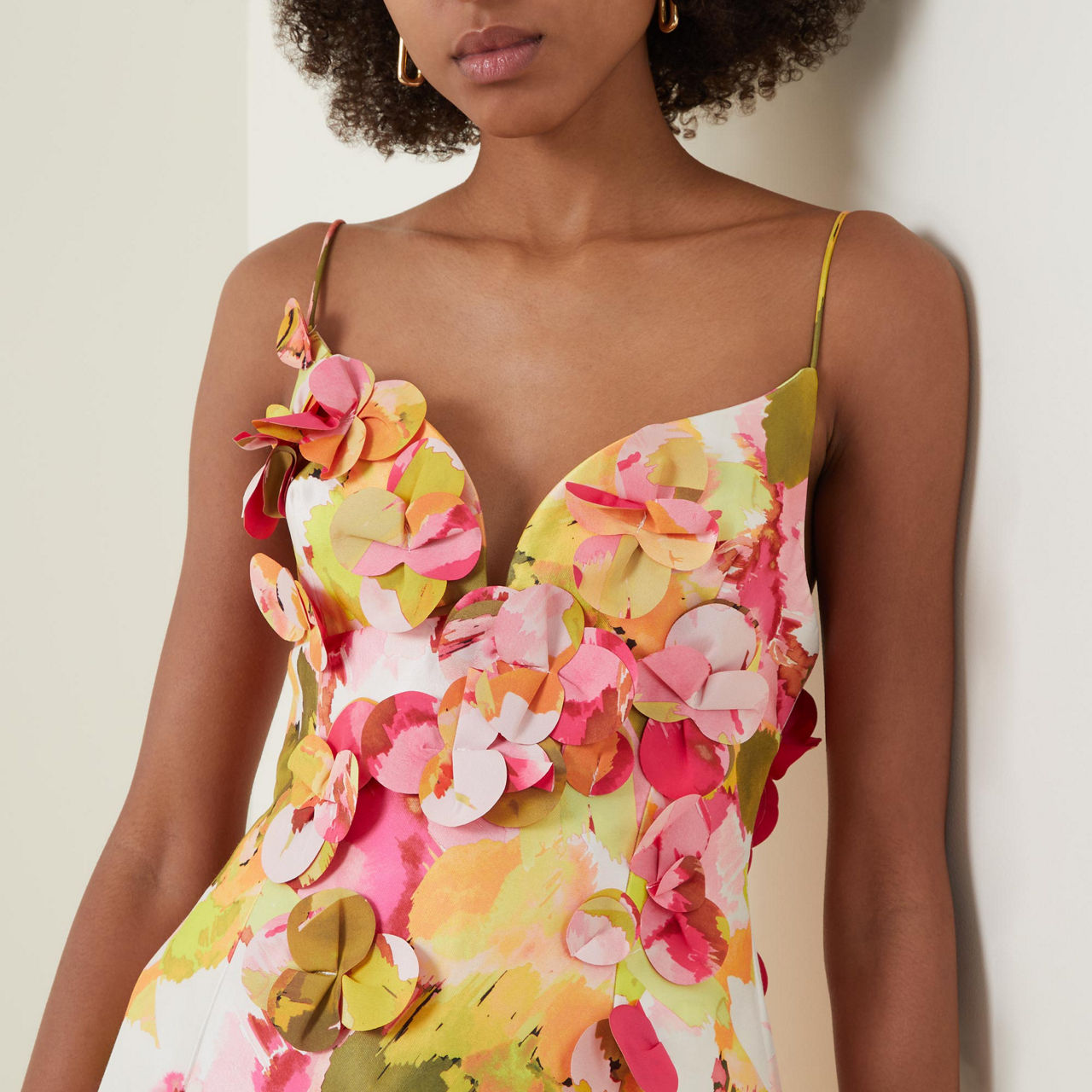 - Sweetheart neckline, fixed straps, petal detailing across the bodice, rear zip fastening, fitted through the waist, flared skirt, all-over abstract floral print, mini length