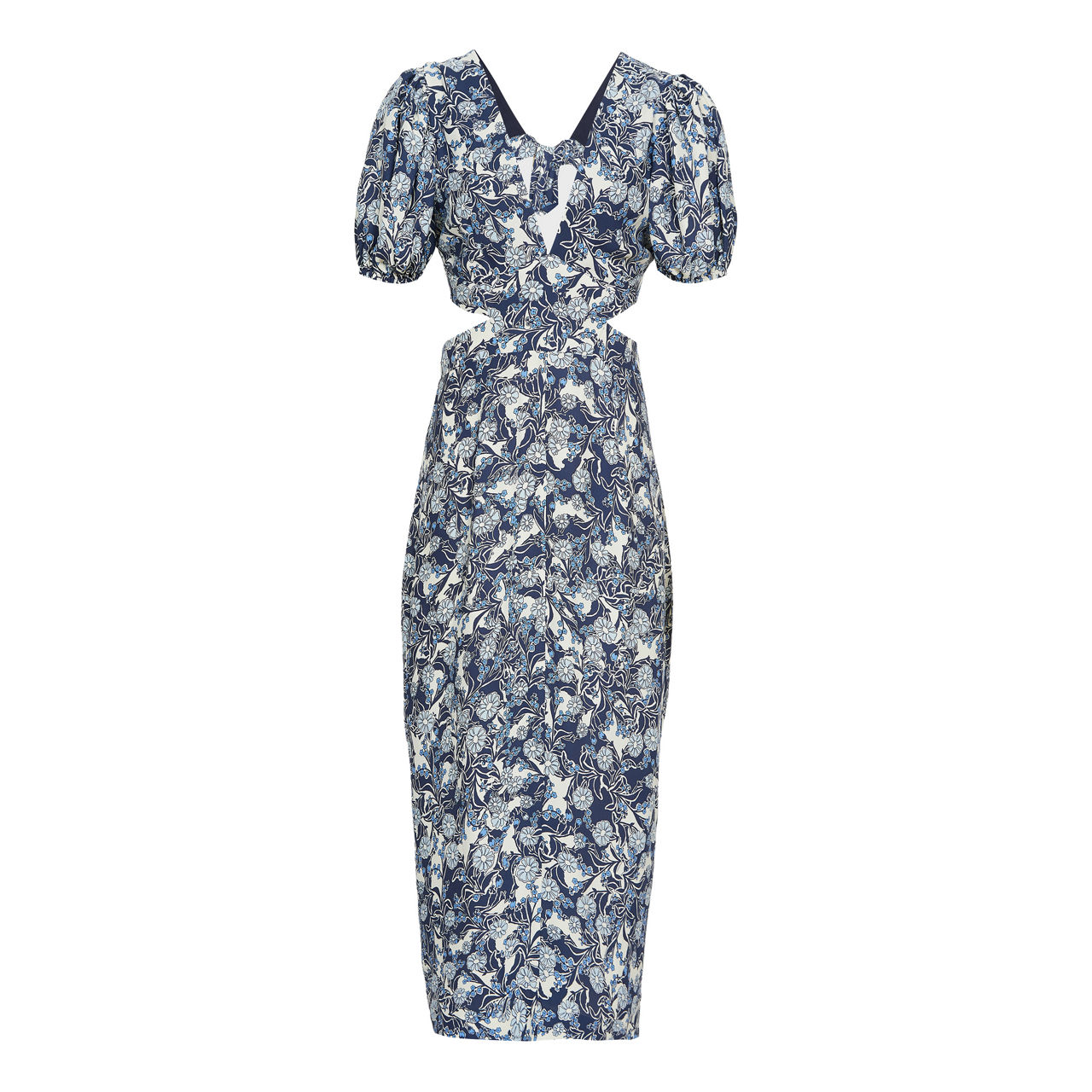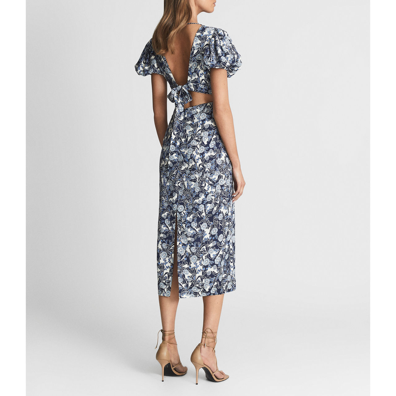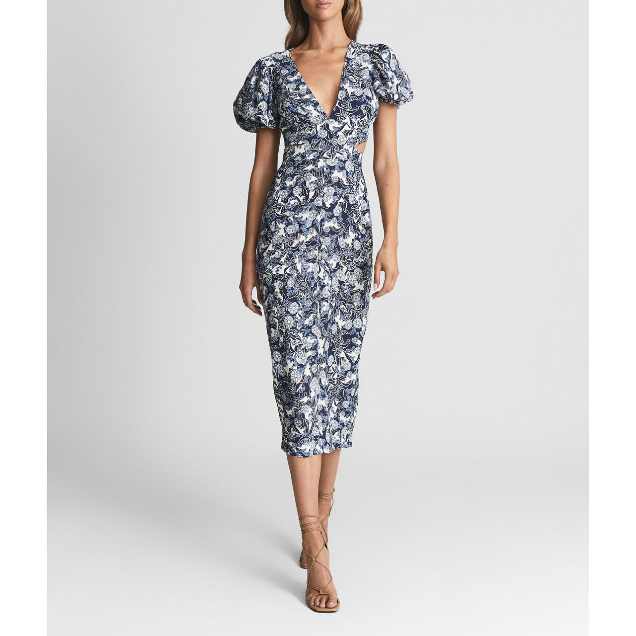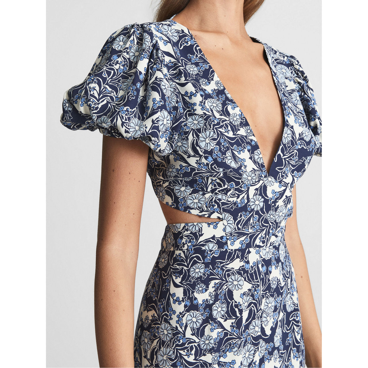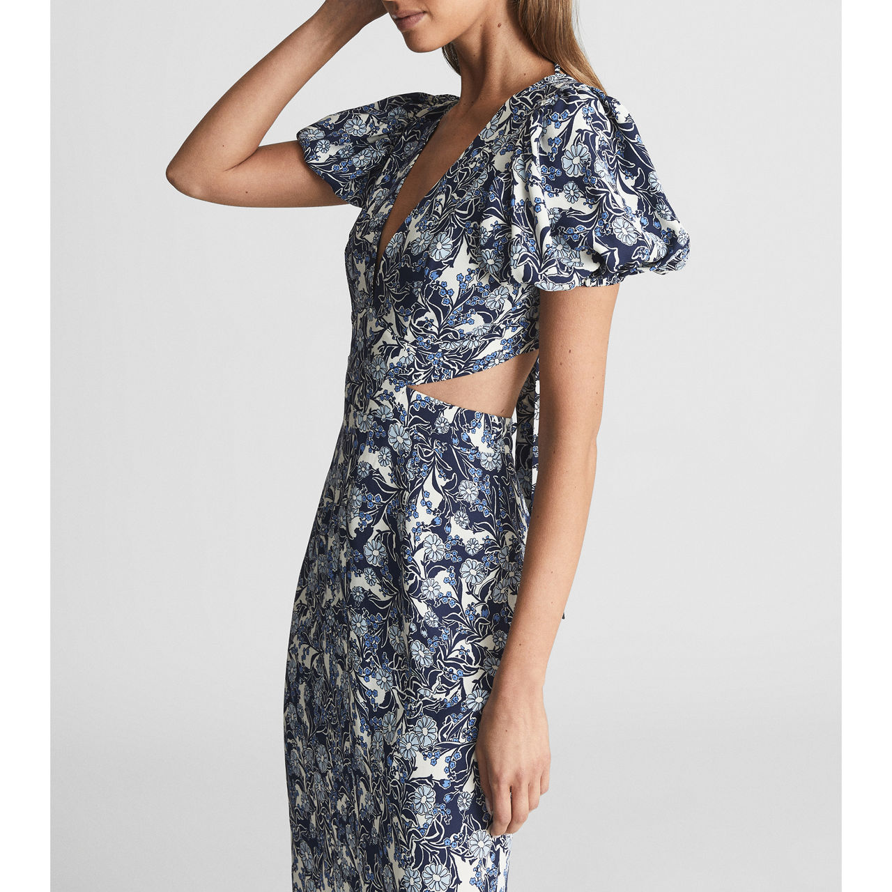 Reiss' printed Jennah dress skims the figure with cut-out detailing for a contemporary take on the midi-length style. An alluring V-neckline is balanced by short puff sleeves, while the abstract print gives this sleek style a more intriguing finish.