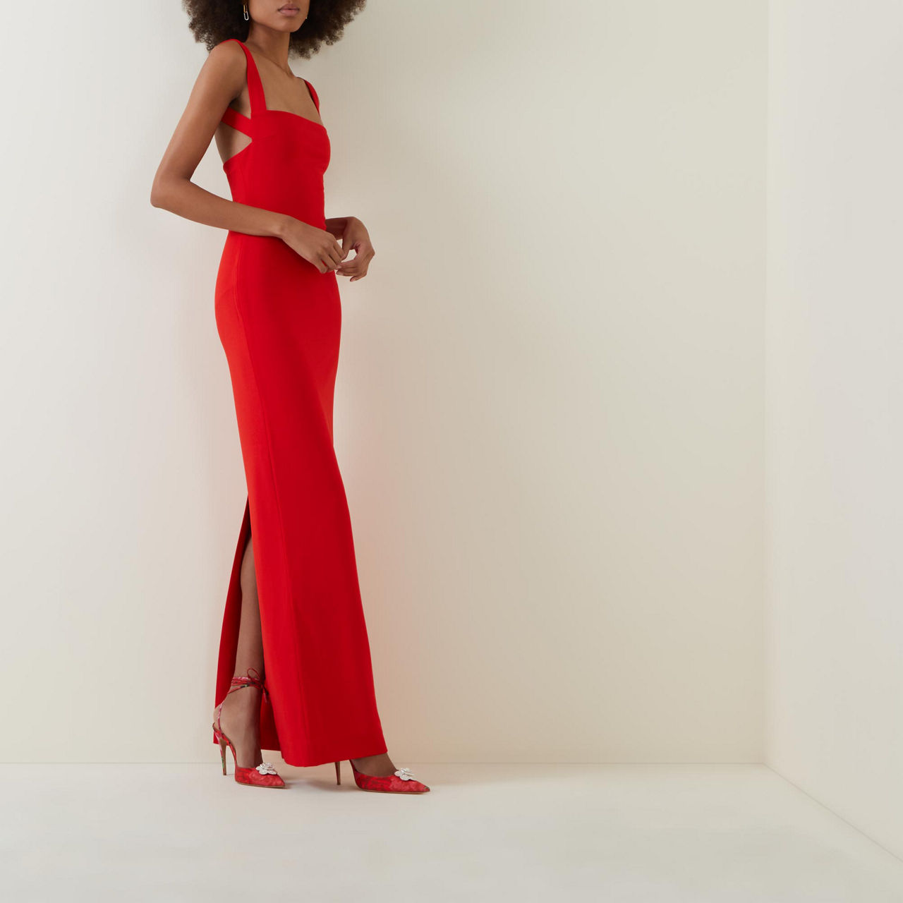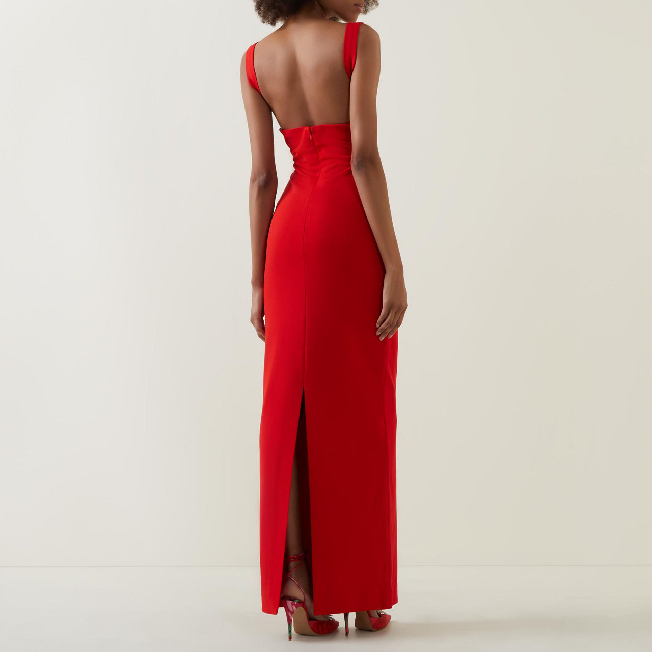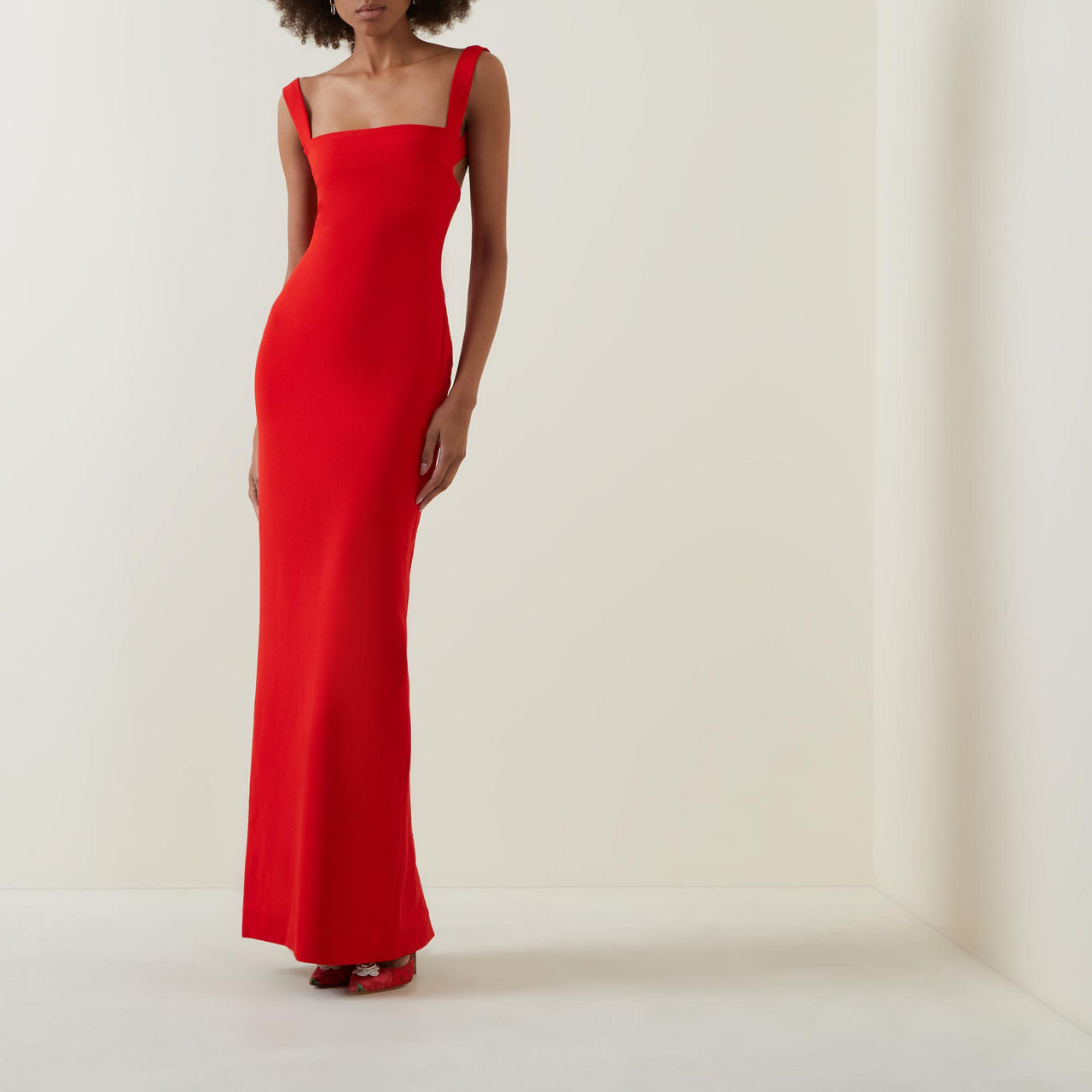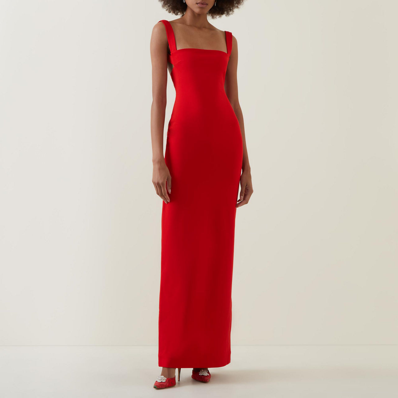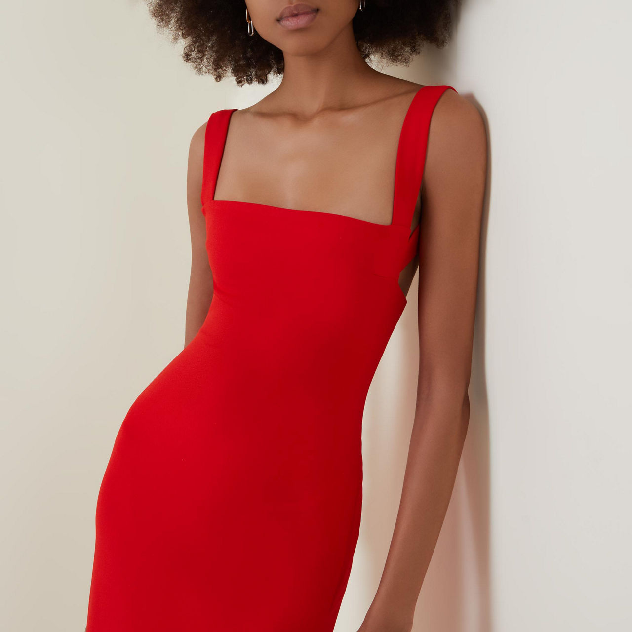 - Sleeveless, wise straps, square neckline, back zip-fastening closure, slit to the back, smooth fabric