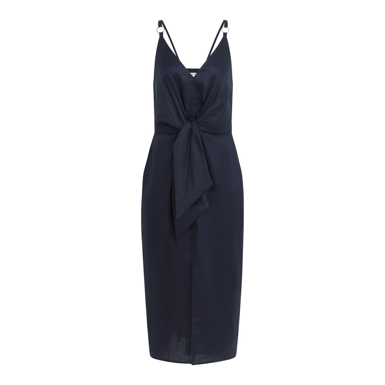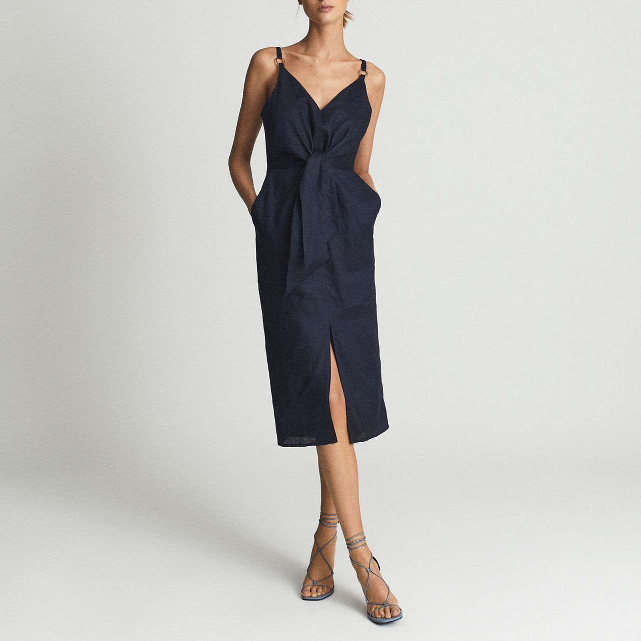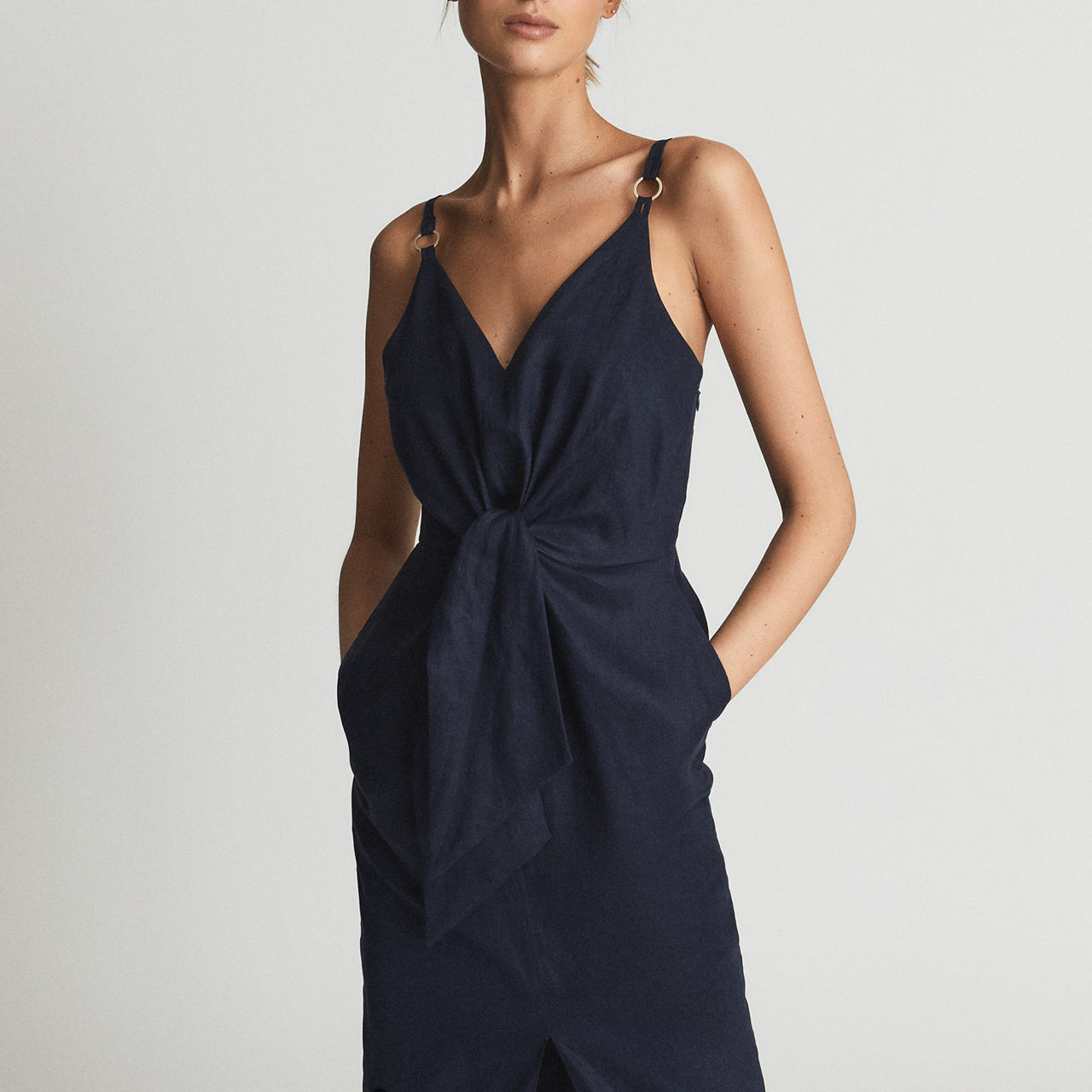 - V neckline, slim straps, tie detail to waist, slim bodice, midi length, pockets.