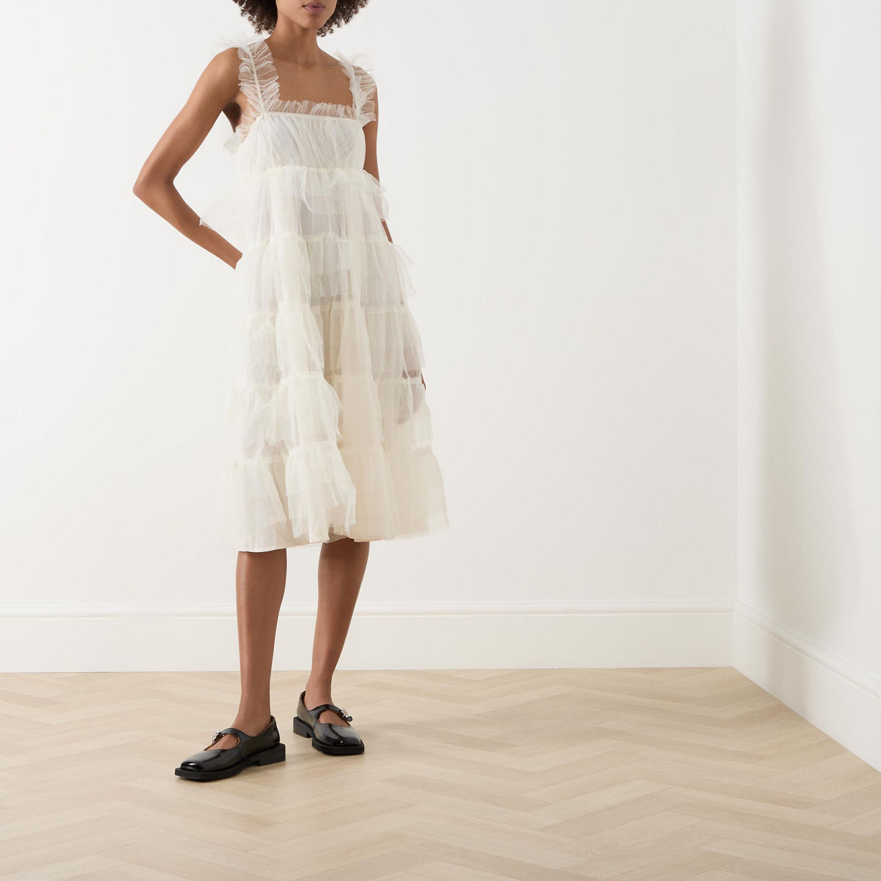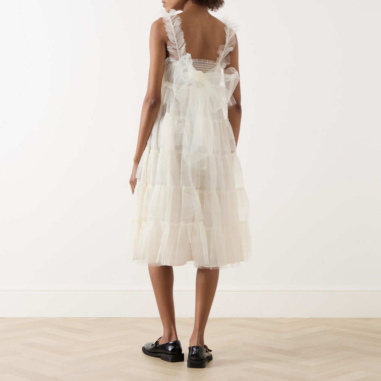 - Straight neckline, narrow straps with tulle detailing, rear smocked design, rear tulle bow-tie fastening, tiered skirt, semi-sheer design, midi length, lined