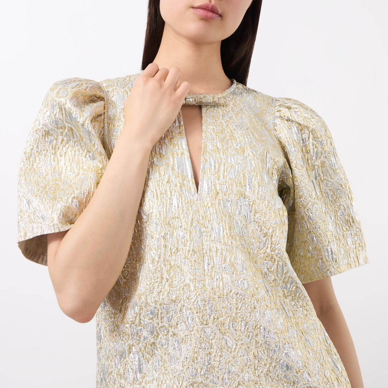 - Metallic finish, keyhole neckline, decorative bow detail, short puff sleeves, A-line silhouette, mini length, zip fastening
