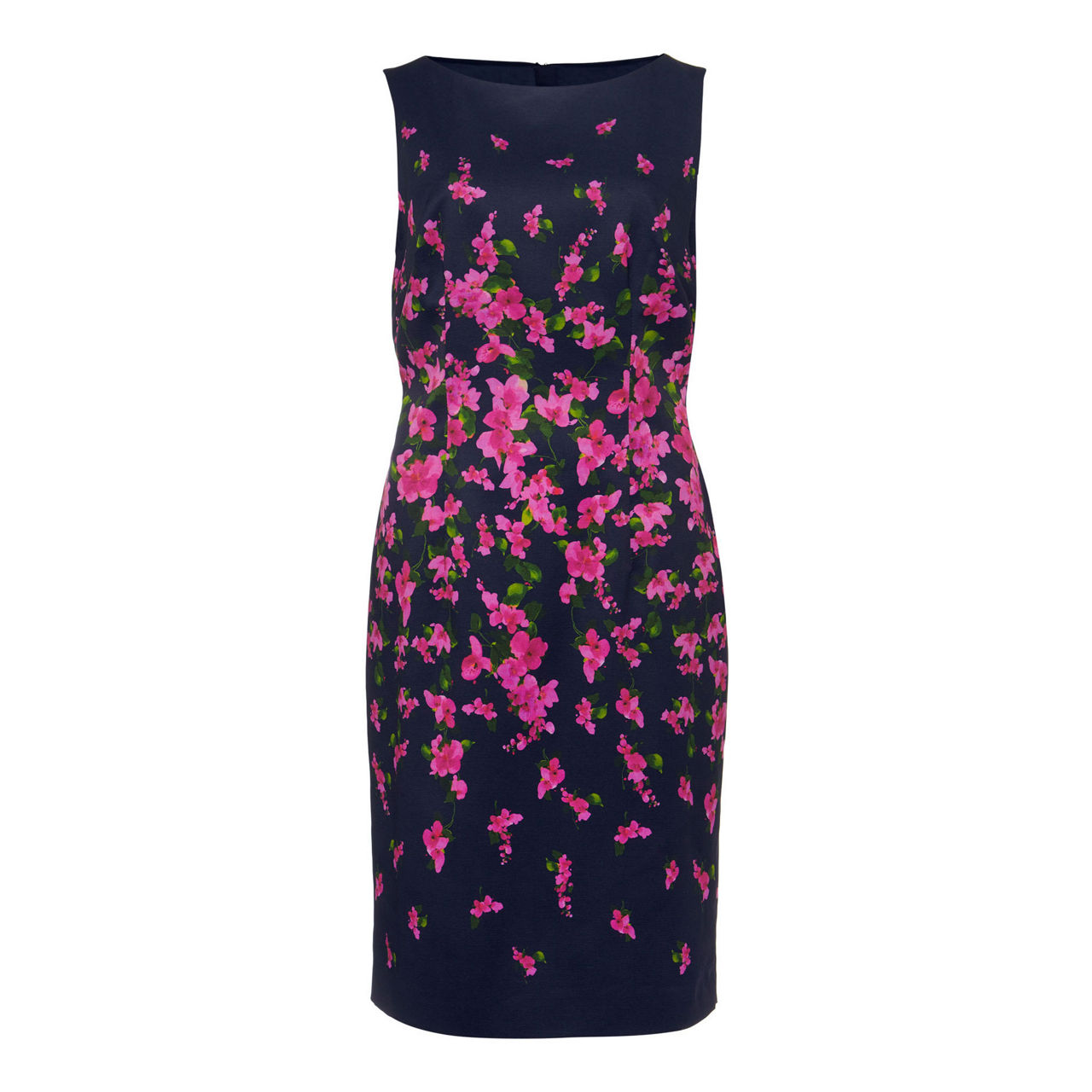 - Sleeveless, knee length, zip closure, floral print, fully lined.
