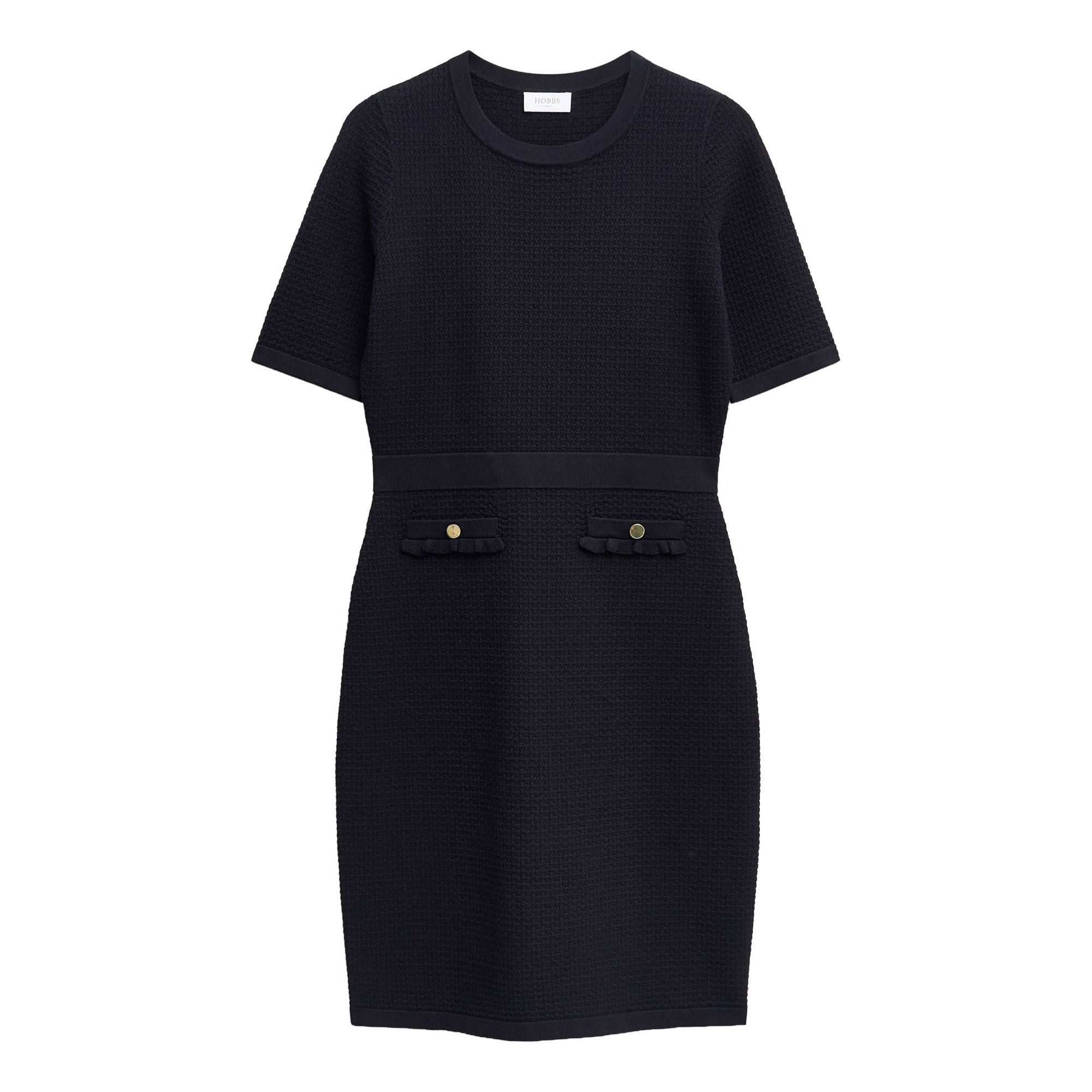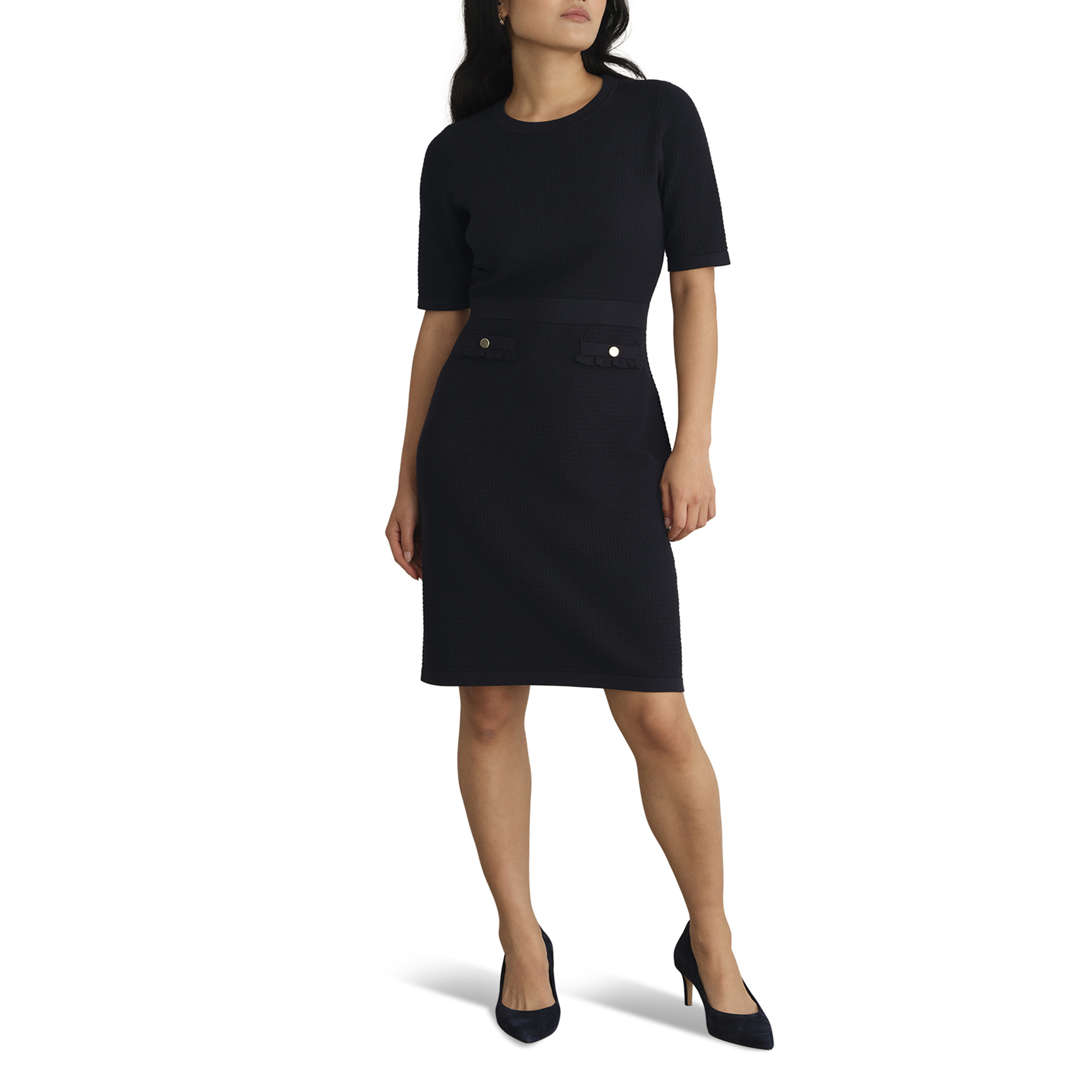 - Knitted, textured finish, shift silhouette, waistband, frill pocket details, crew neckline, short sleeves