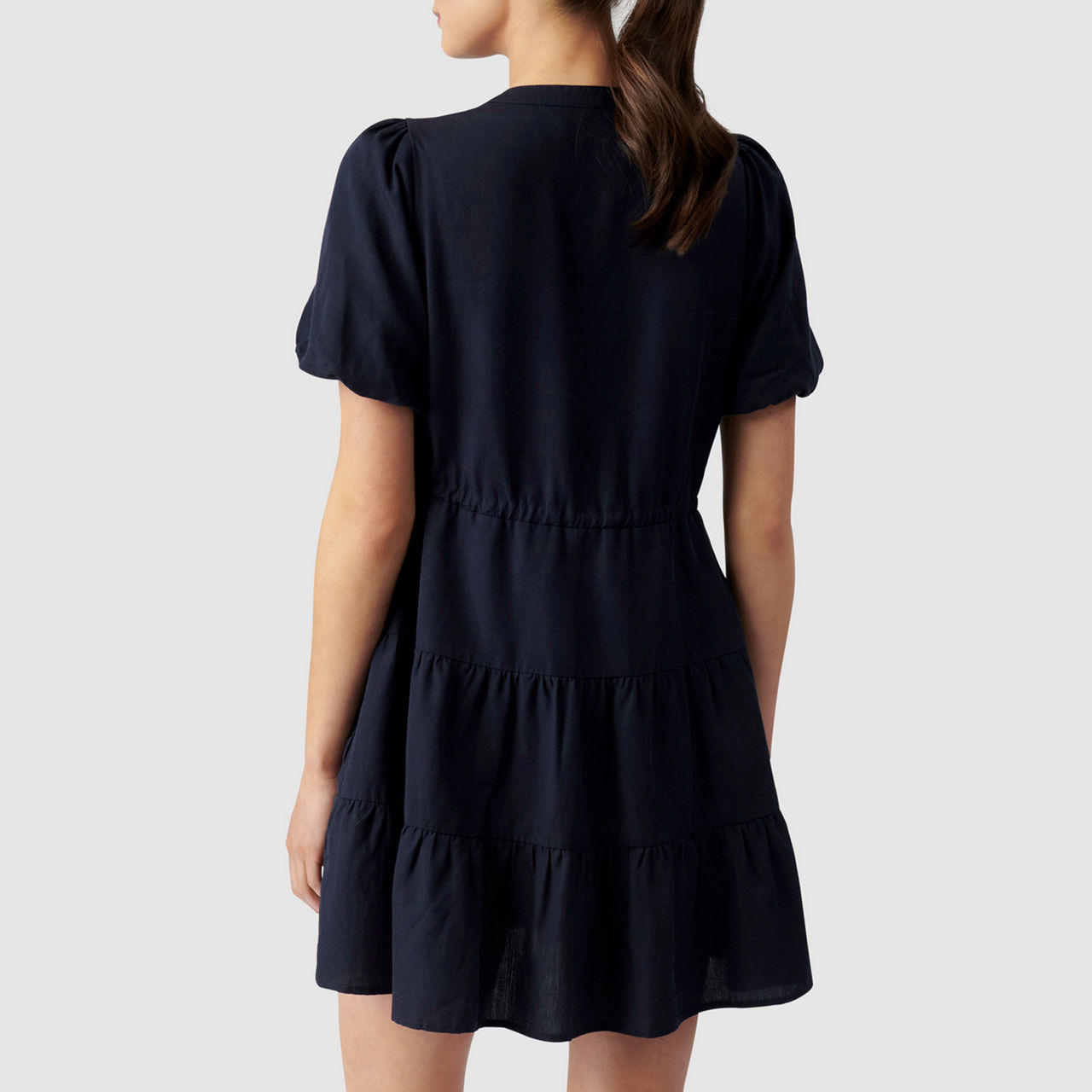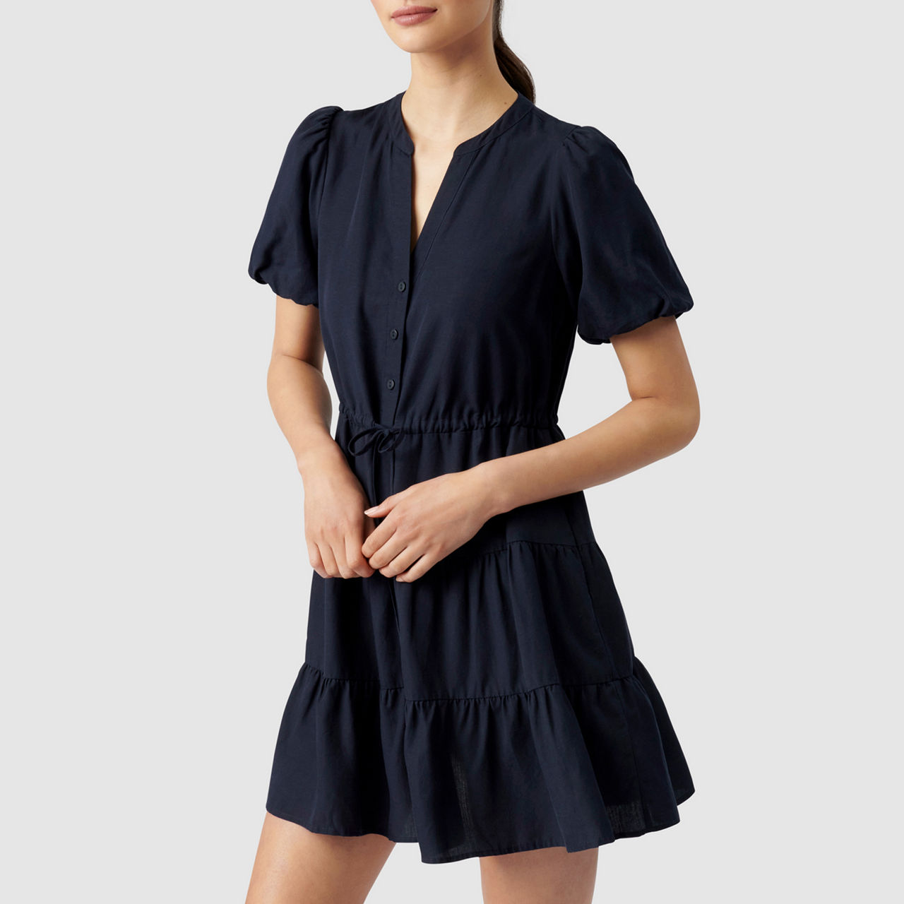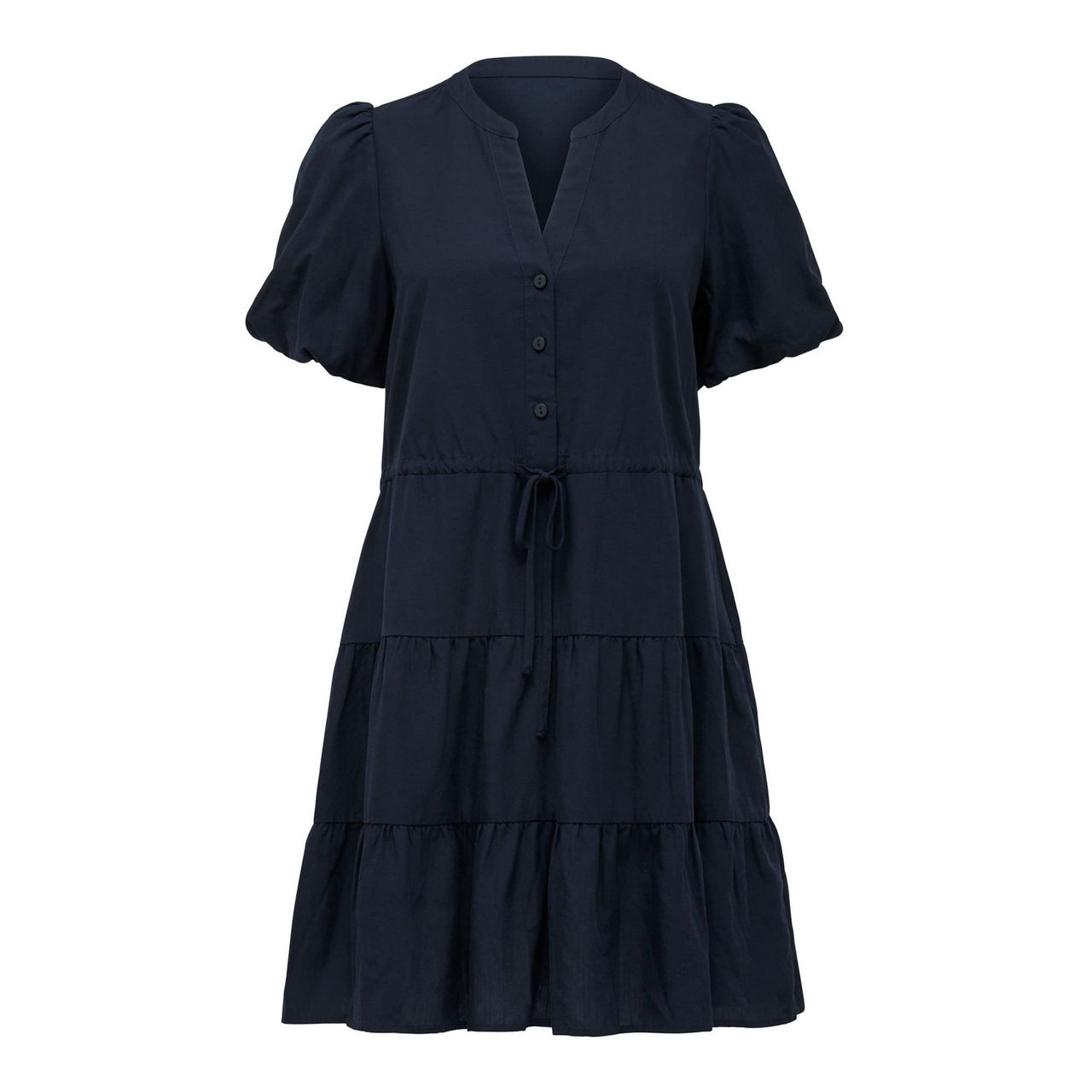 - Placket neckline with rounded collar, short puff sleeves, front button fastening, drawstring waist tie, tiered skirt, slip-on style, lined.