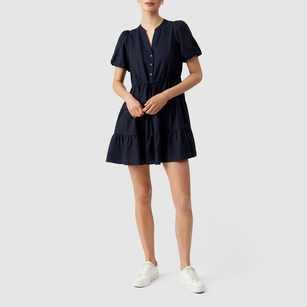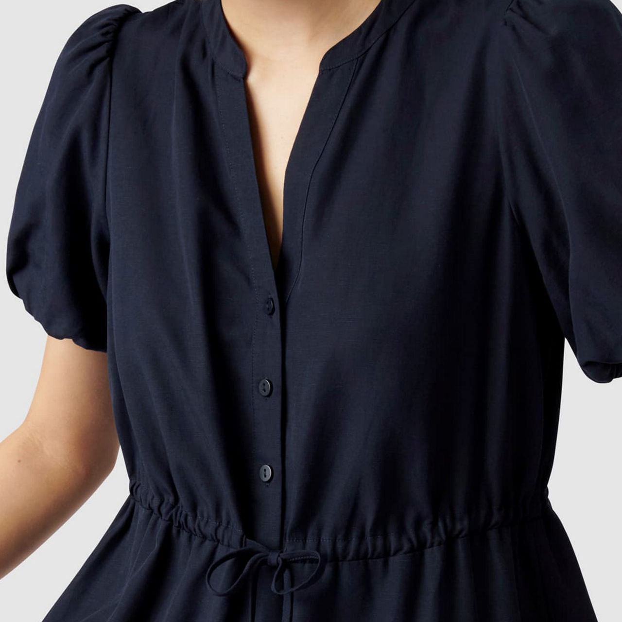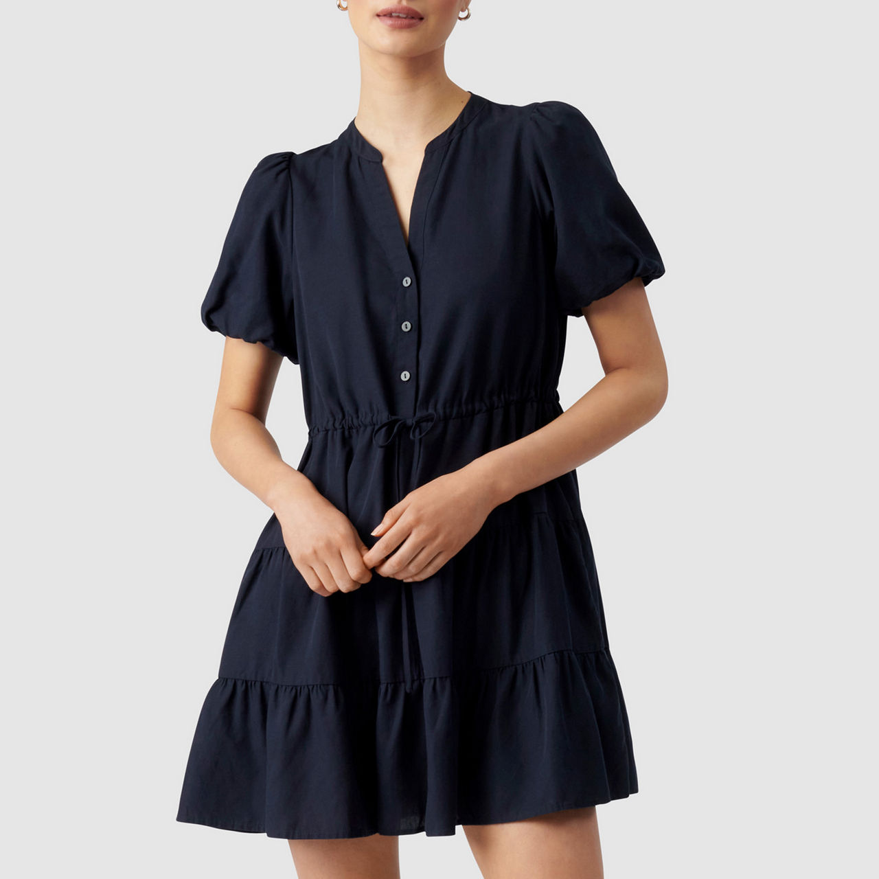 - Placket neckline with rounded collar, short puff sleeves, front button fastening, drawstring waist tie, tiered skirt, slip-on style, lined.