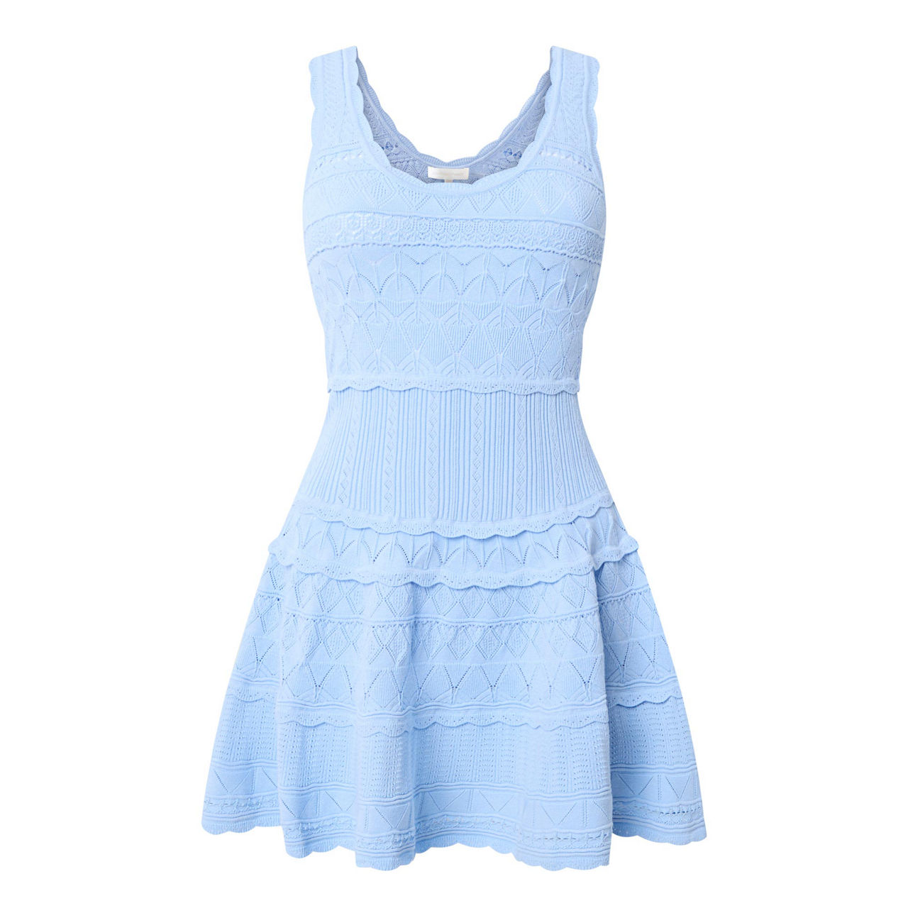 - Sleeveless, wide straps, scooped neckline, scooped back, flared silhouette, knitted finish