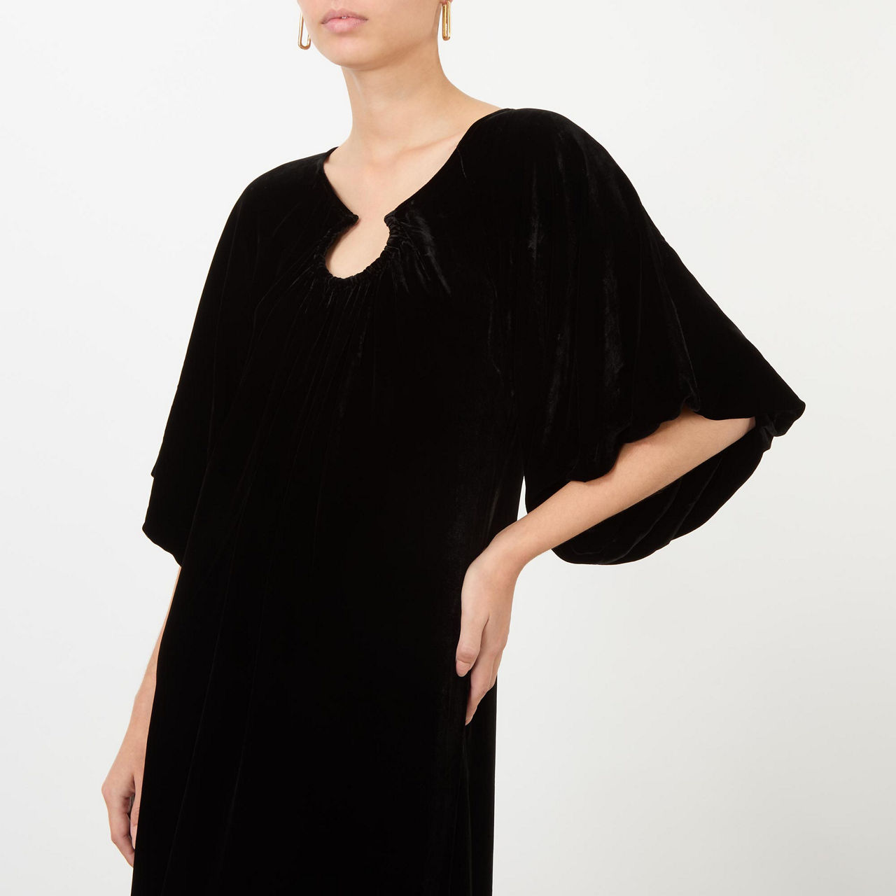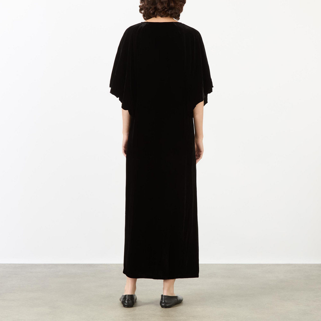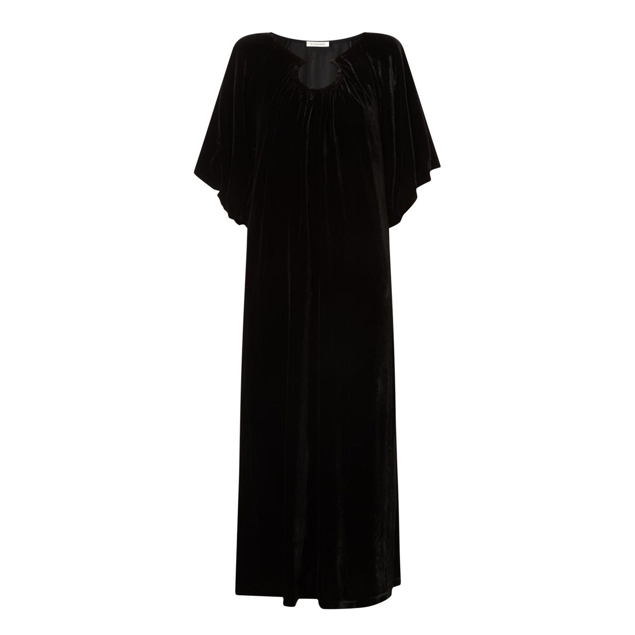 - Adjustable neckline, short flutter sleeves, straight hem, midi length, velvet finish