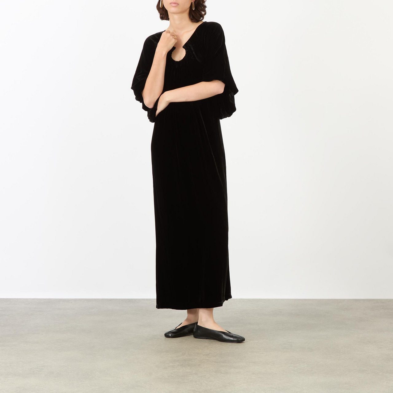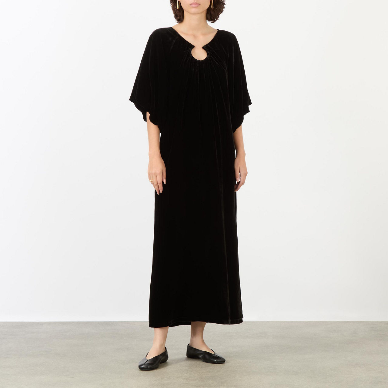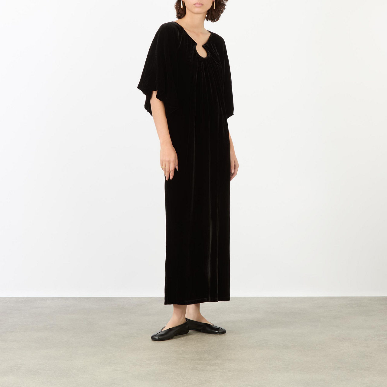 - Adjustable neckline, short flutter sleeves, straight hem, midi length, velvet finish