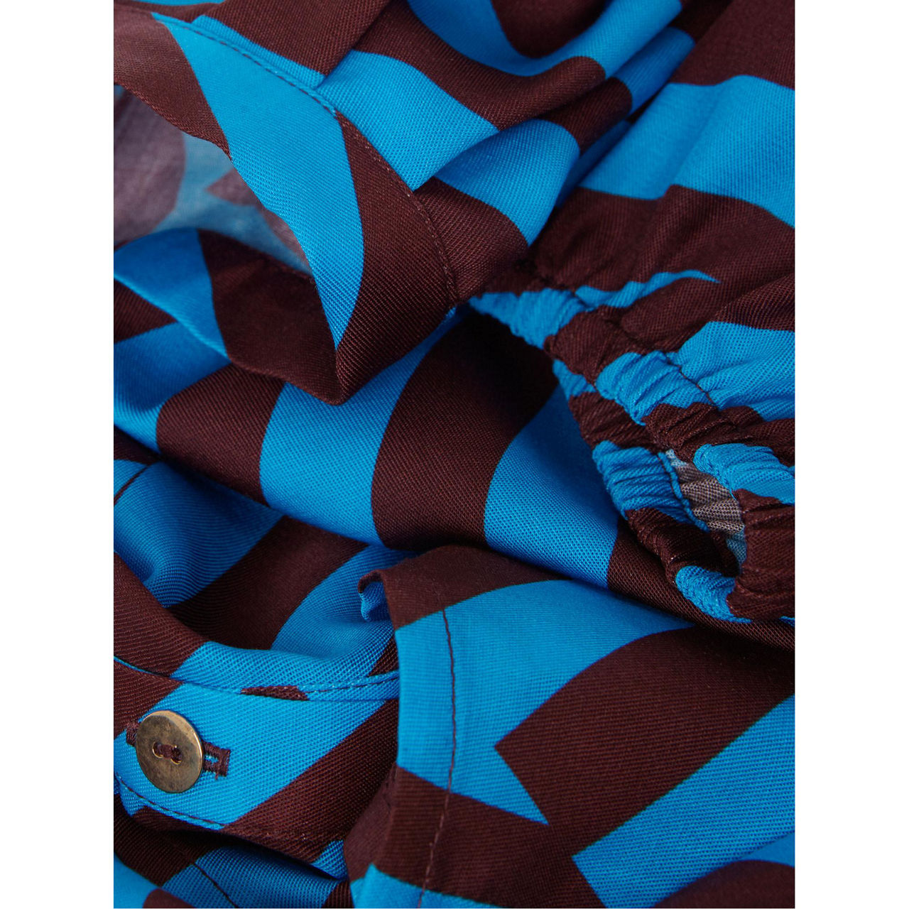- Short blouson sleeves, round neck, button fastening, waist tie detail, stripe pattern