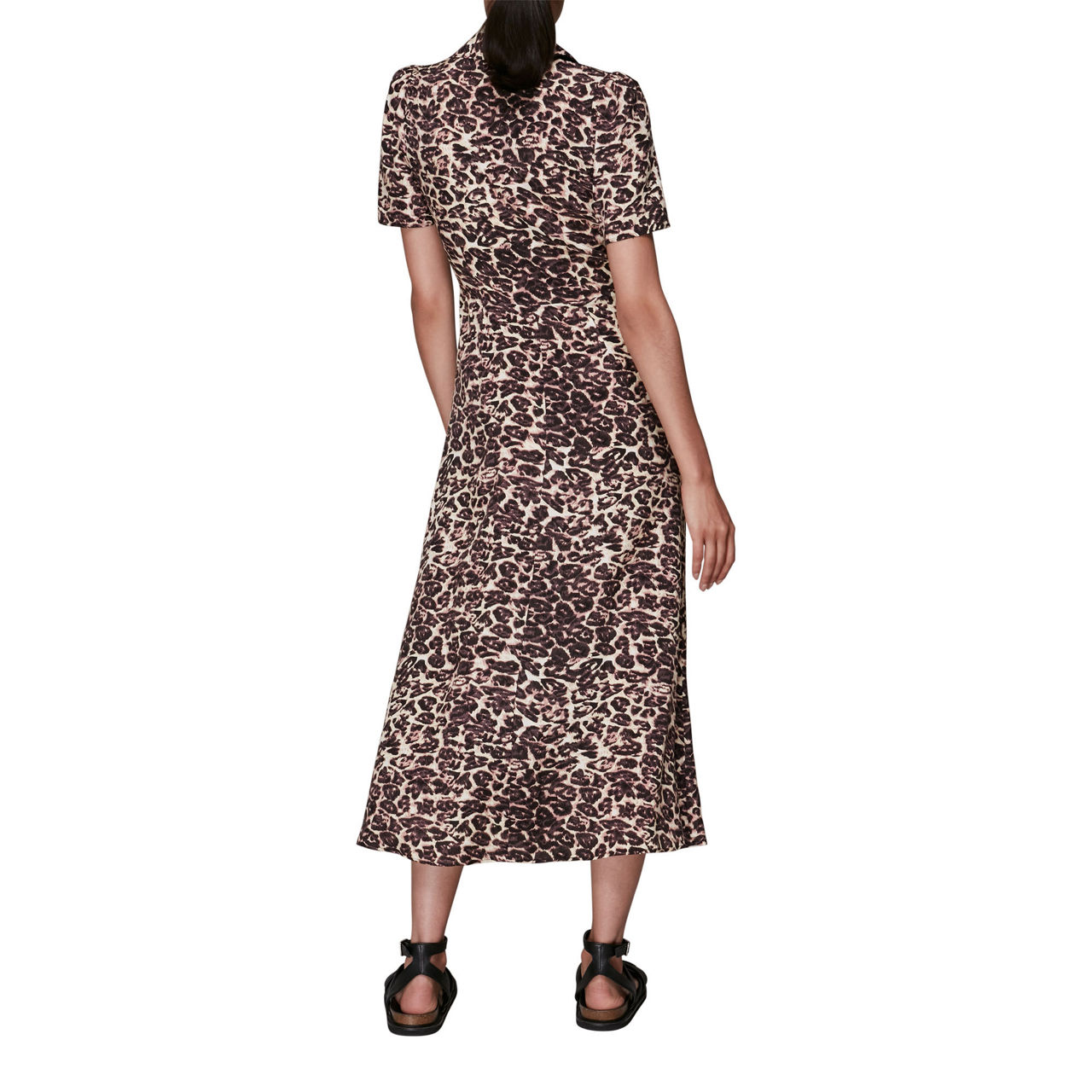 - Midi length, short sleeves, V-neck, collar, leopard print.
