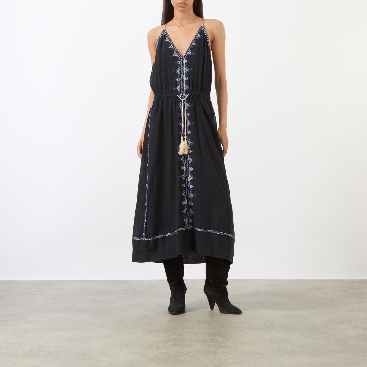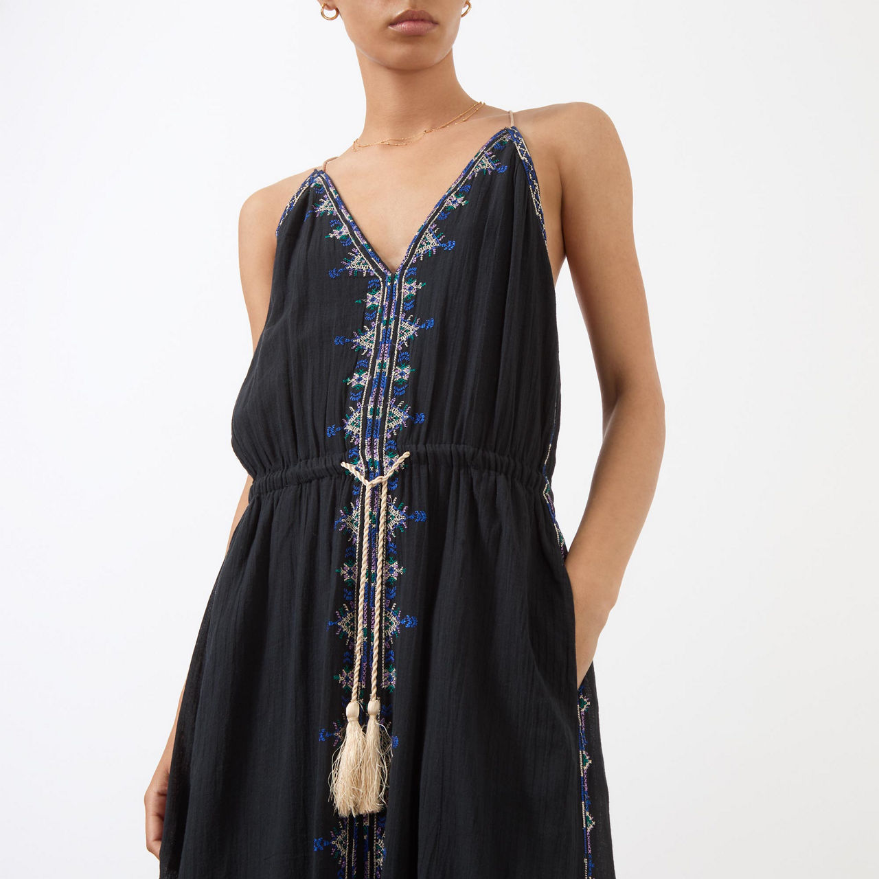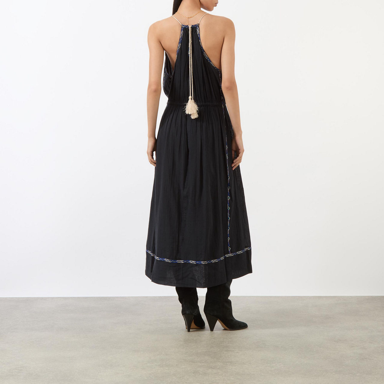 - Sleeveless, plunging V-neckline, adjustable halter-neckline, embroidered detailing, adjustable tie-fastening waist with tassel details, slit pockets, flared silhouette, smooth fabric