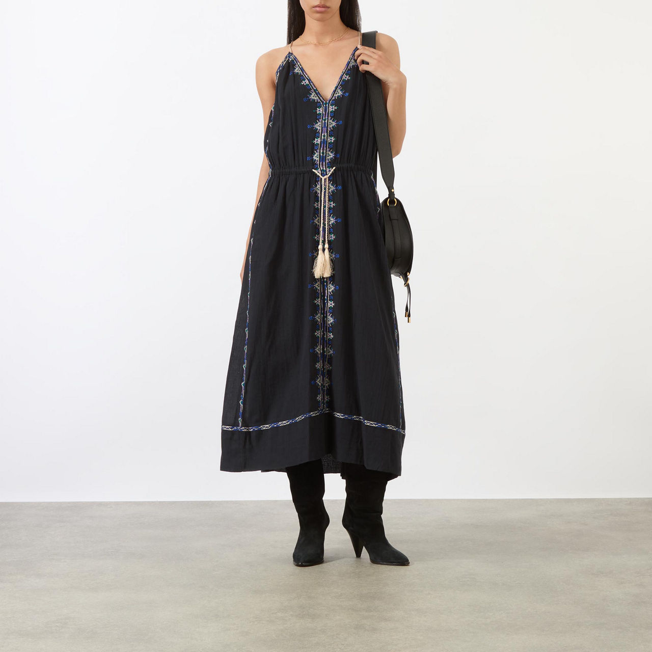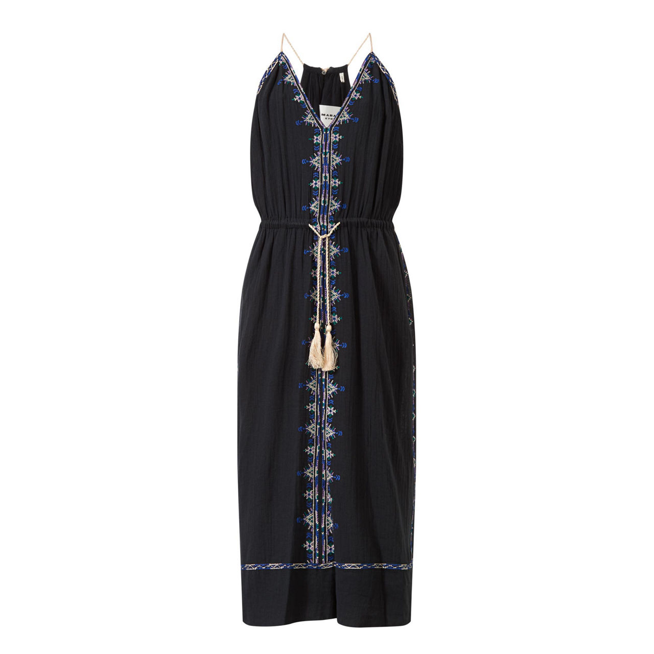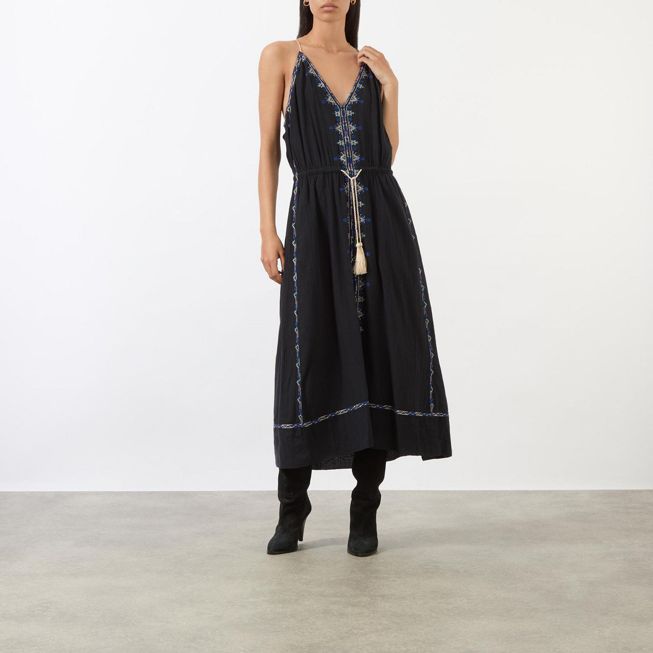 - Sleeveless, plunging V-neckline, adjustable halter-neckline, embroidered detailing, adjustable tie-fastening waist with tassel details, slit pockets, flared silhouette, smooth fabric