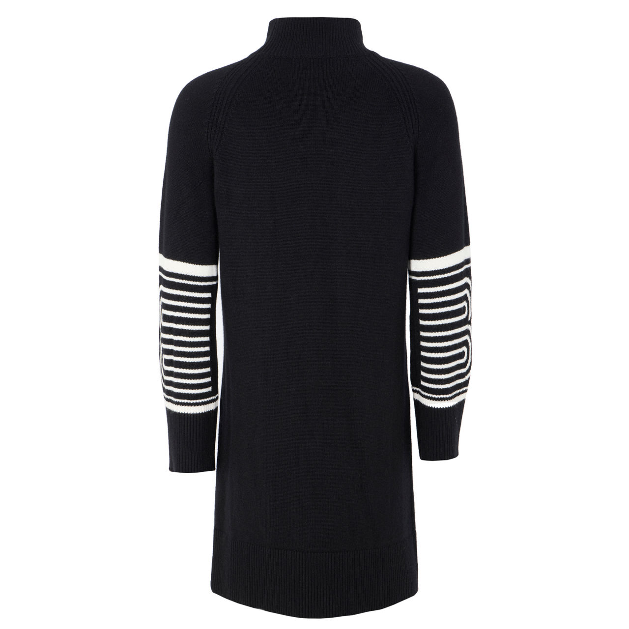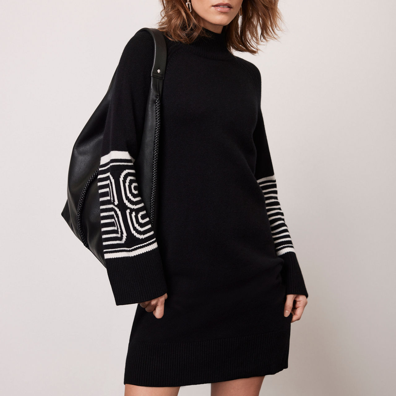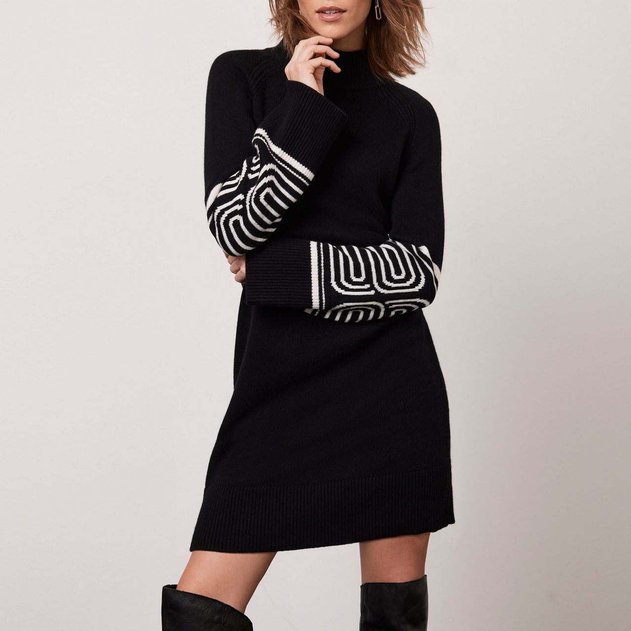 - Long sleeves, turtleneck, mini length, graphic sleeve design detail, knit fabric, pull-on style, ribbed trims
