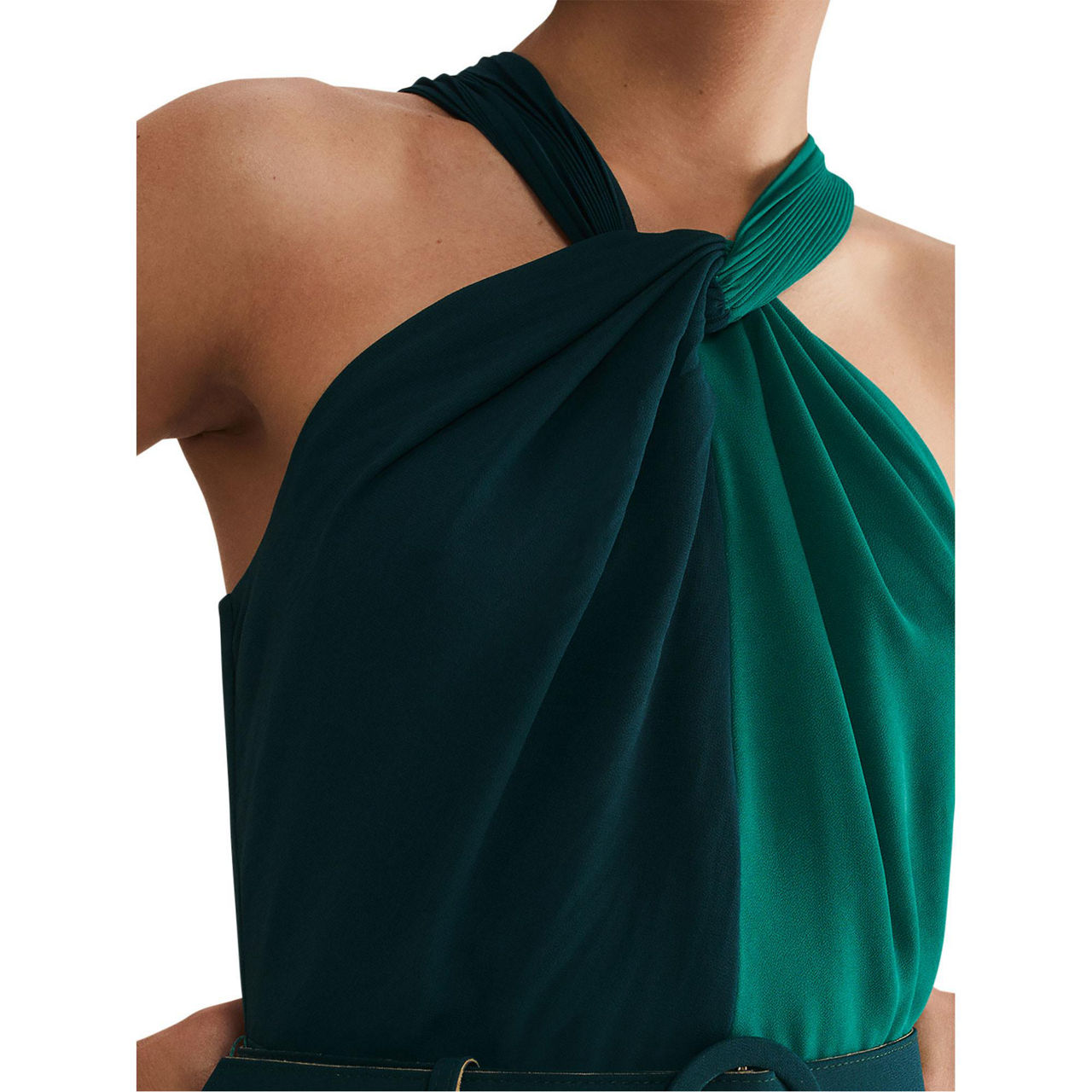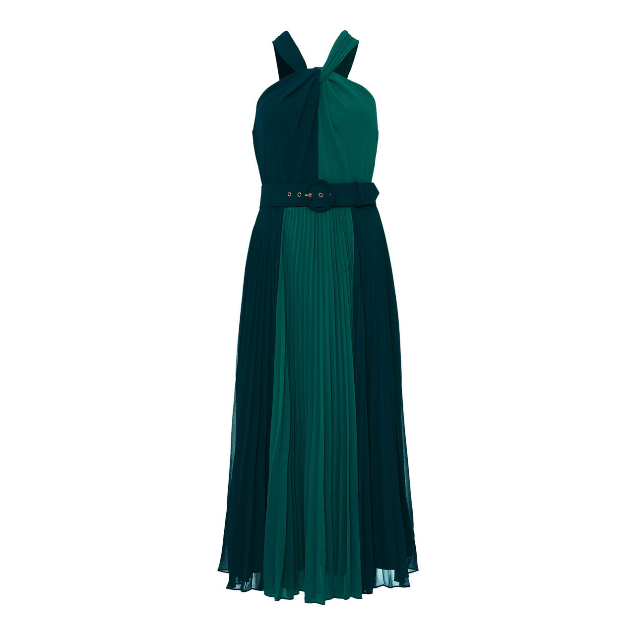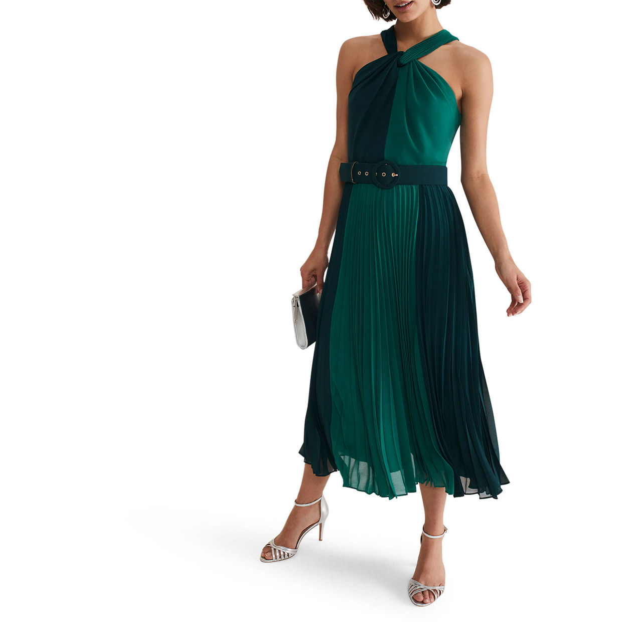 - Colour block pattern, twisted halter neck, matching belt, pleated, flowing skirt, sleeveless