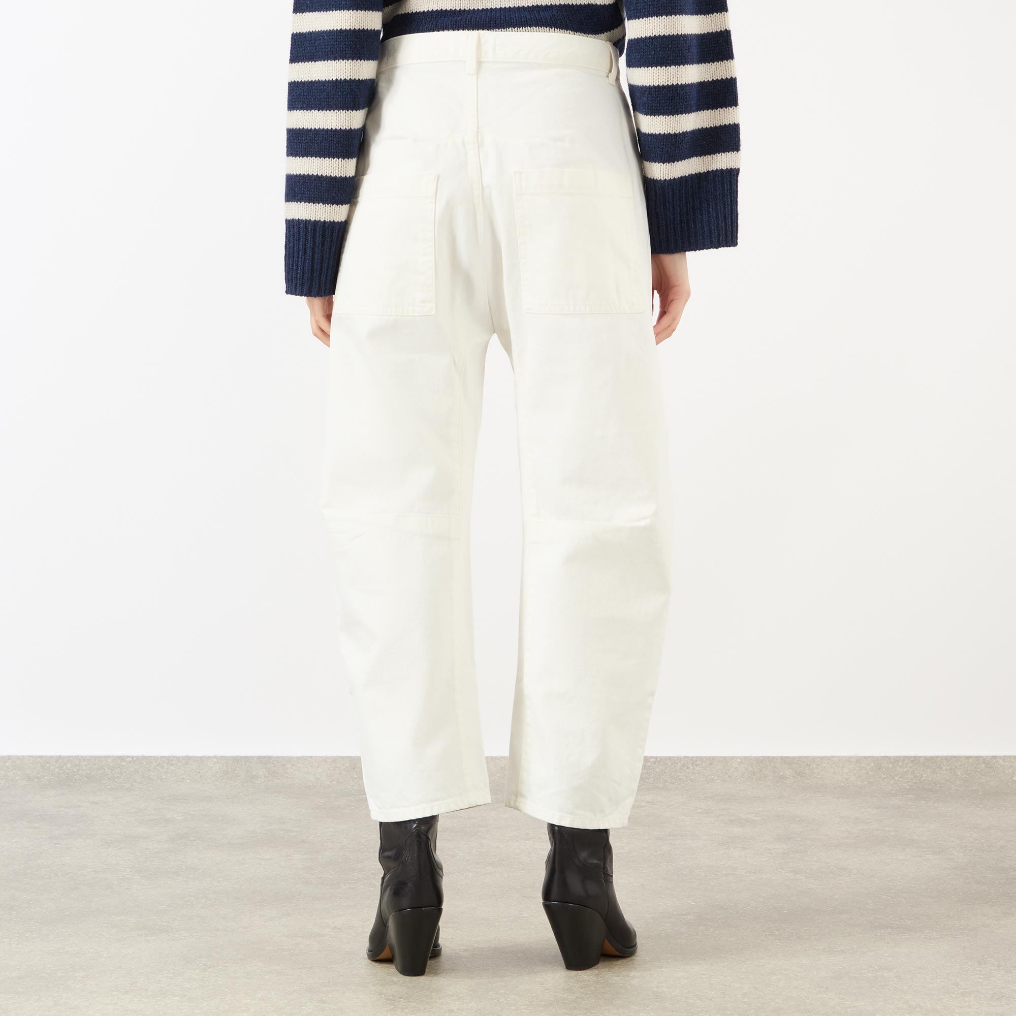 - Hook and eye with fly zip fastening, belt loops, front pockets, rear patch pockets, barrel-shape leg, top-stitched front, seam detail at knees
