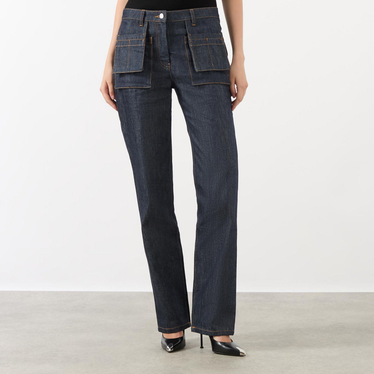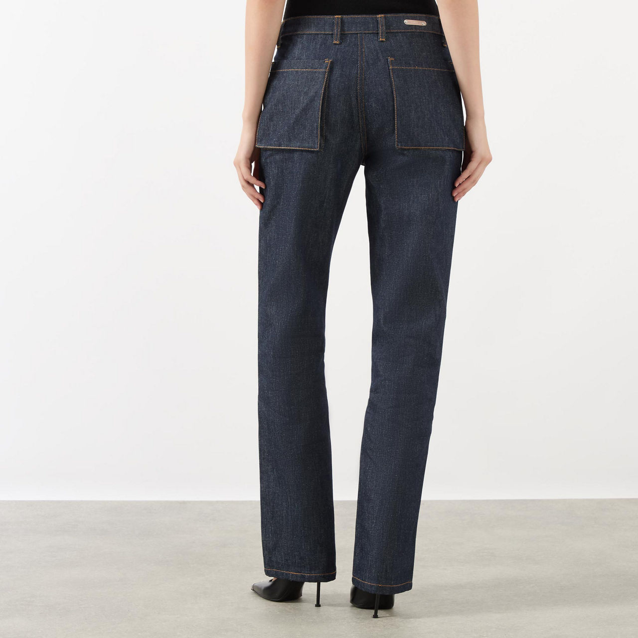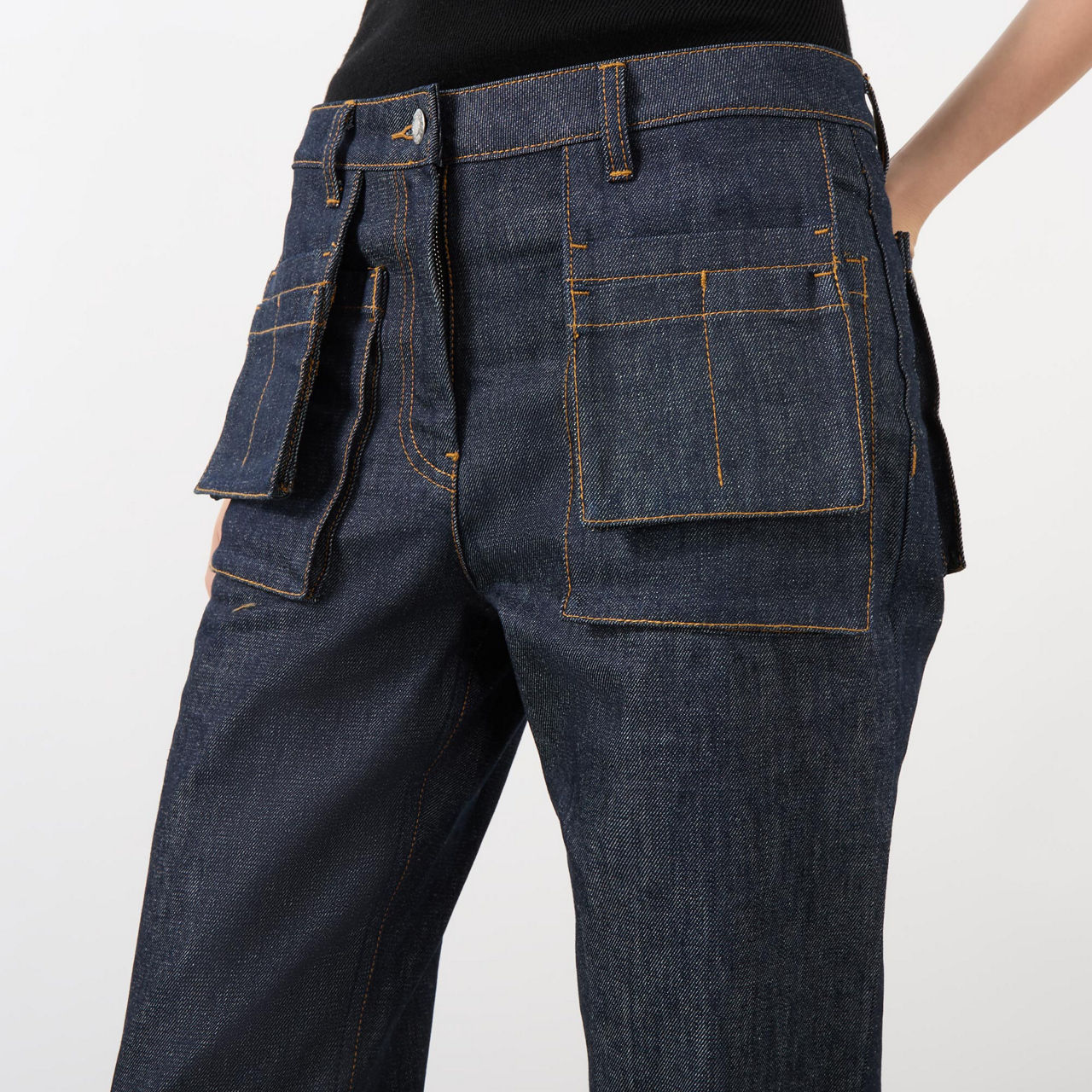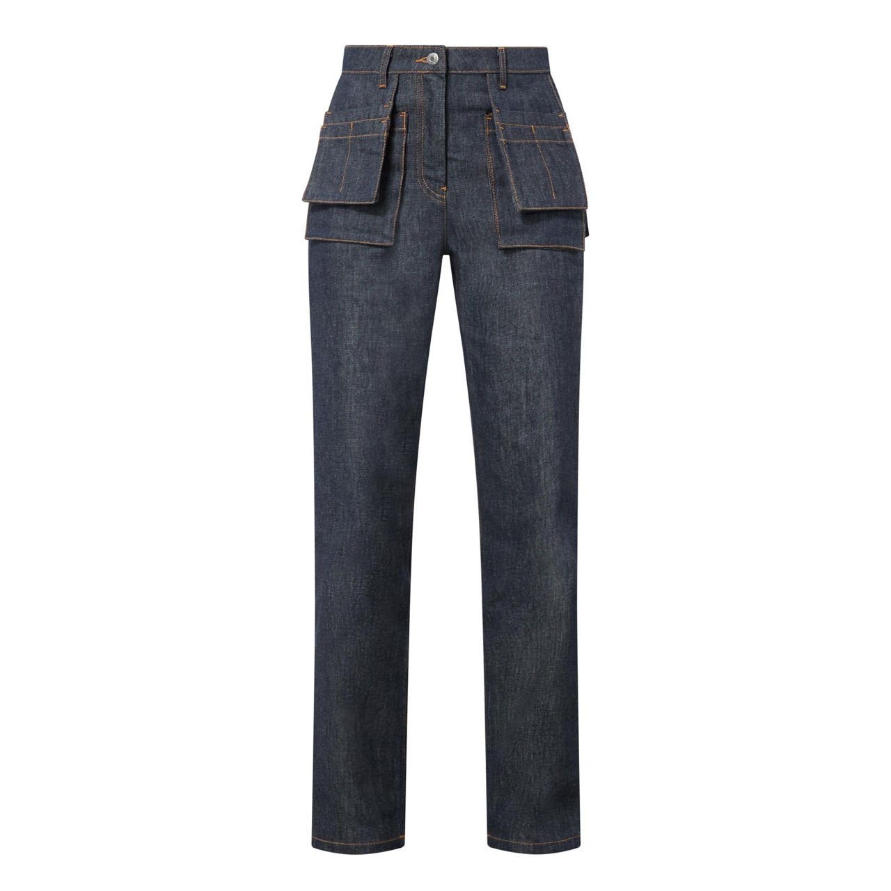 - Mid-rise, straight-leg, belt loops, concealed zip fly and button fastening, two front patch pockets, two utility apron pockets, two rear patch pockets, contrast stitching throughout, rear logo detail, raw-dyed denim