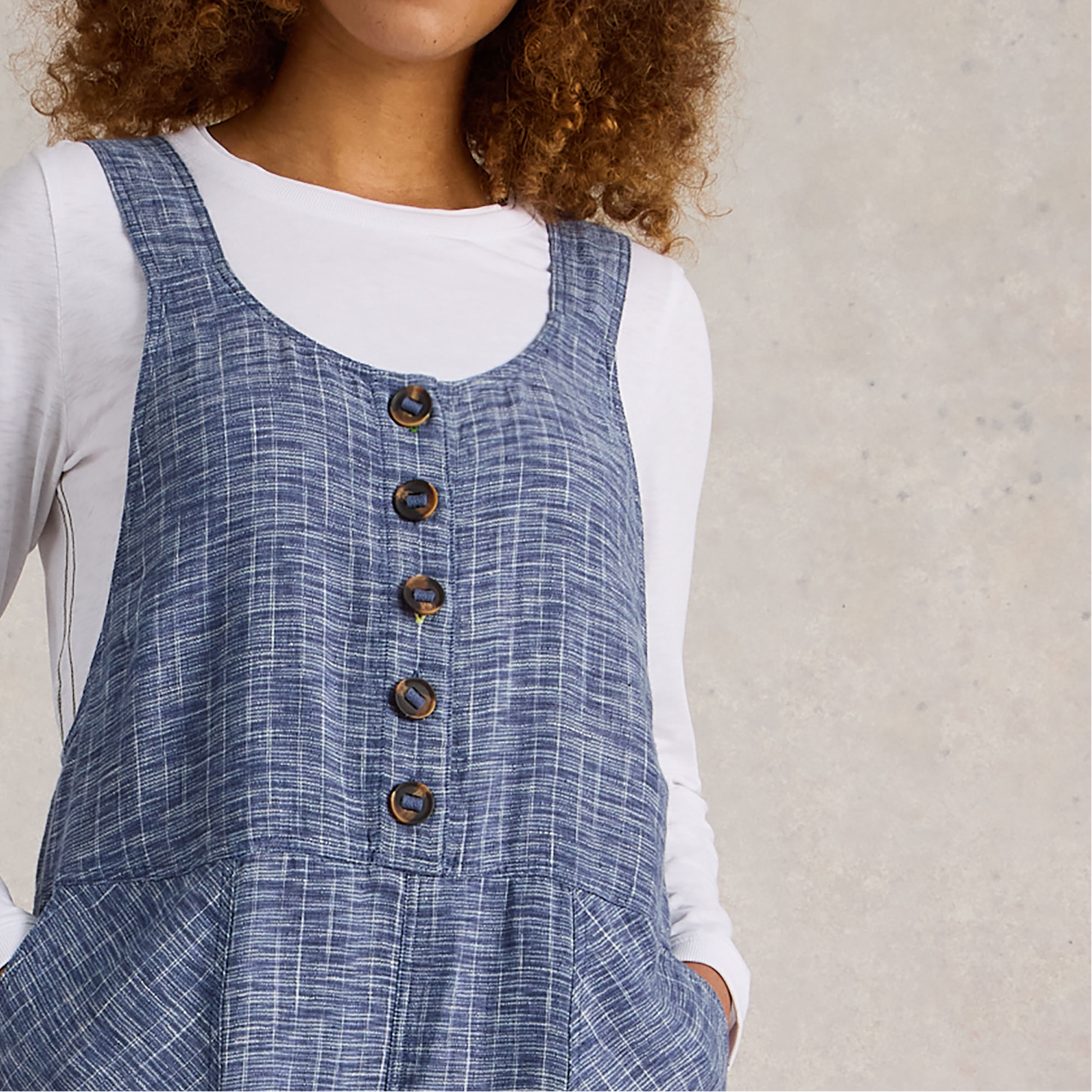 - Linen chambray fabric, pockets, statement button detailing, front patch pockets, back pockets