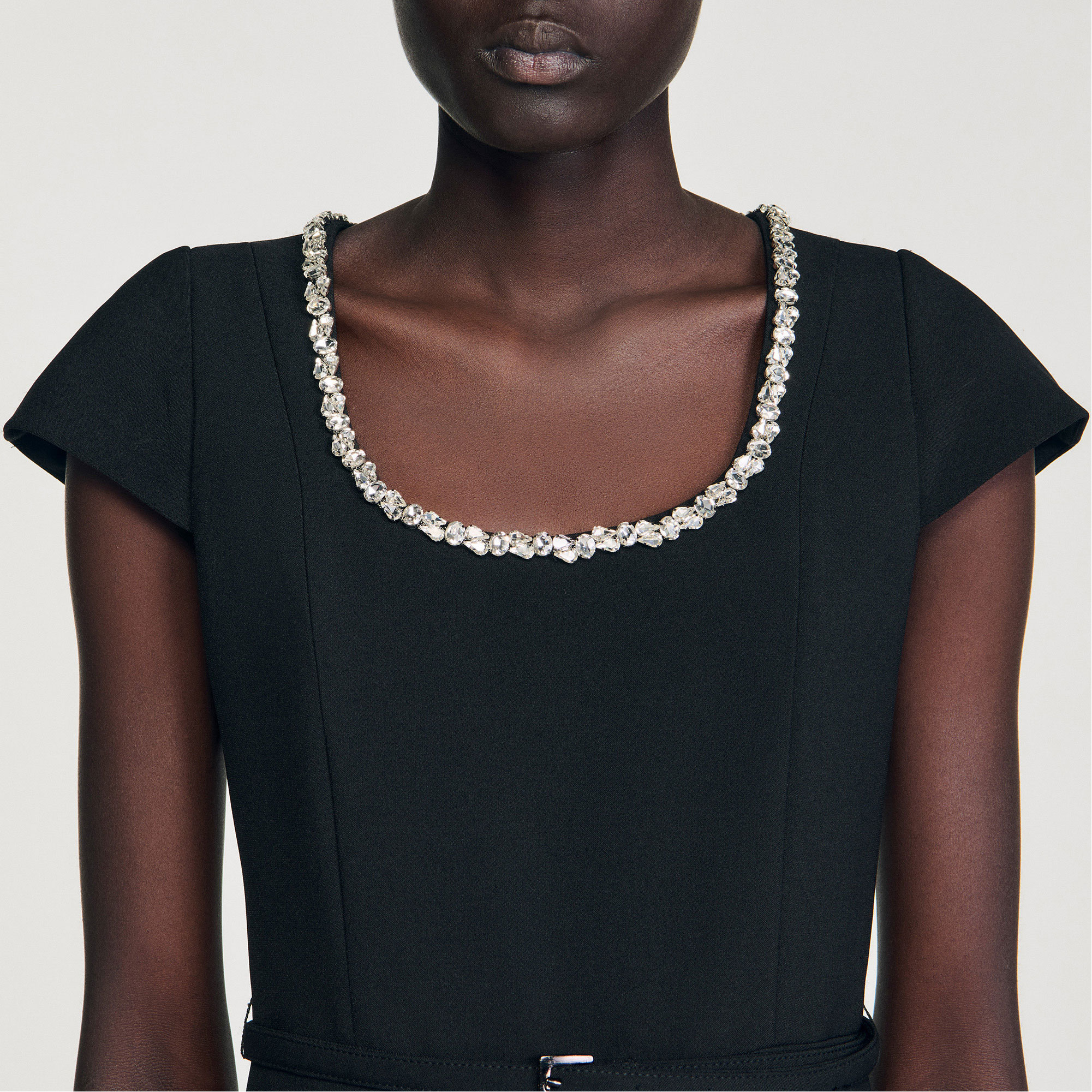 - Square neckline, rhinestone details, short sleeves, removable belt at waist, princess seams, front and back pleats, back zip fastening