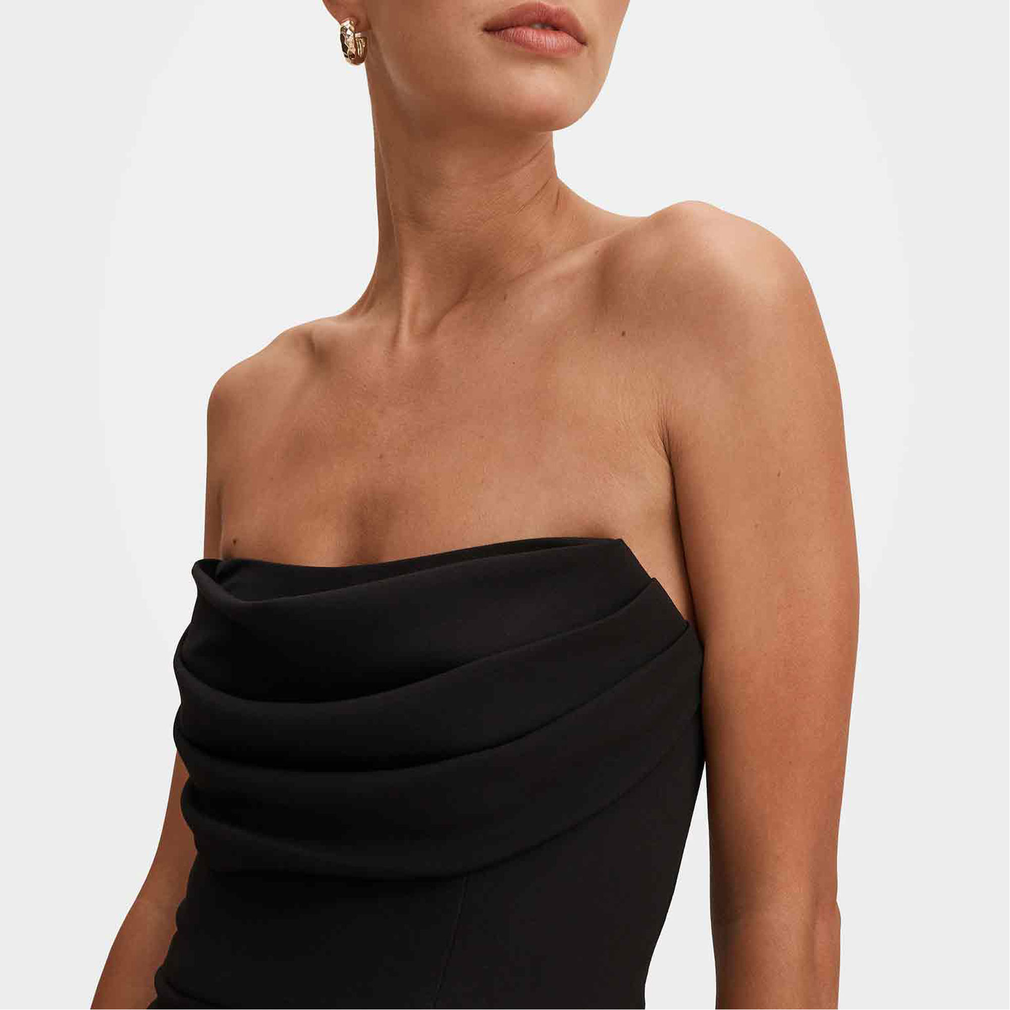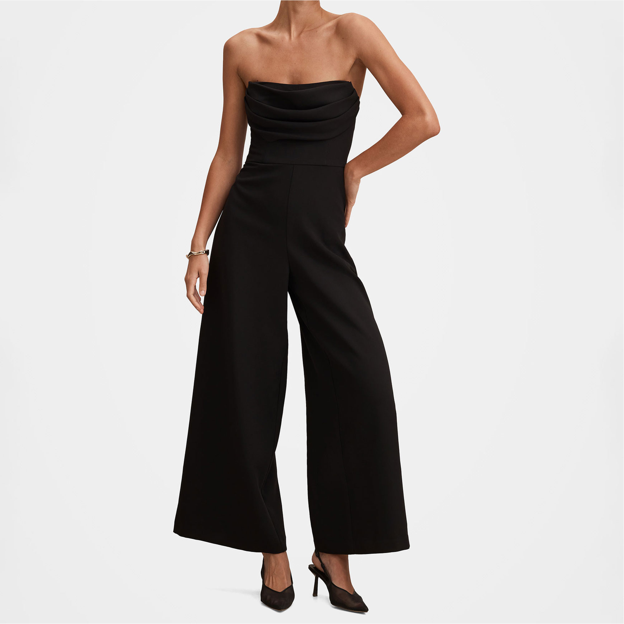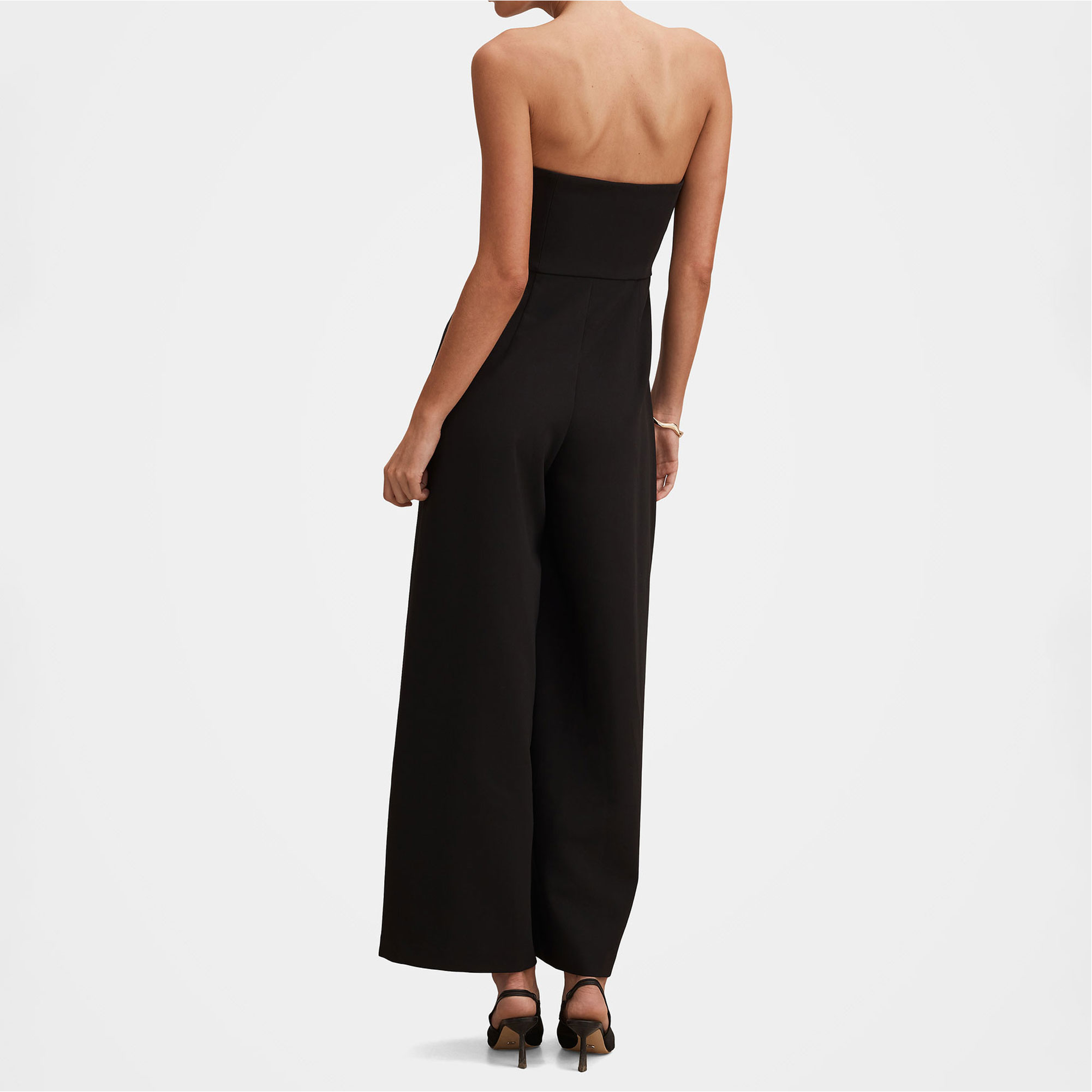 - Fitted through the bodice, strapless neckline, high waist seam, wide leg pant silhouette, concealed zip fastening at side, lined