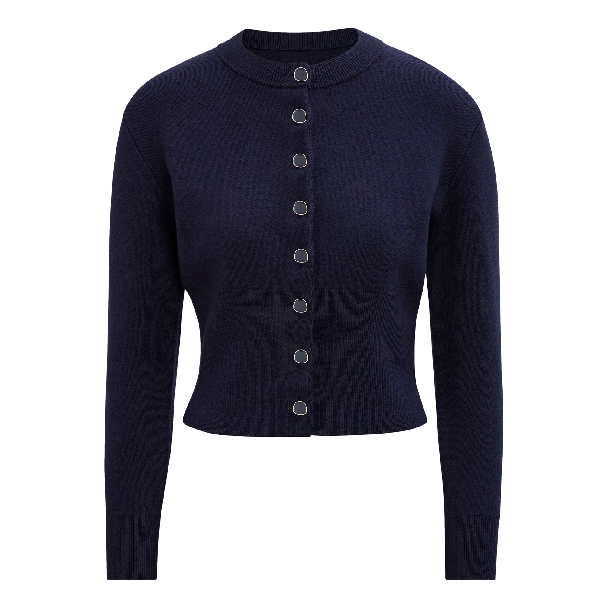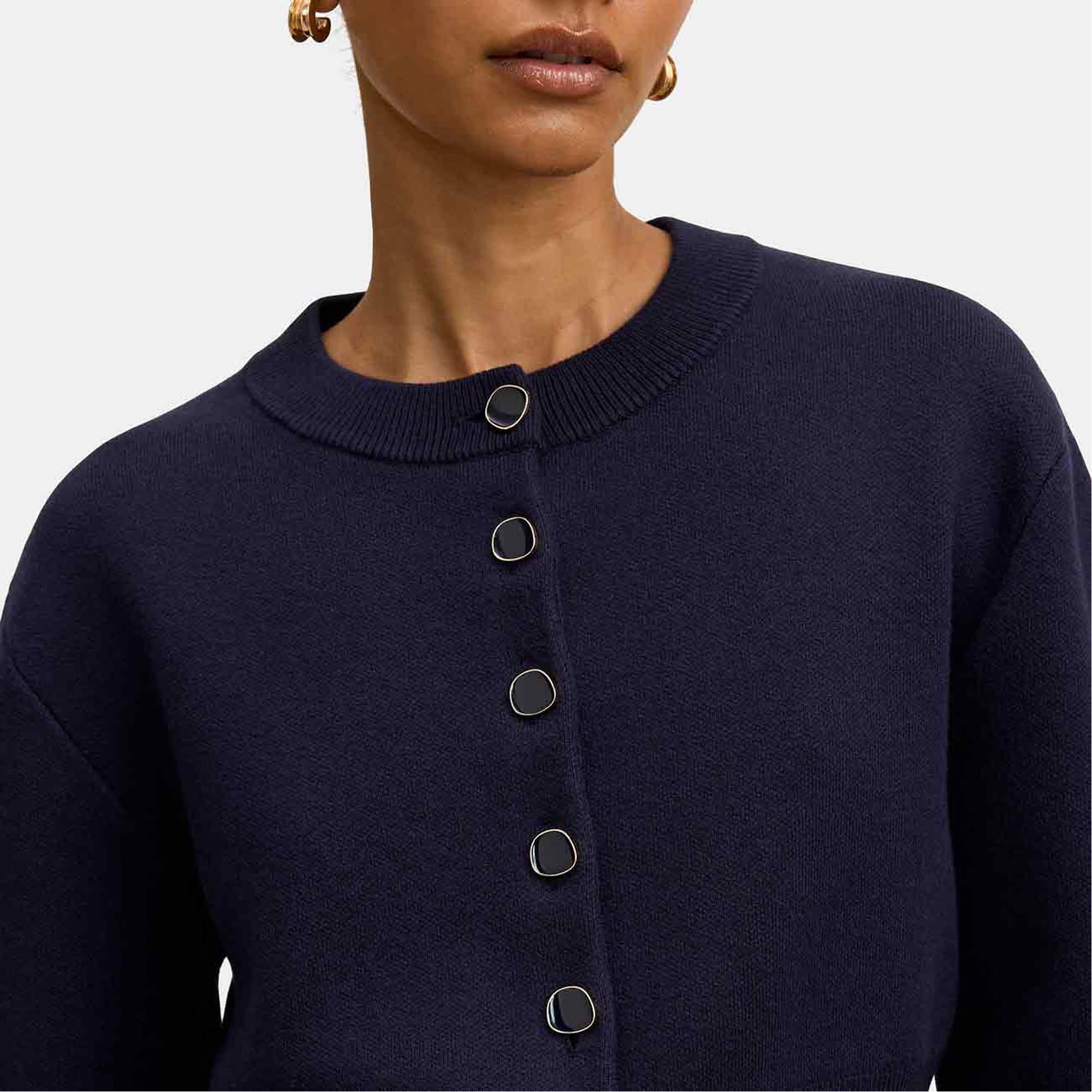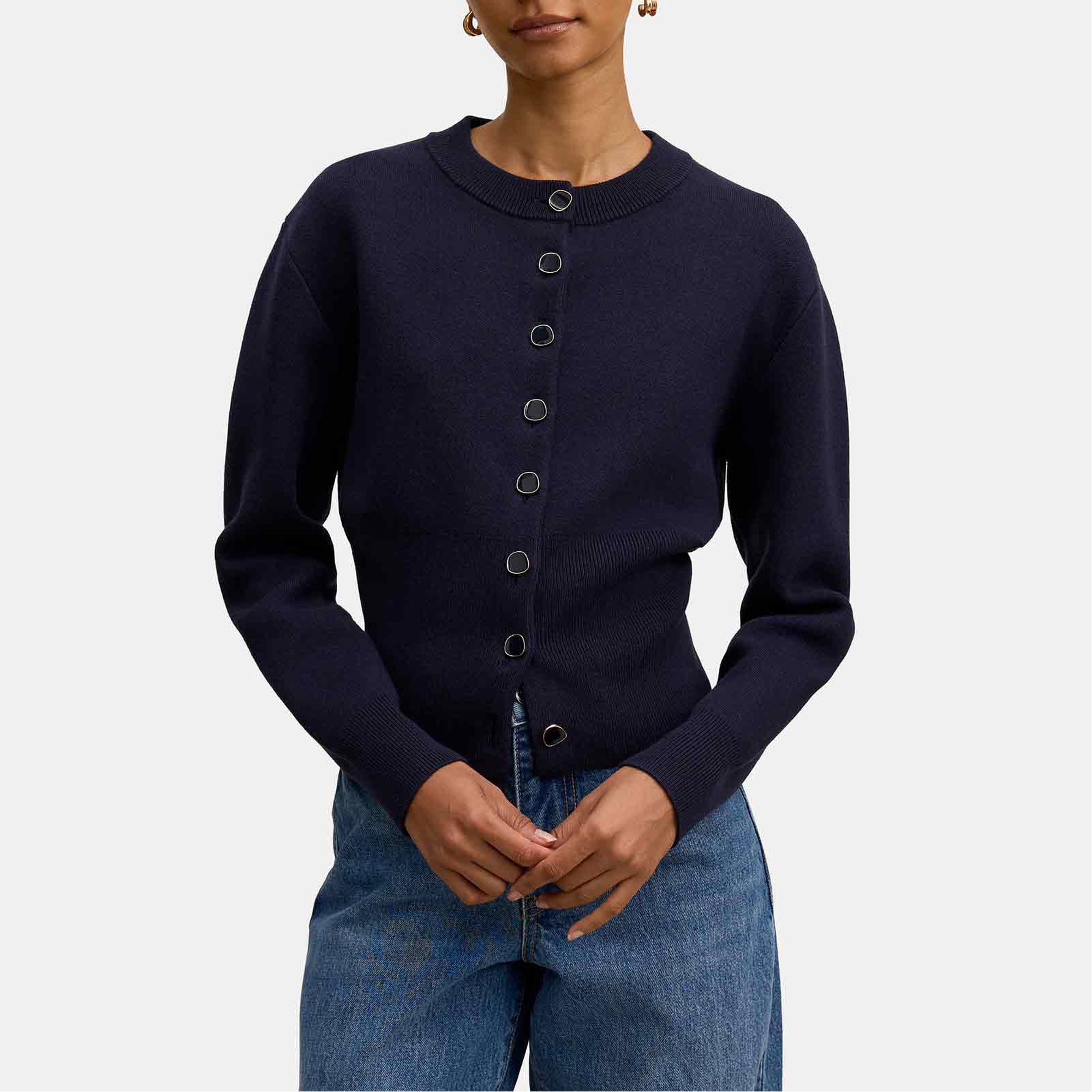 - Regular fit, cosy knit fabrication, full-length sleeves with ribbed cuffs, classic ribbed crew neckline, button-through front