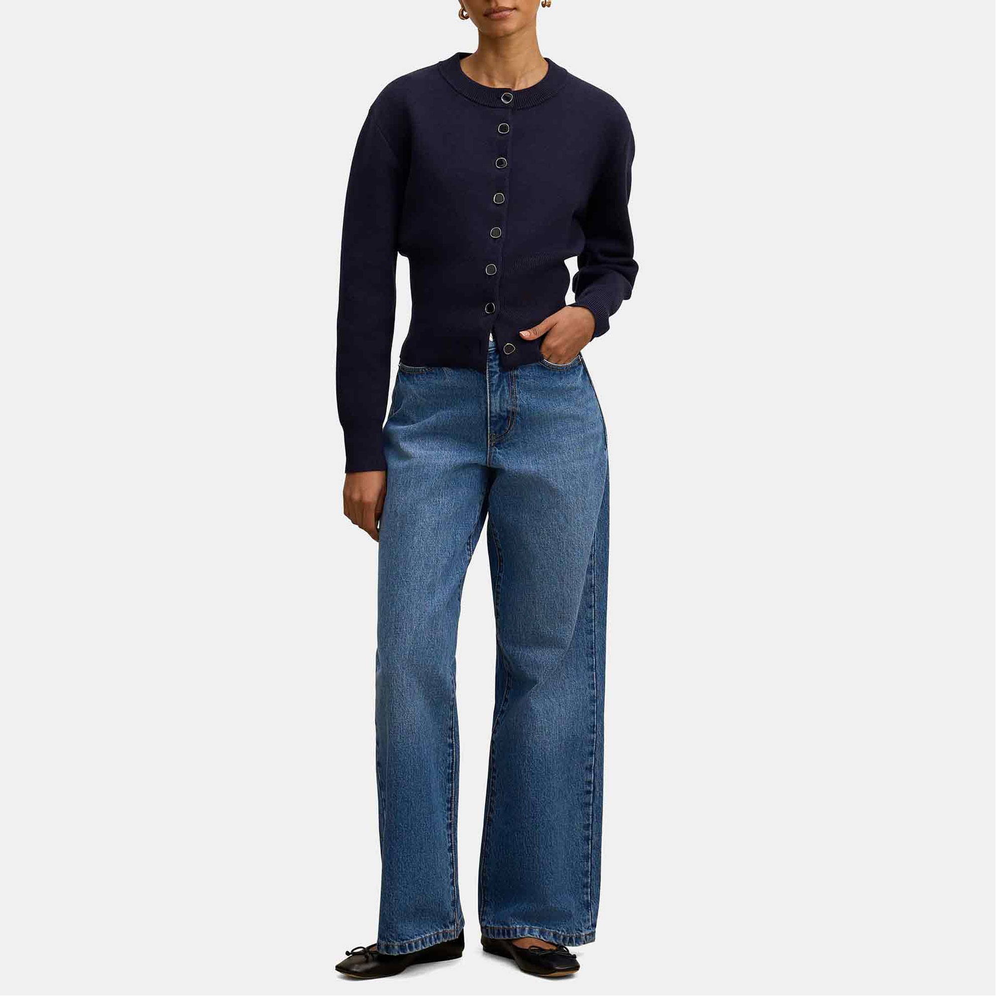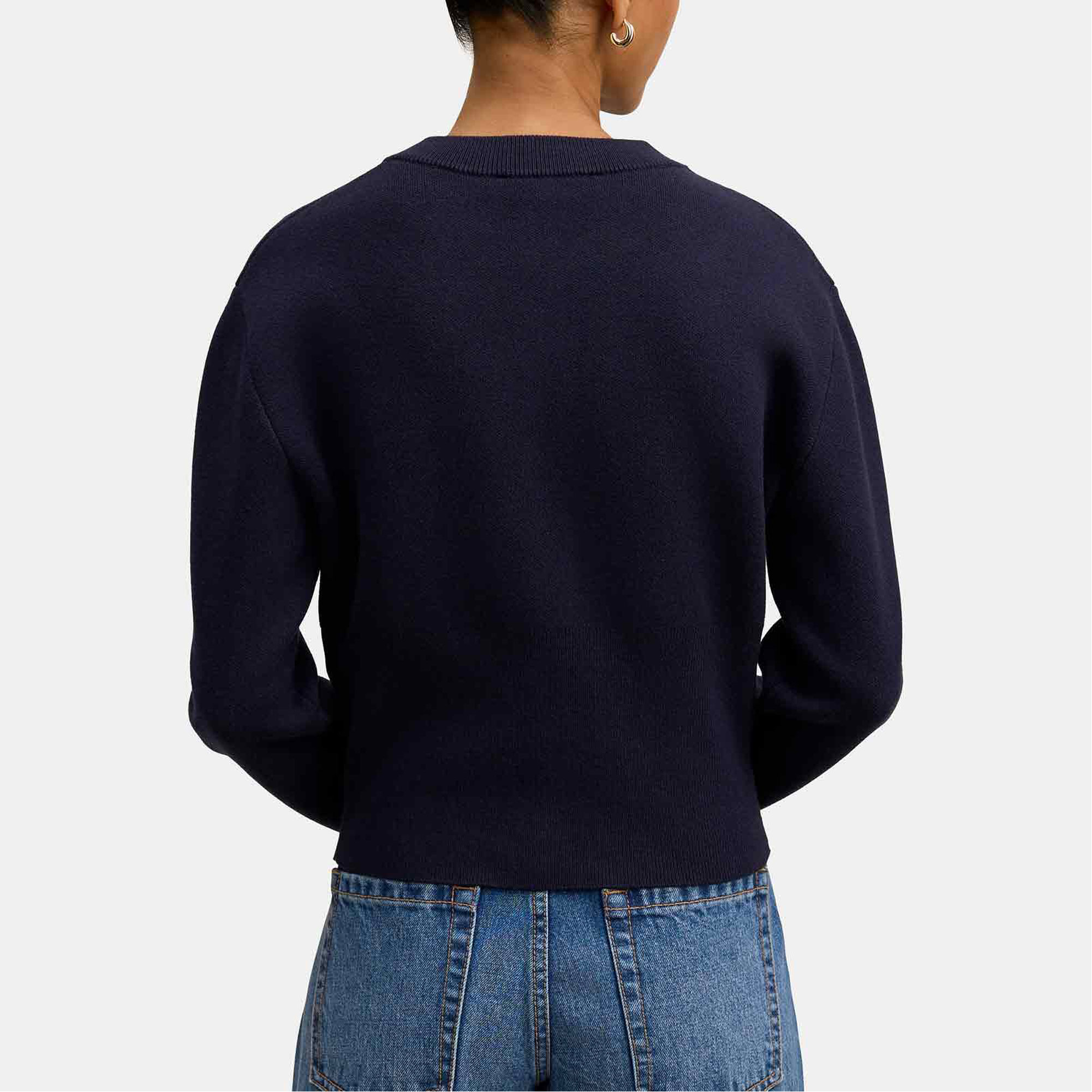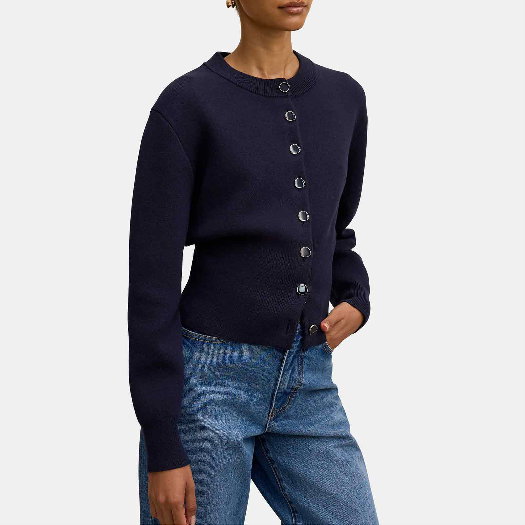 - Regular fit, cosy knit fabrication, full-length sleeves with ribbed cuffs, classic ribbed crew neckline, button-through front