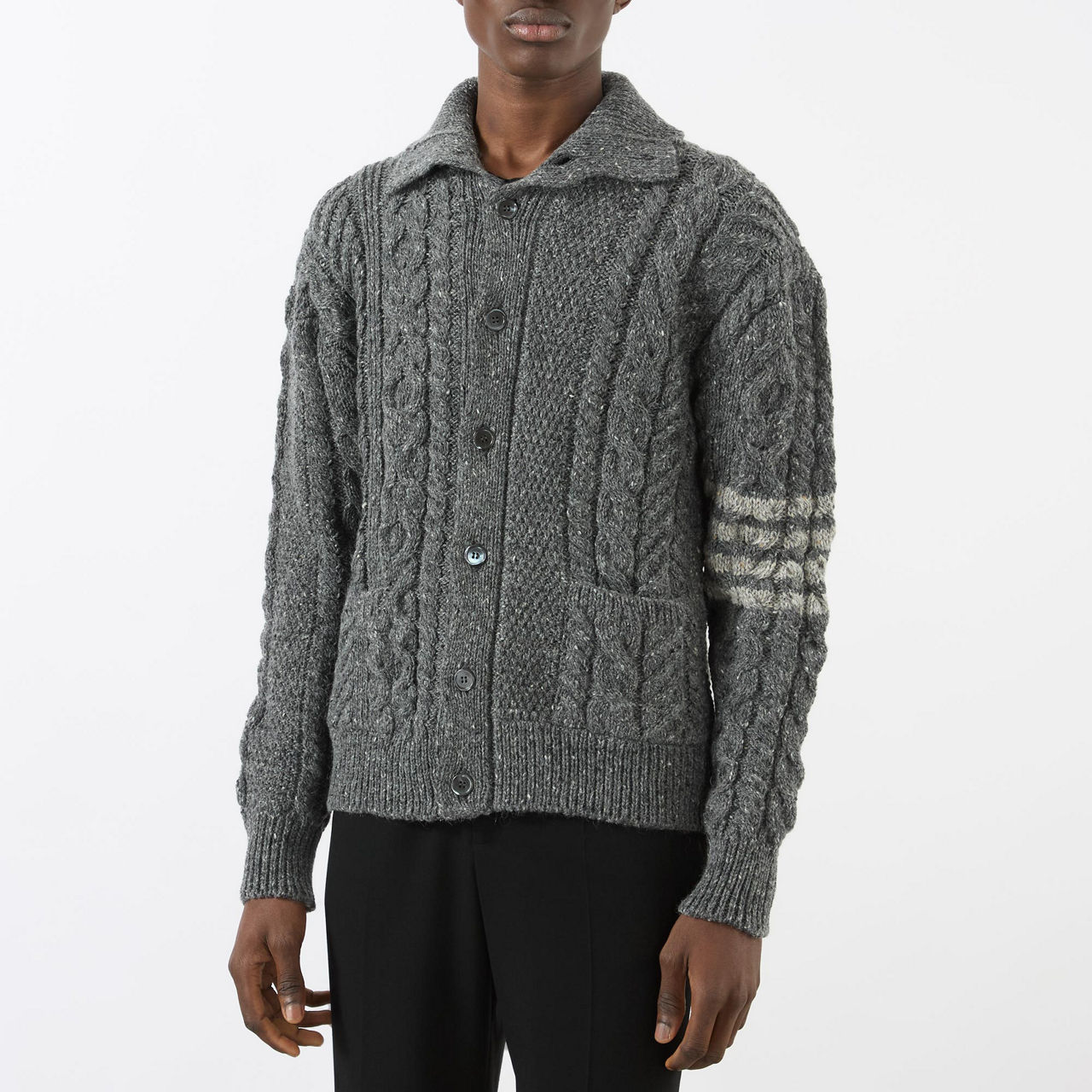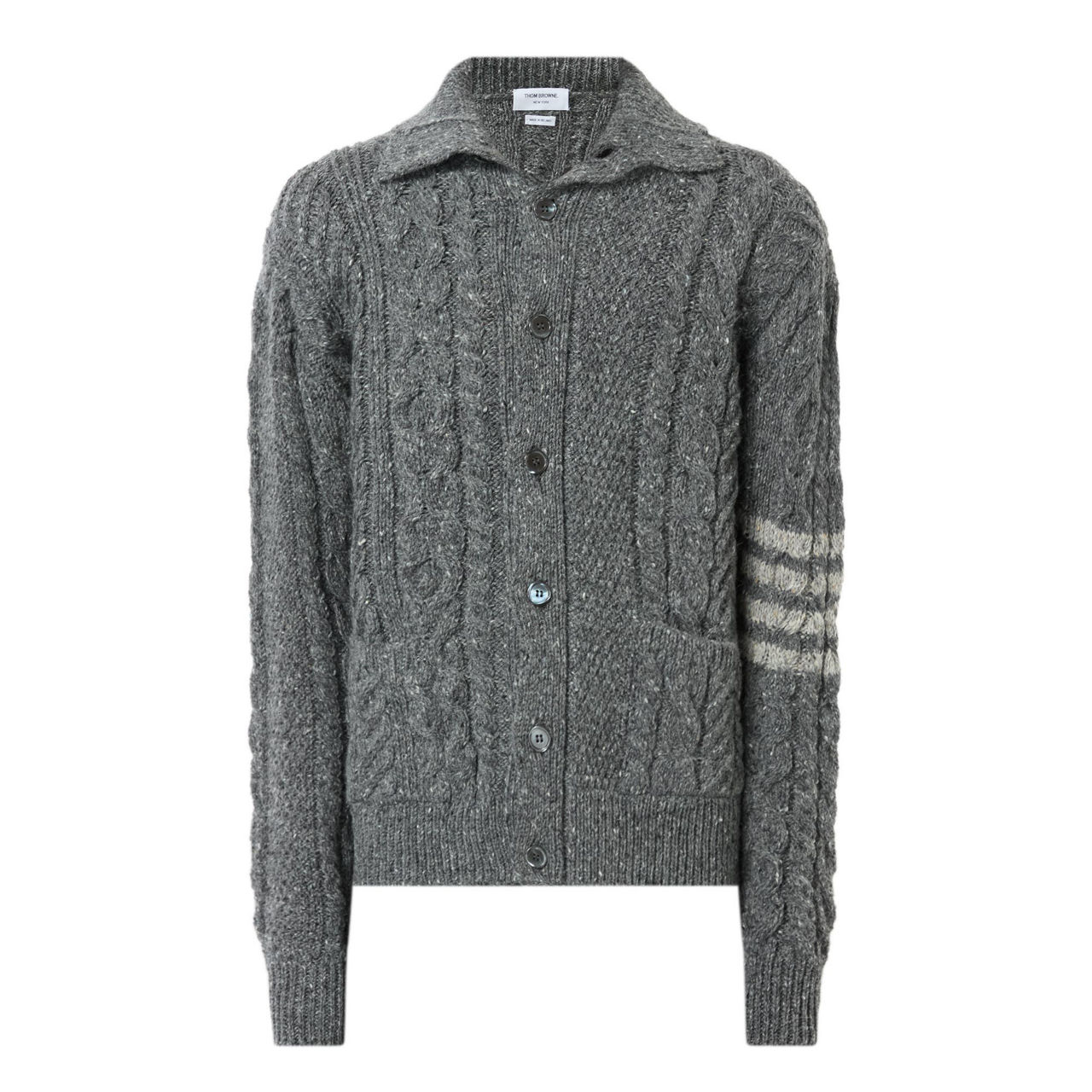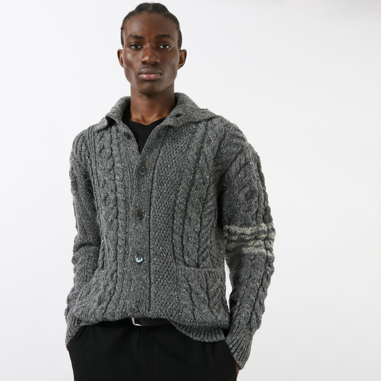 - Chunky cable knit design, long sleeves, spread collar, button fastenings, four-stripe pattern on the sleeve, two slip pockets