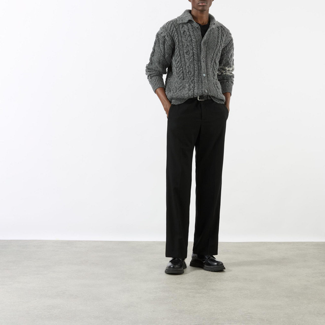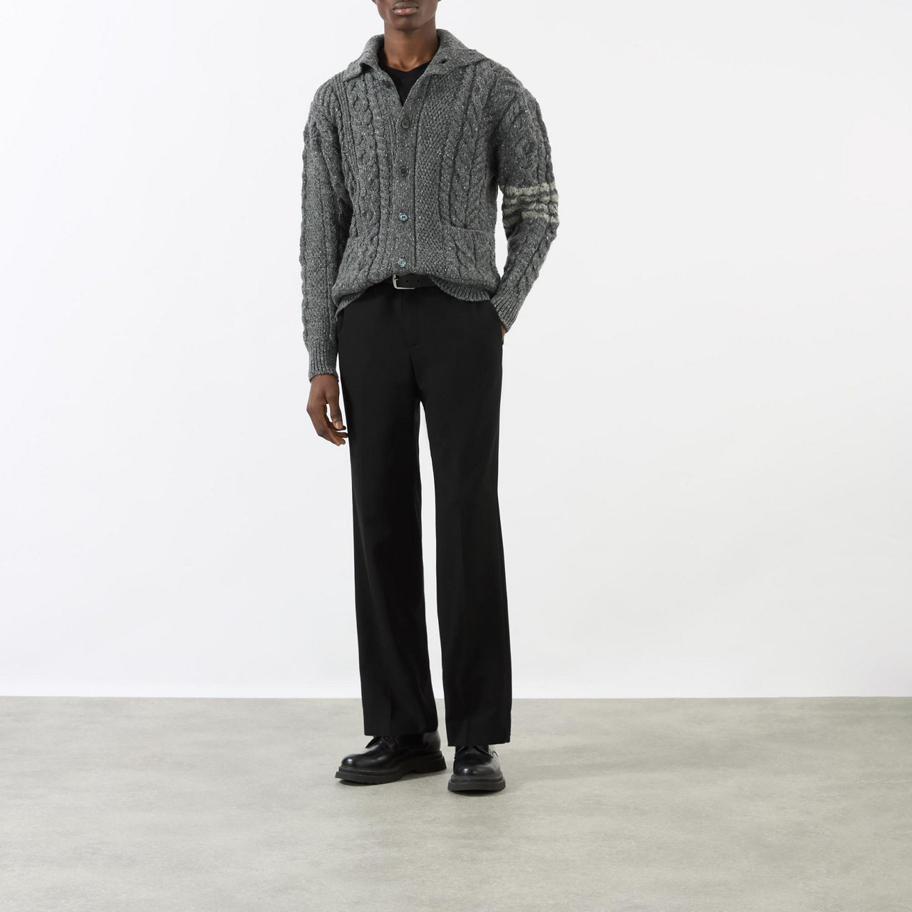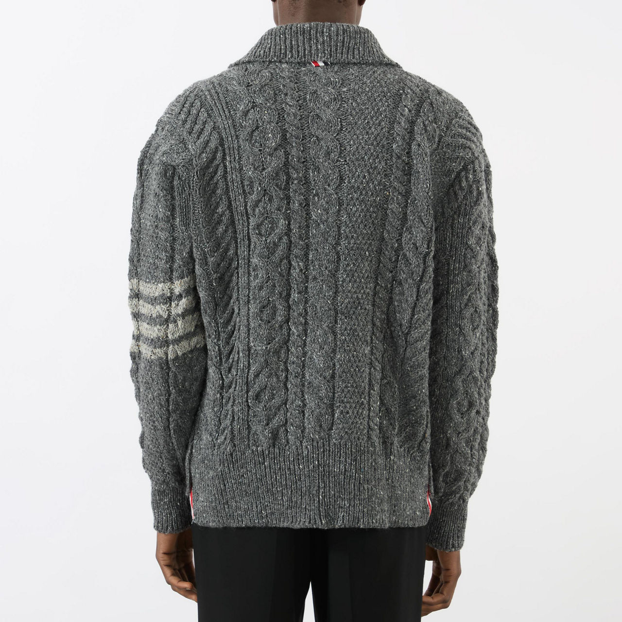 - Chunky cable knit design, long sleeves, spread collar, button fastenings, four-stripe pattern on the sleeve, two slip pockets