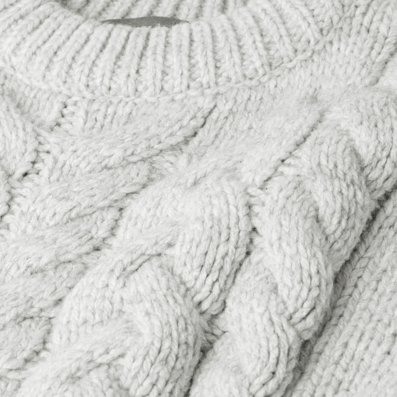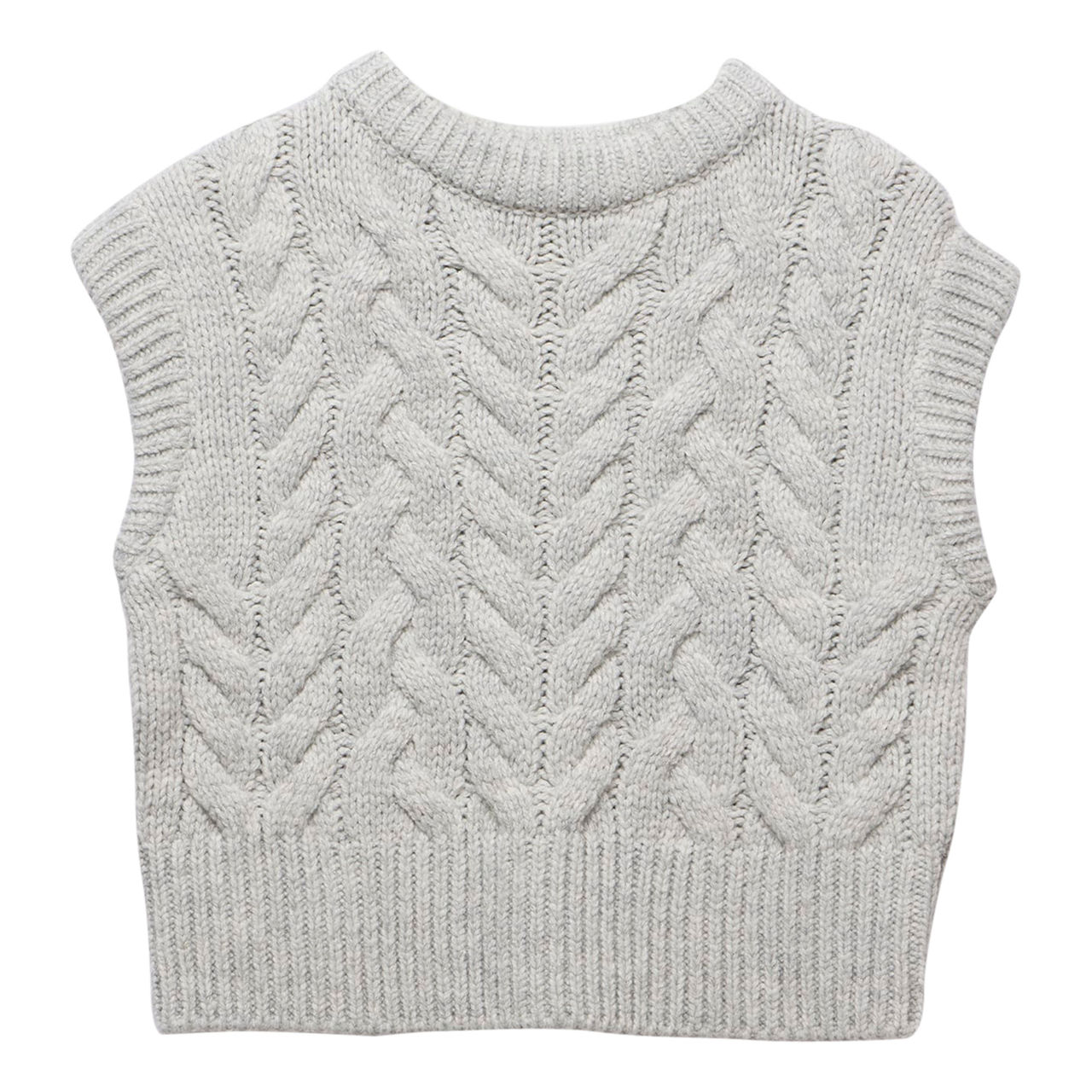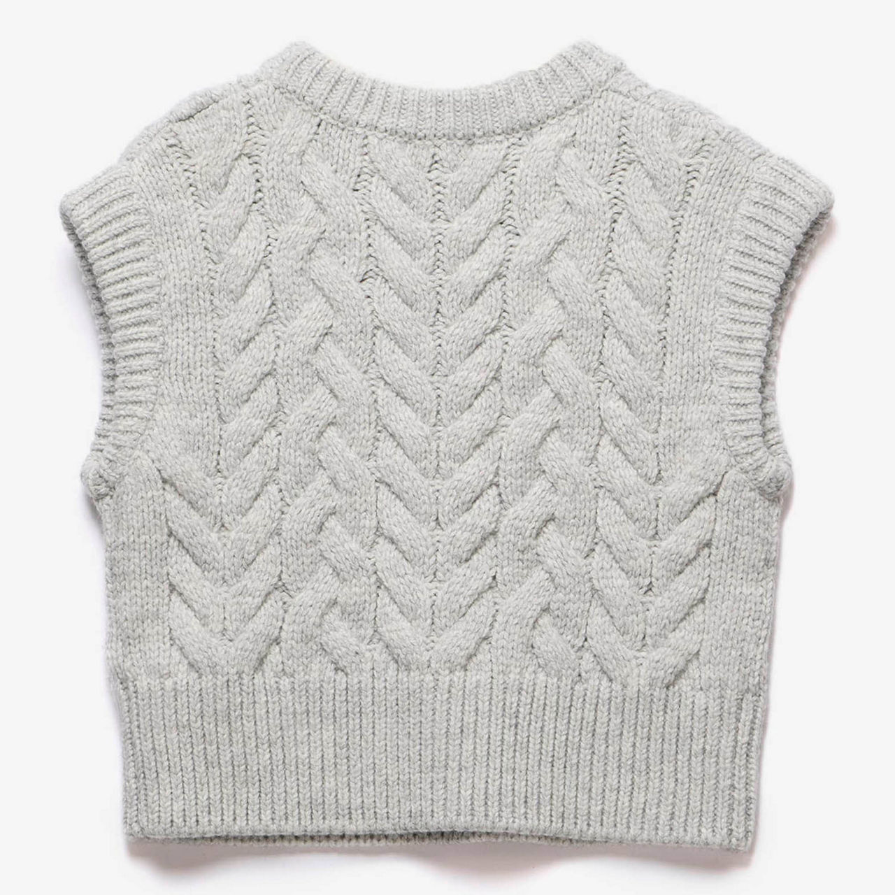 - Sleeveless, pull-on style, boxy silhouette, crew neckline, cable knit finish, ribbed trims
