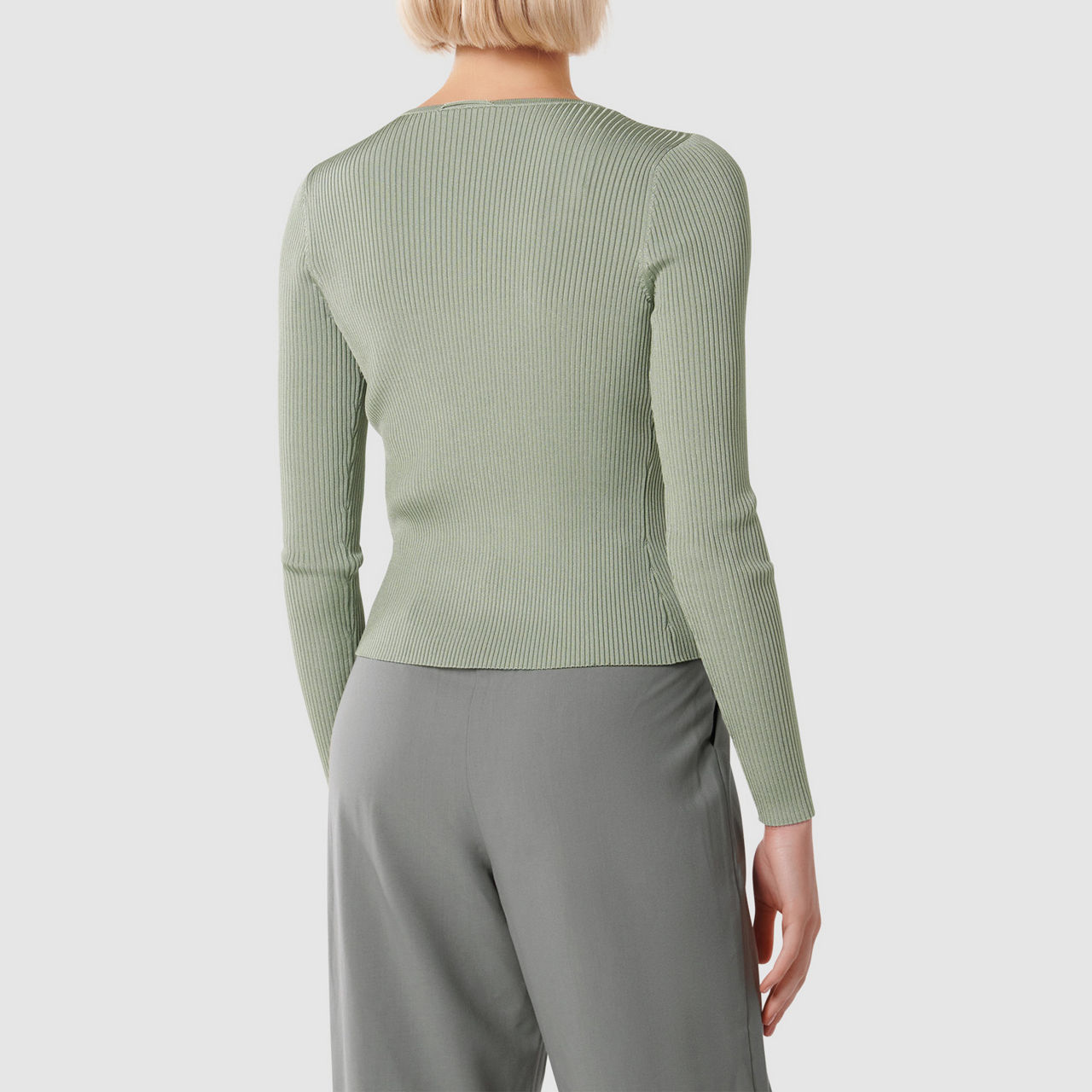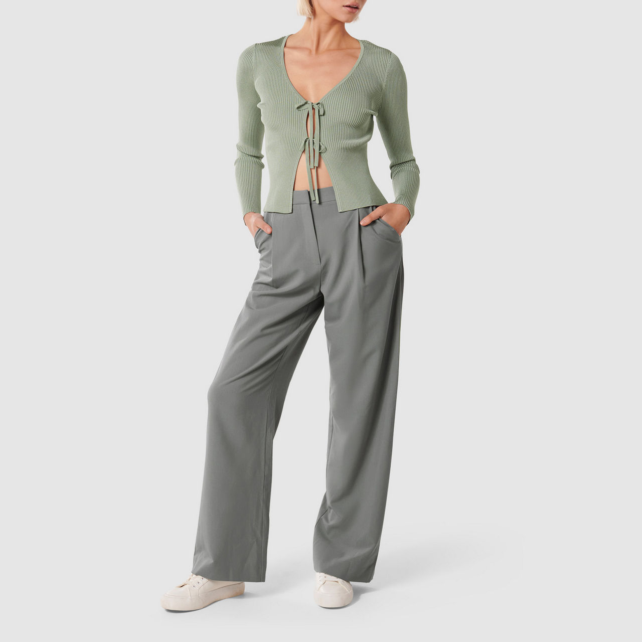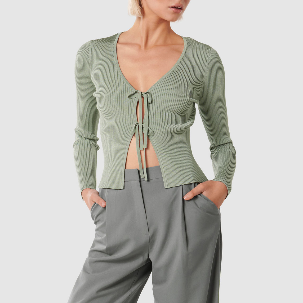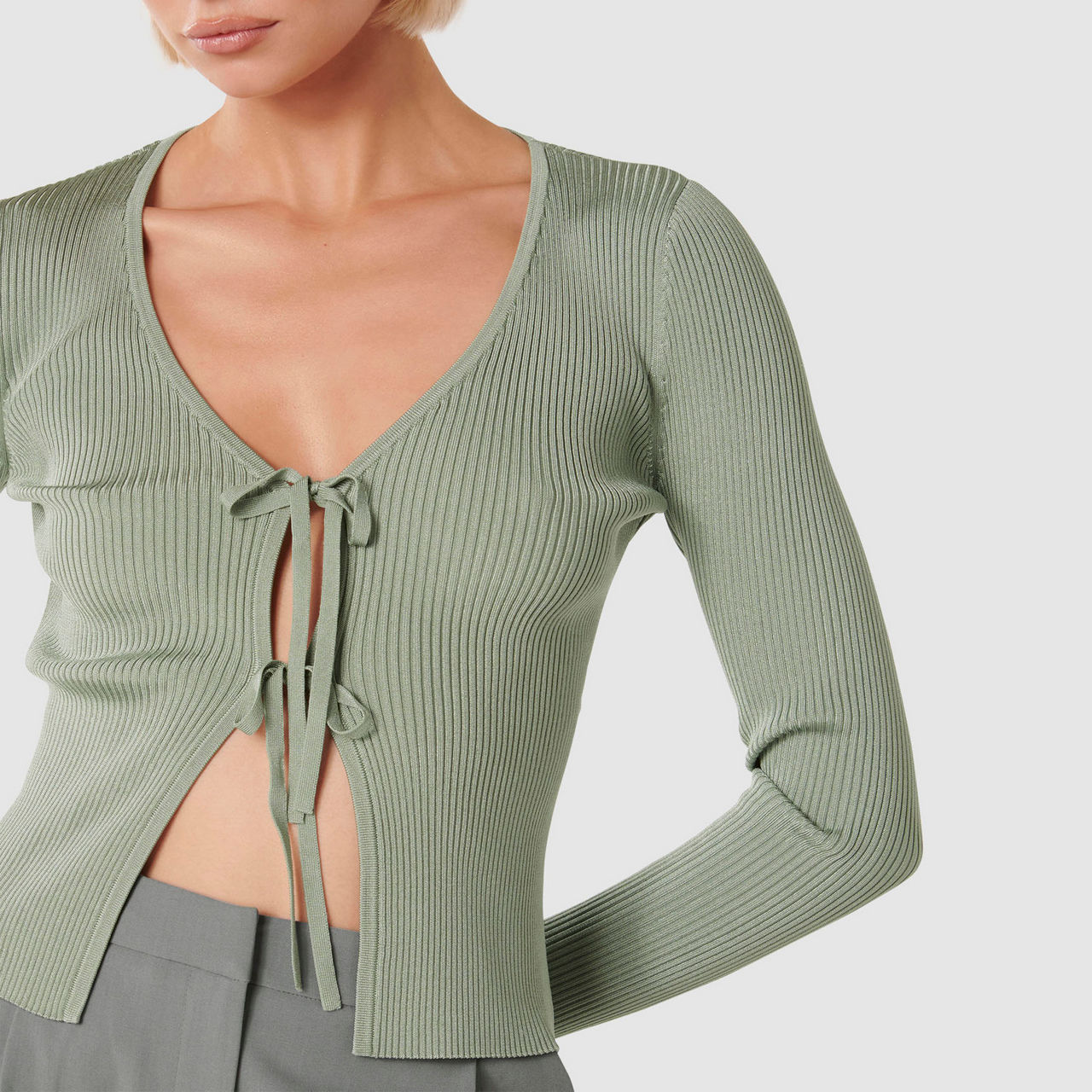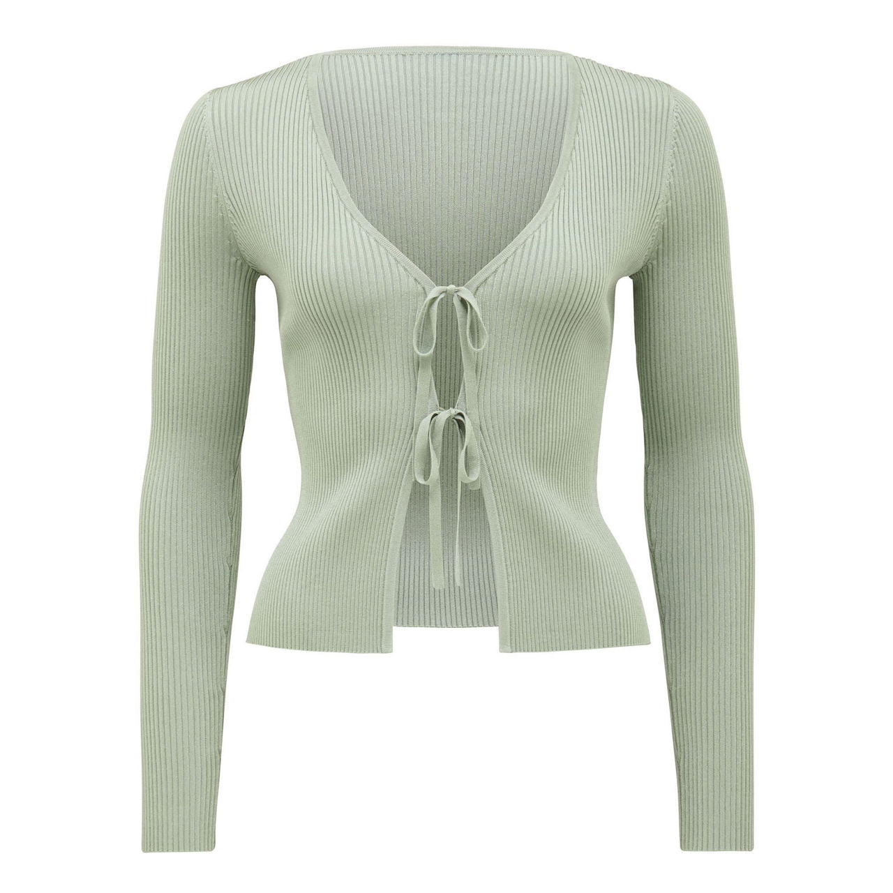 - Ribbed knit, V-neck, tie-front, long sleeves