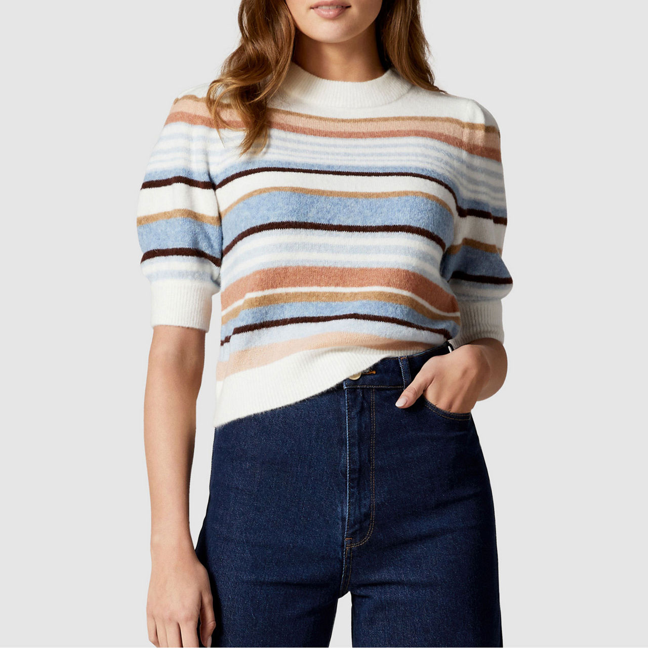 The Clara Puff-Sleeve Stripe Knit Top from Forever New is the piece your wardrobe's been waiting for. Designed to a vintage-inspired puff sleeve silhouette, style with authentic denim for a classic weekend edit.