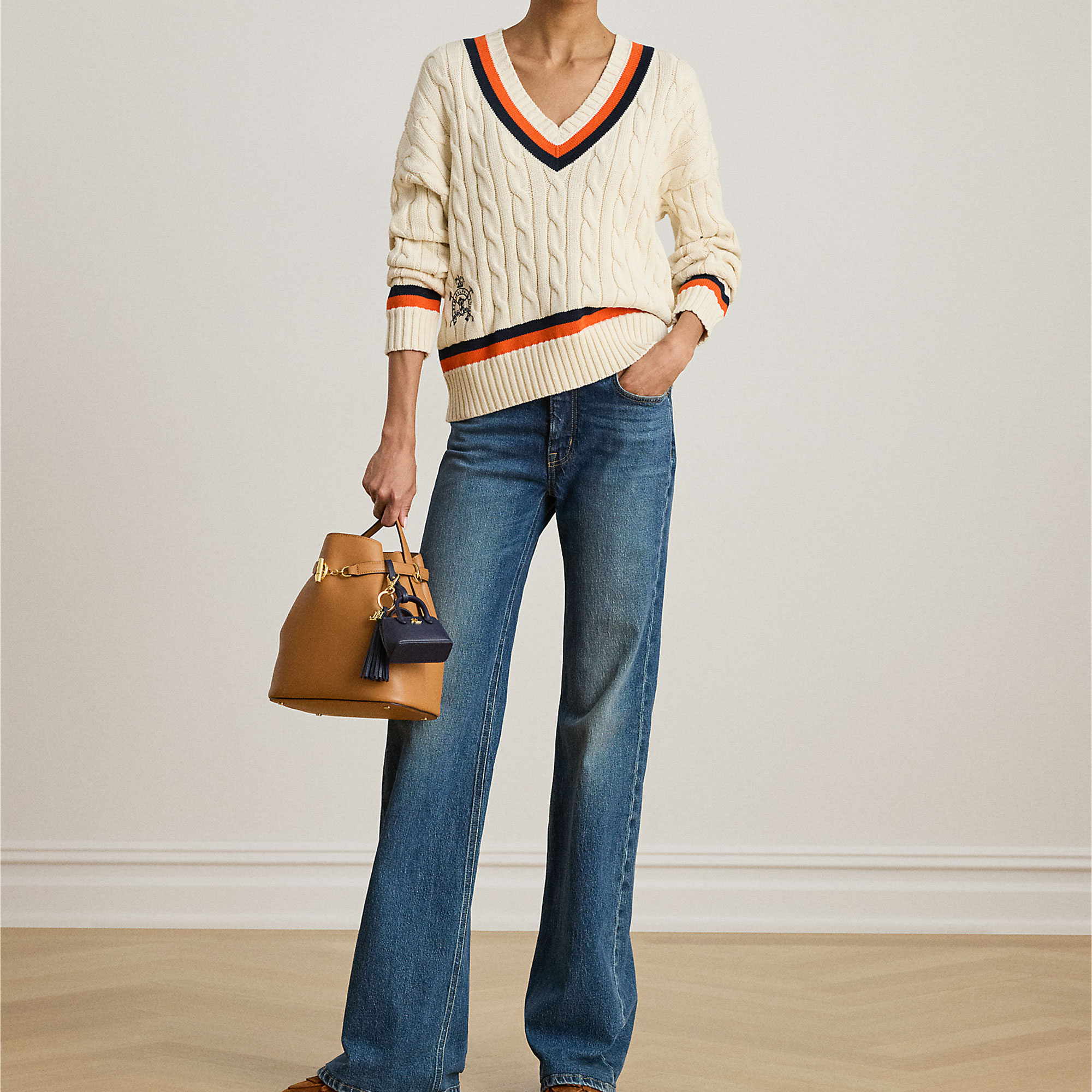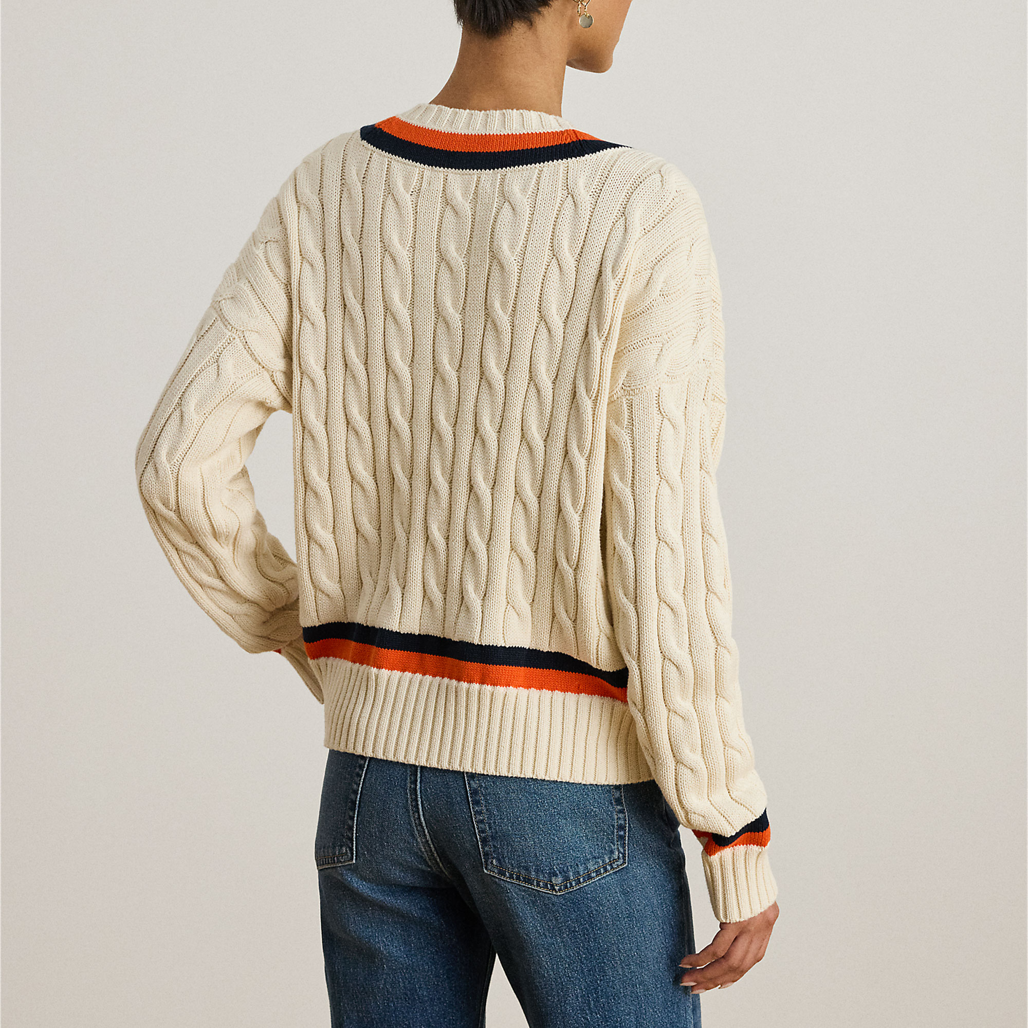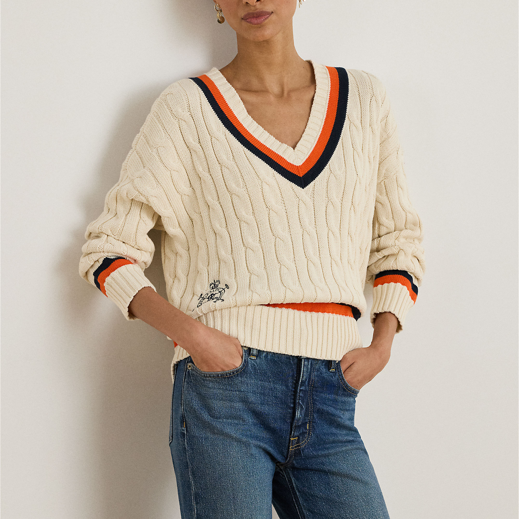 - Soft feel, cricket style, cable-knit pattern, equestrian-inspired embroidered logo detail, striped ribbed V-neckline, long sleeves, striped ribbed cuffs, dropped shoulders, striped ribbed hem