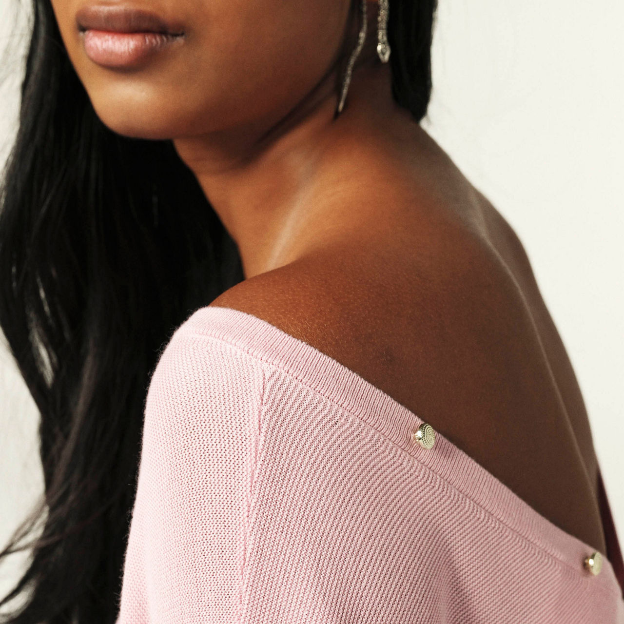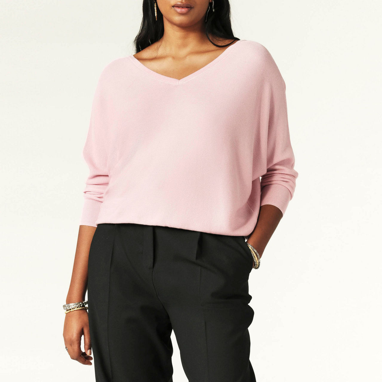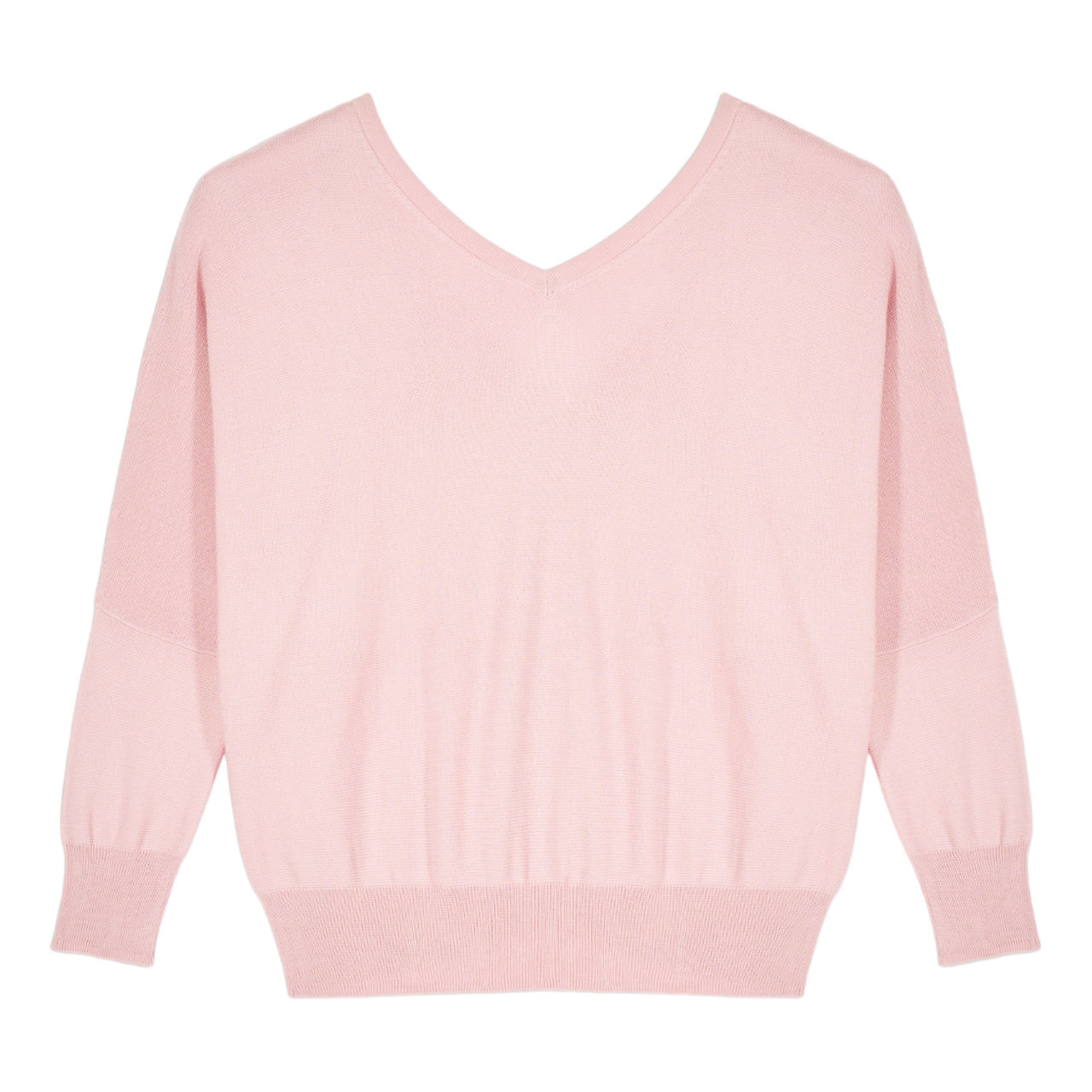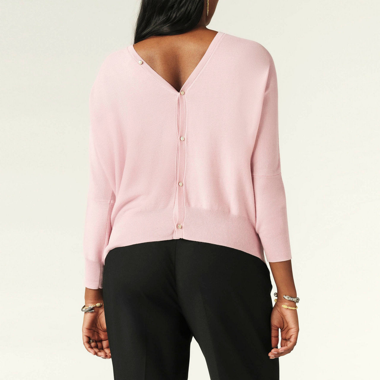 - Batwing sleeves, V-neckline, rear backless V -detail with button fastening, textured finish, ribbed trims