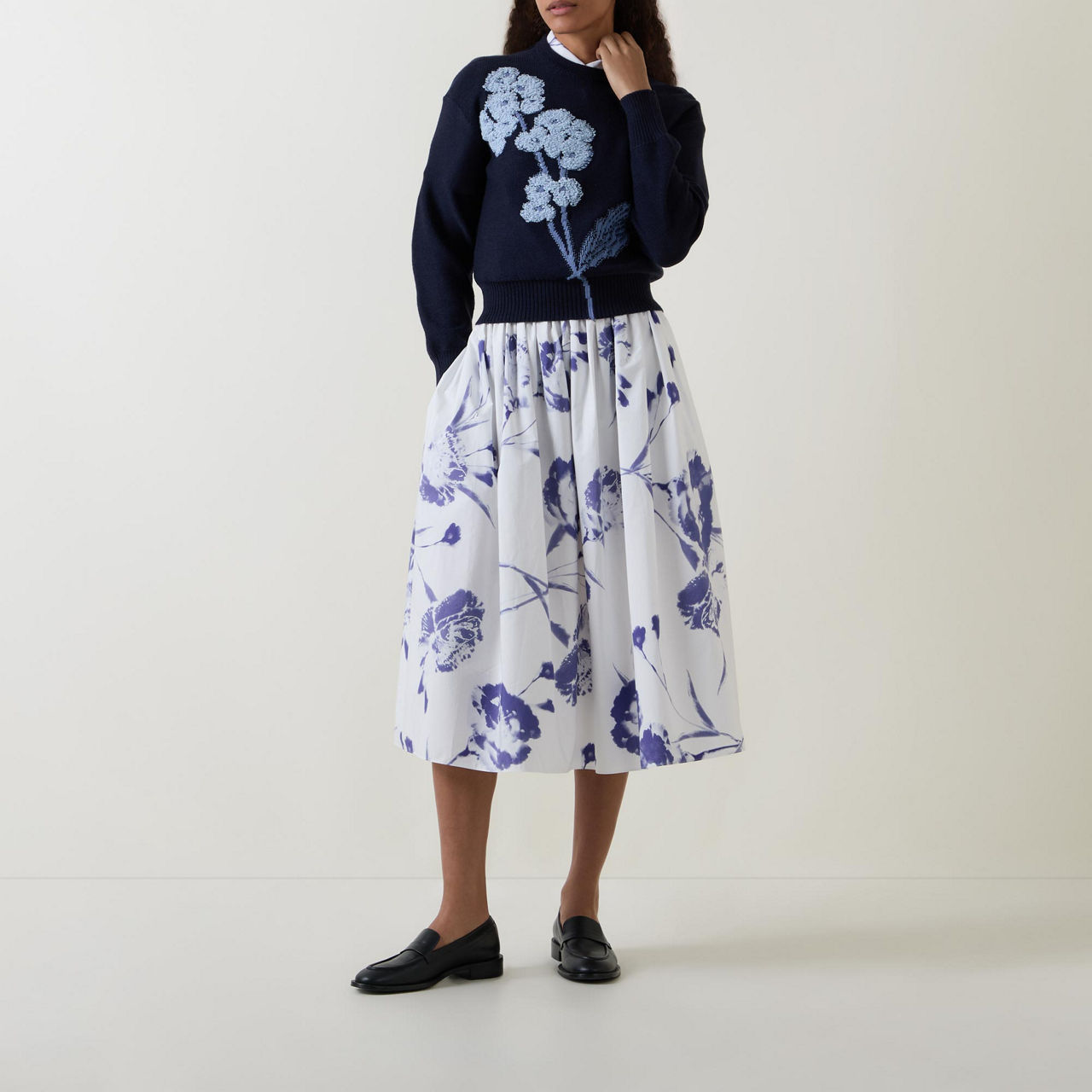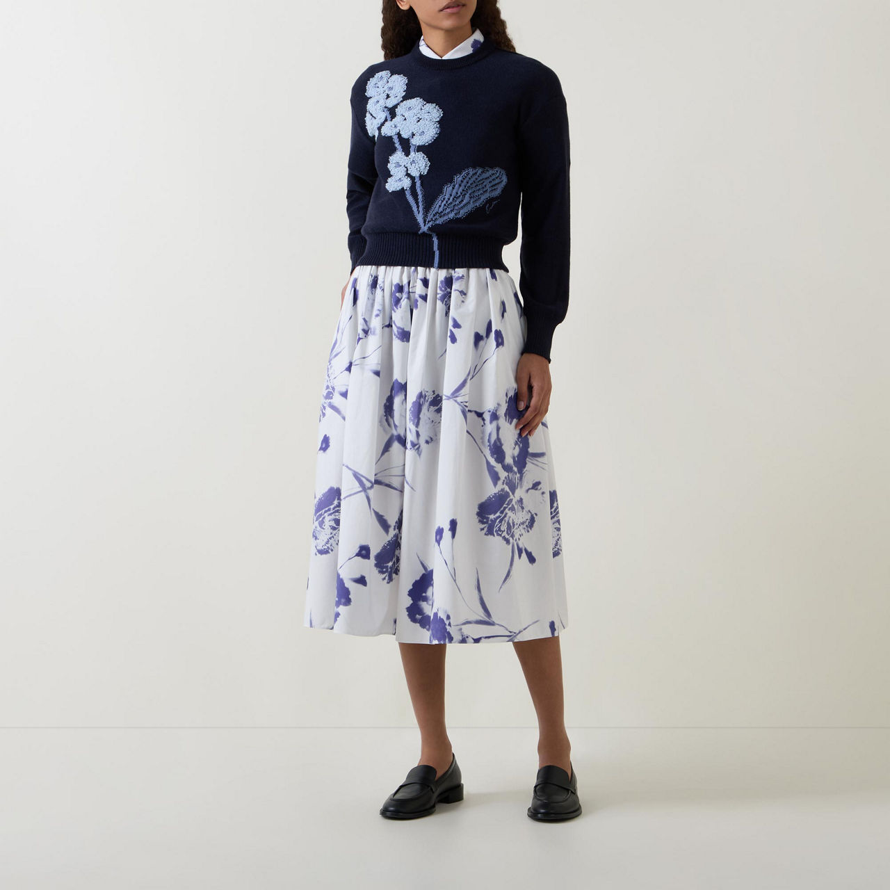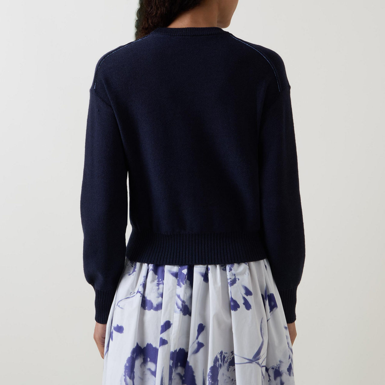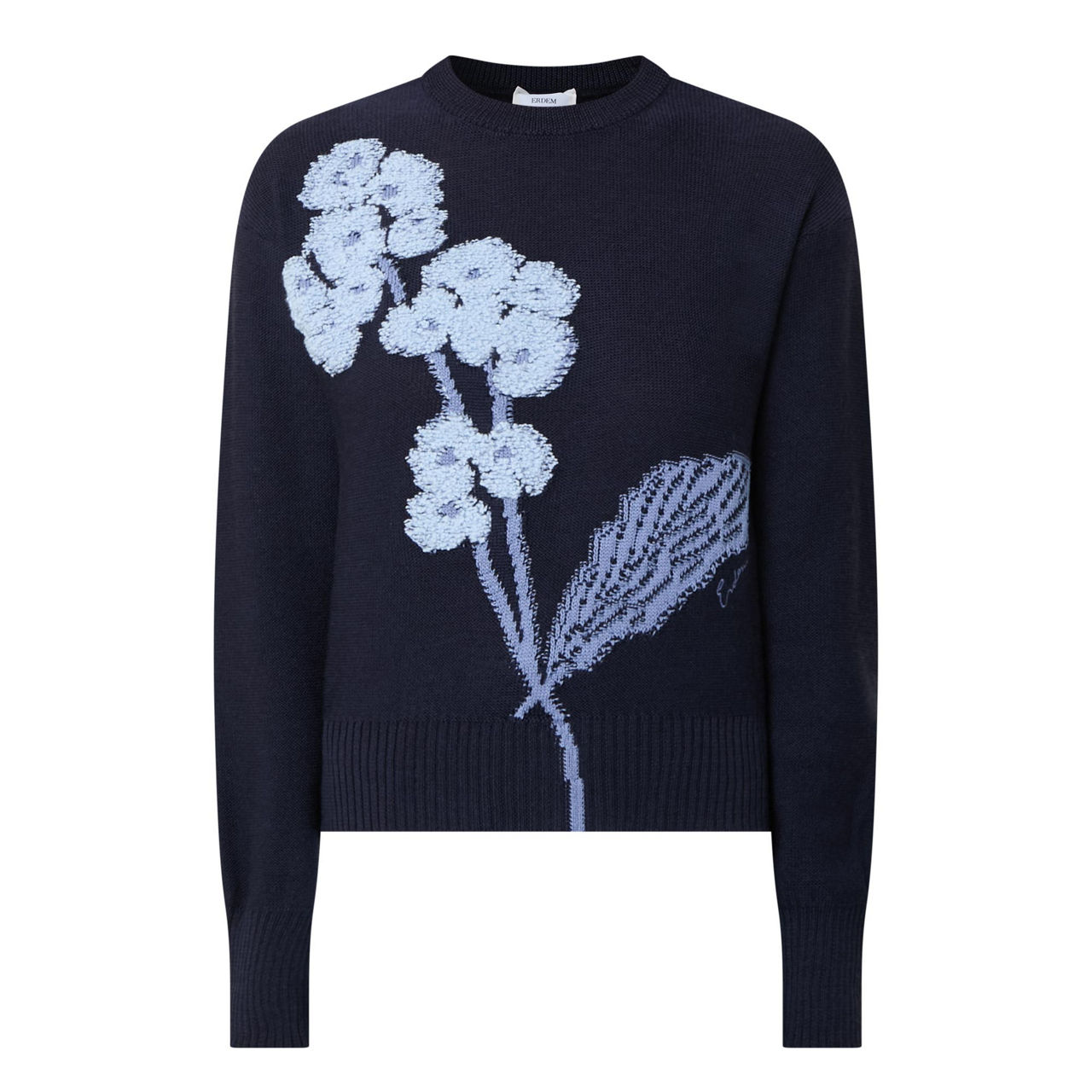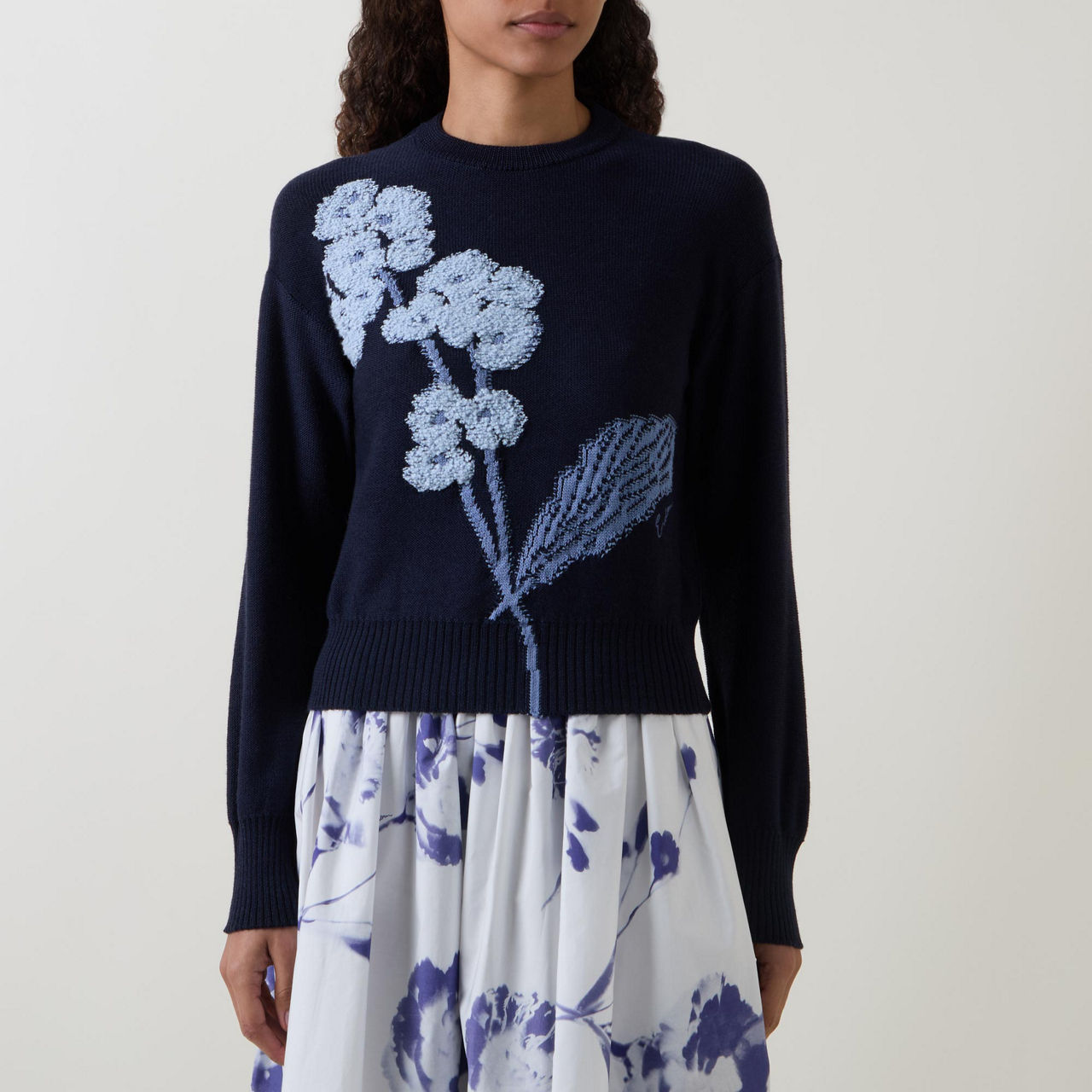 Botanical motifs appear across the SS25 collection from ERDEM, seen adorning this knit style from the line. Spun from merino wool to a cropped silhouette, it features a crew neckline and long sleeves, finished with a flower and leaf pattern and an embroidered signature detail.
