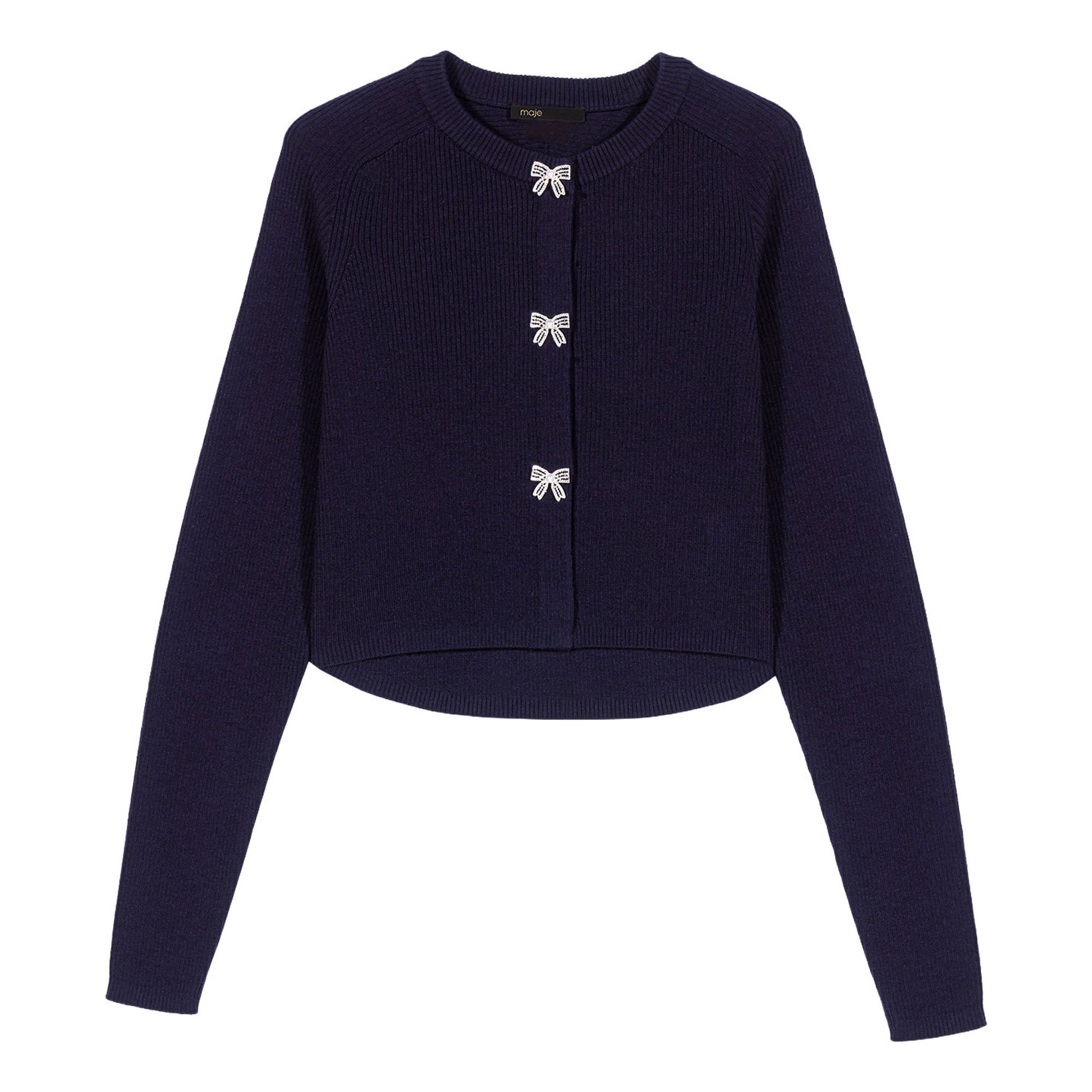 - Ribbed finish, raglan sleeves, three rhinestone bow jewellery buttons, ribbed trims