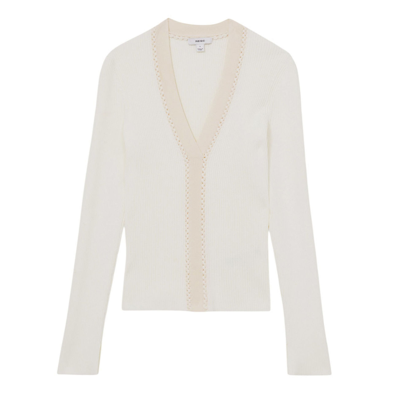 - V-neckline, long sleeves, rib-knit design, stretch fit, craft stitch detailing