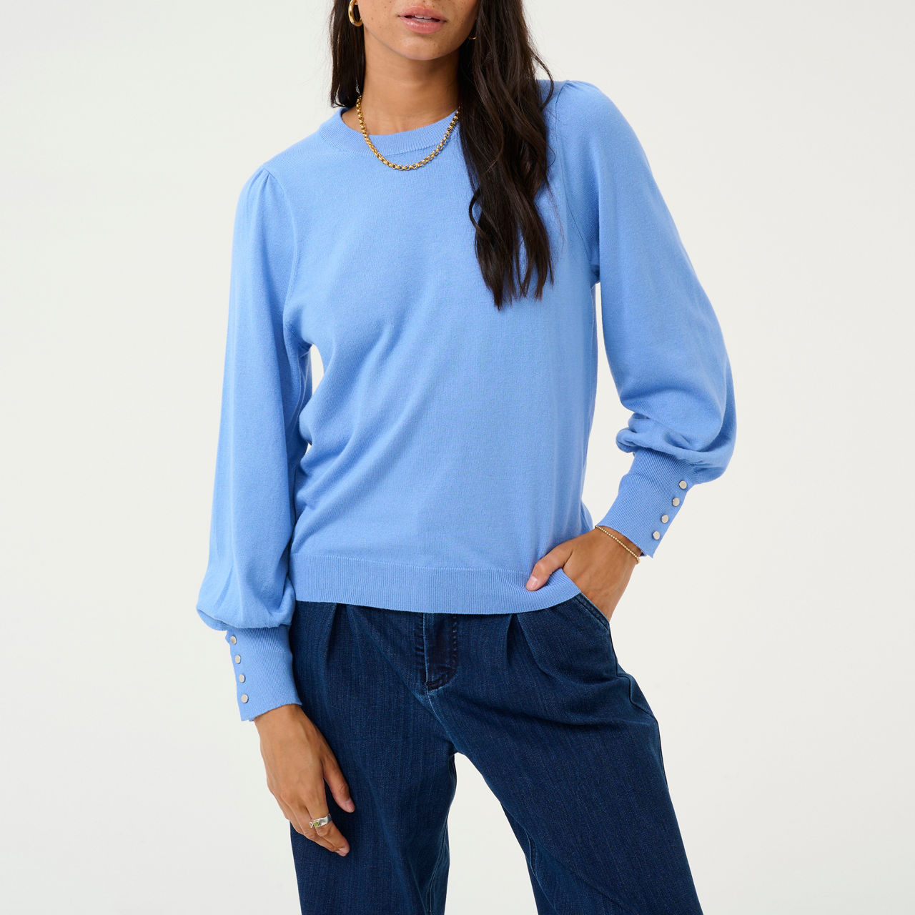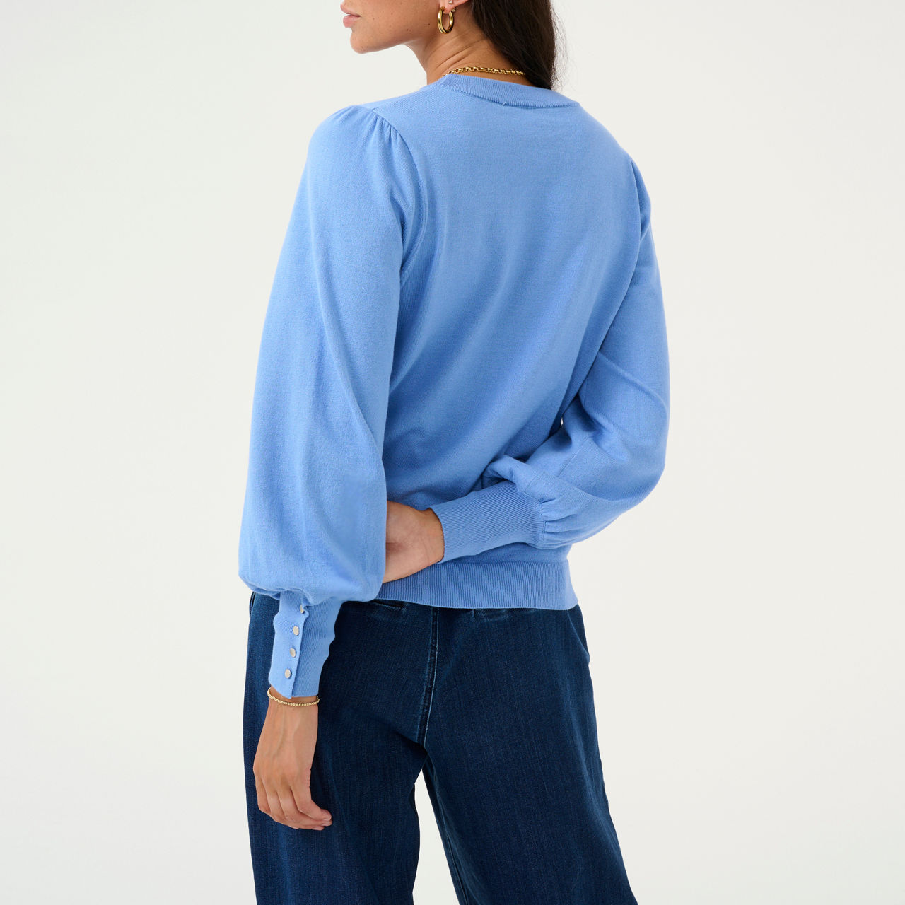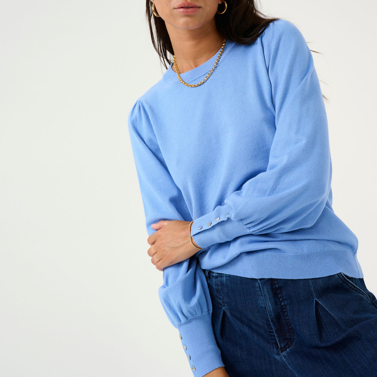 - Crew neckline, long sleeves, wide buttoned cuffs, ribbed trims