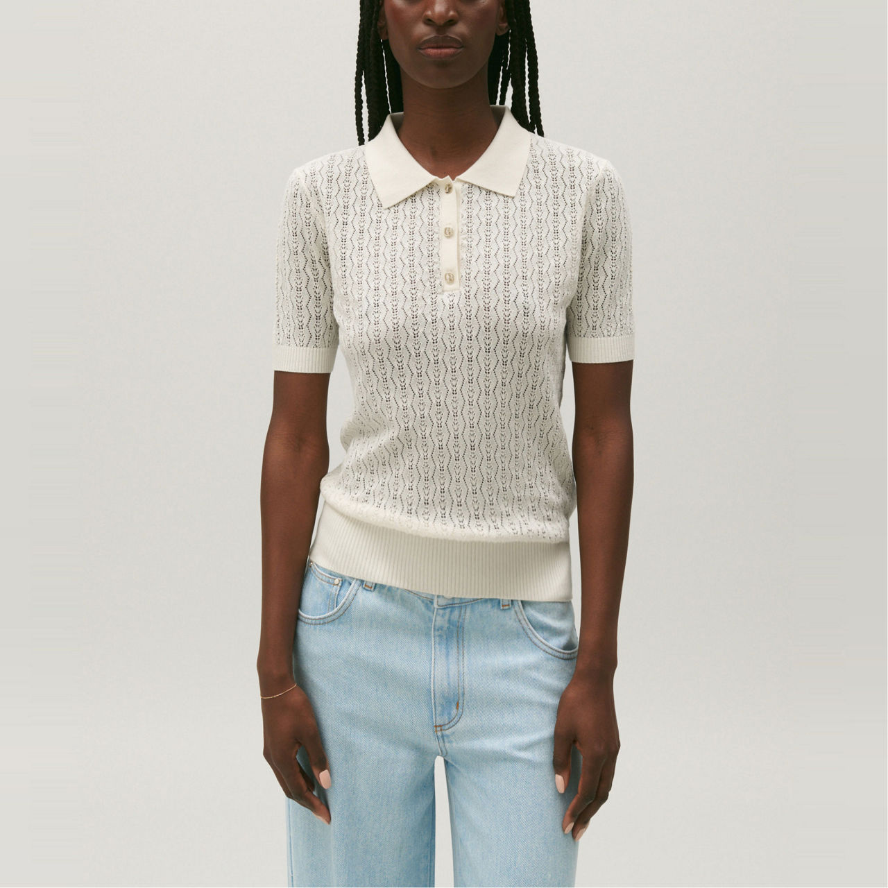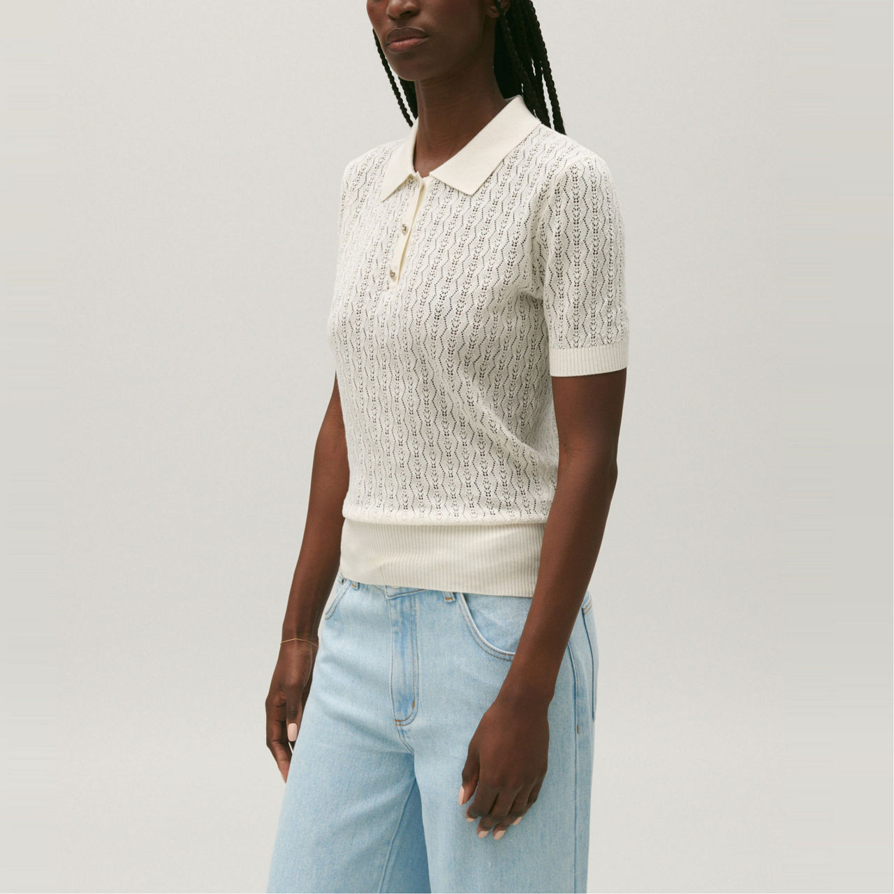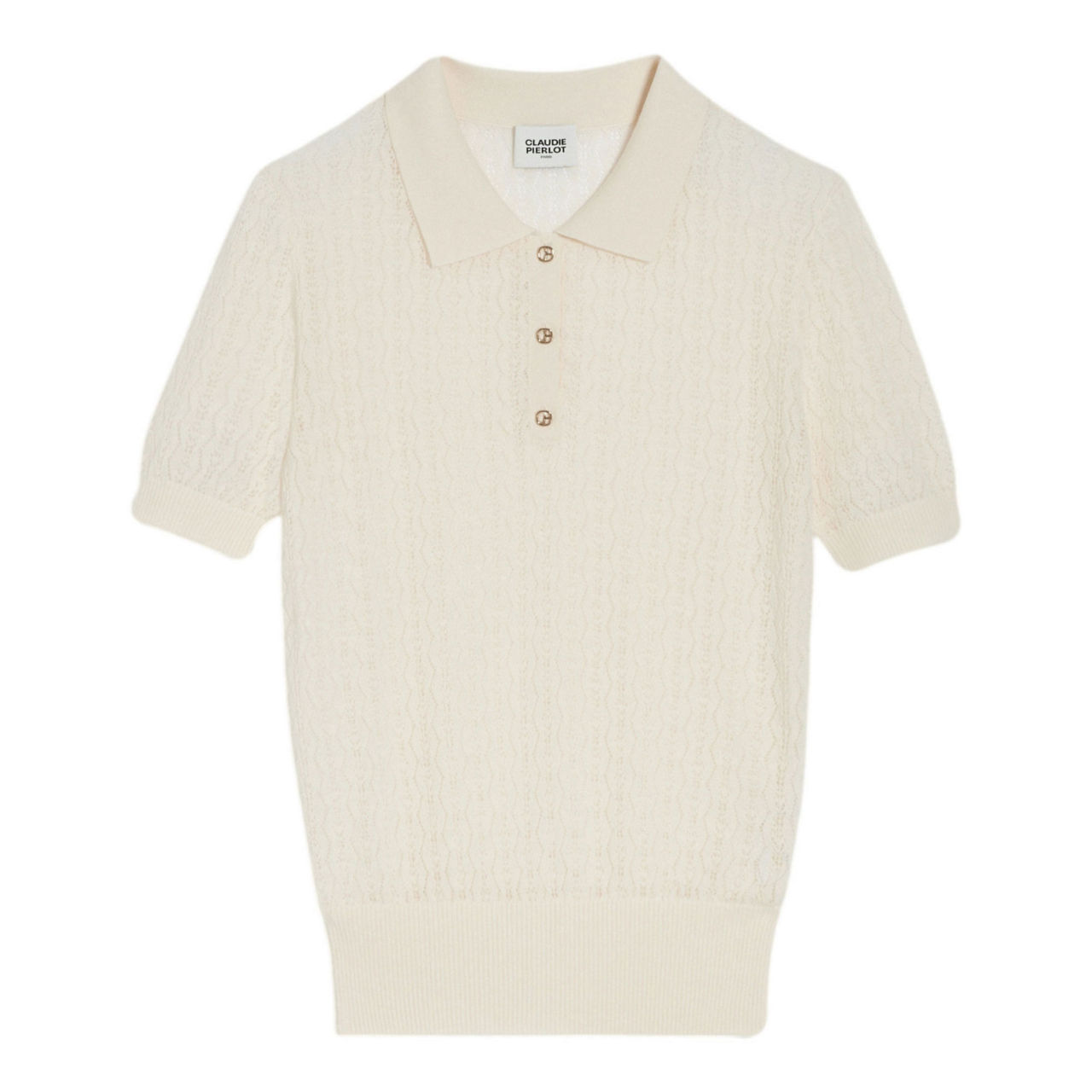 - Fine decorative knit, polo collar, short sleeves, openwork pointelle stitch, ribbed cuffs, collar and hem, golden CP buttons