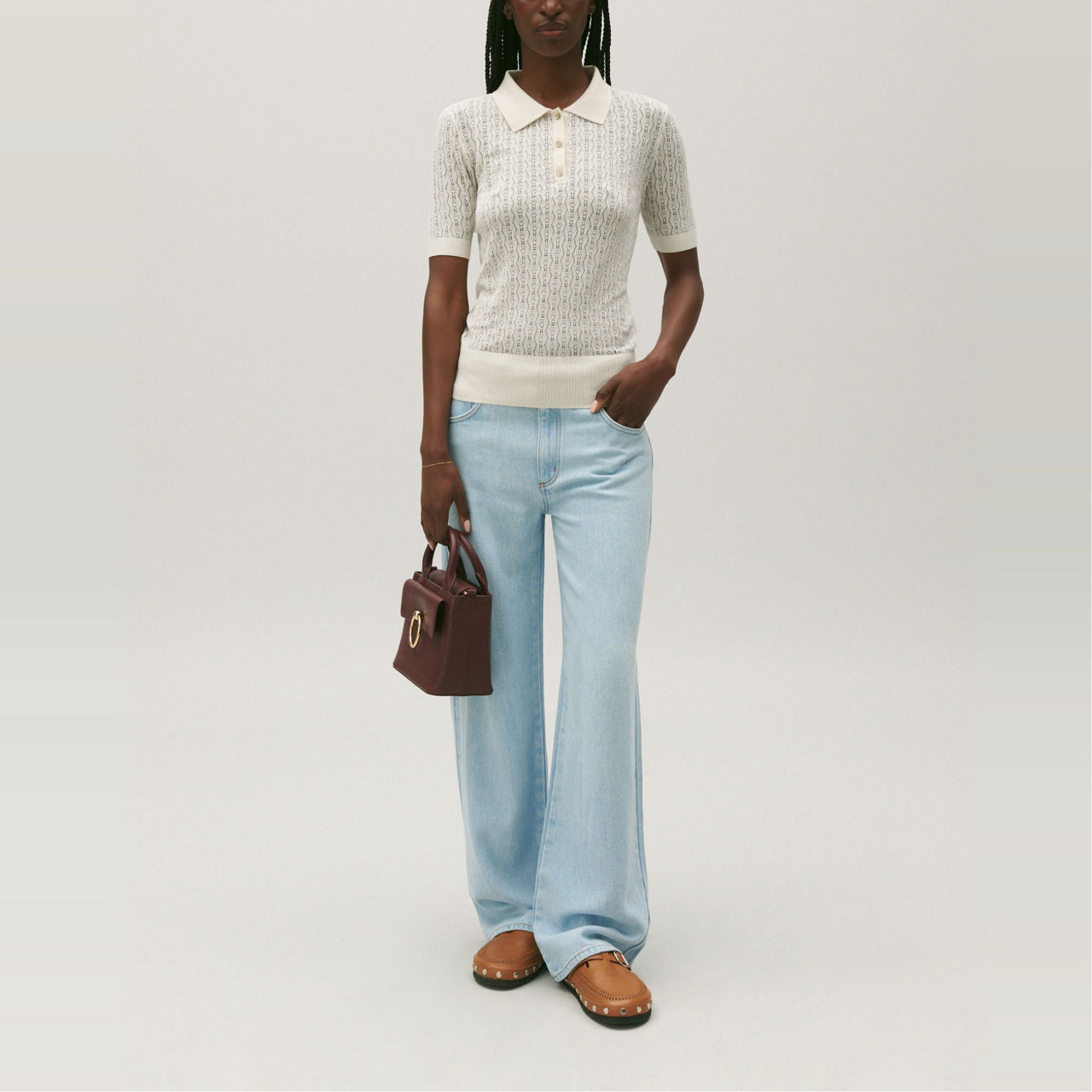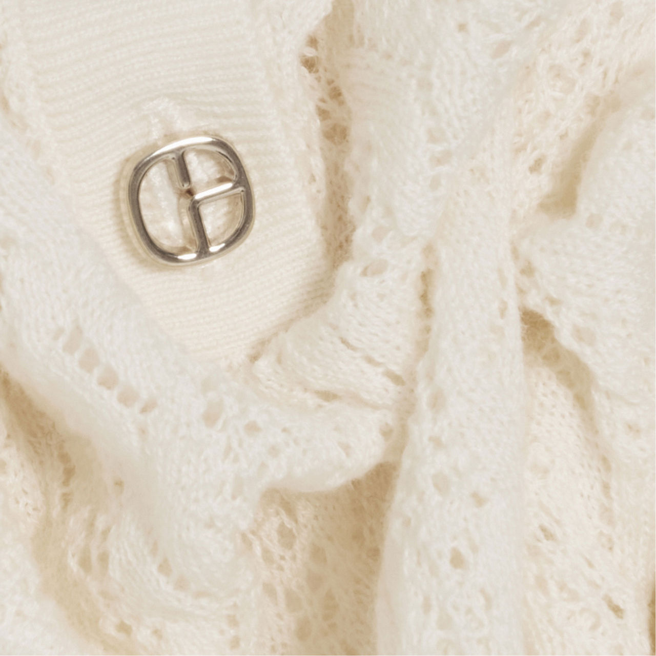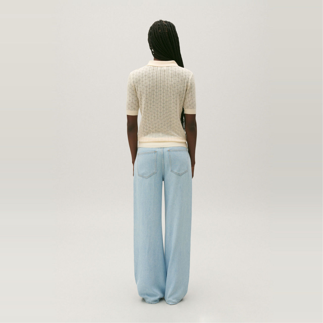 - Fine decorative knit, polo collar, short sleeves, openwork pointelle stitch, ribbed cuffs, collar and hem, golden CP buttons