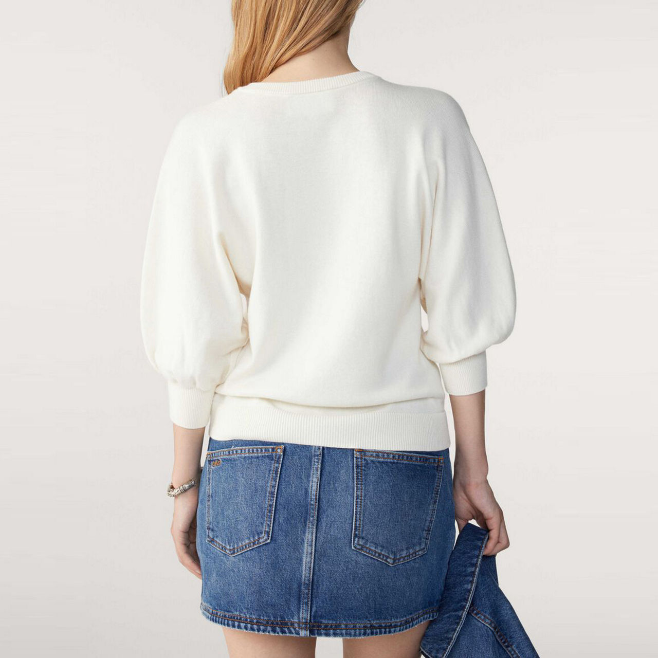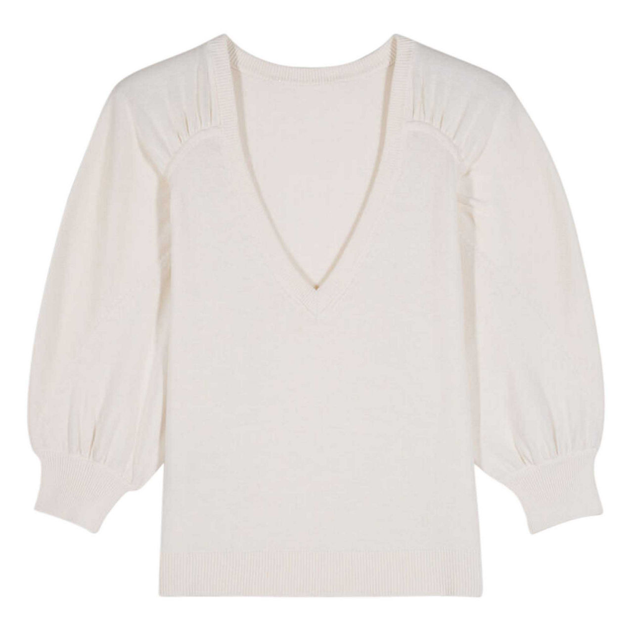 - V neck, three-quarter length, sleeves, fine knit, gathered shoulders, balloon sleeves, ribbed trims