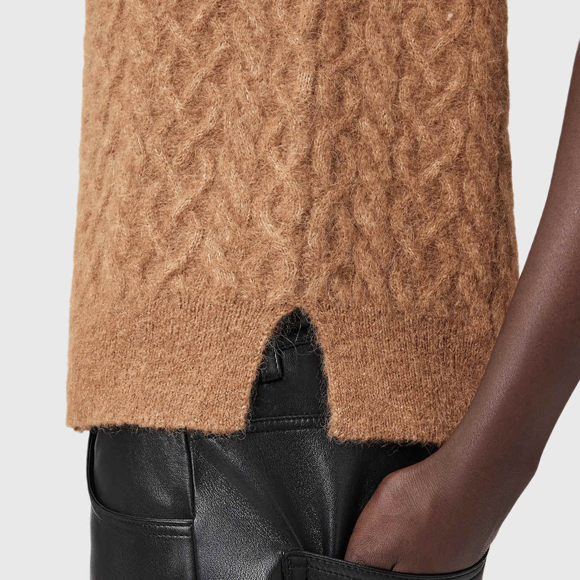 - Knitted, all-over cable knit pattern, wide shoulders, funnel neckline, soft feel, textured finish, brushed effect, ribbed trims, vintage-inspired, crew neckline, side splits