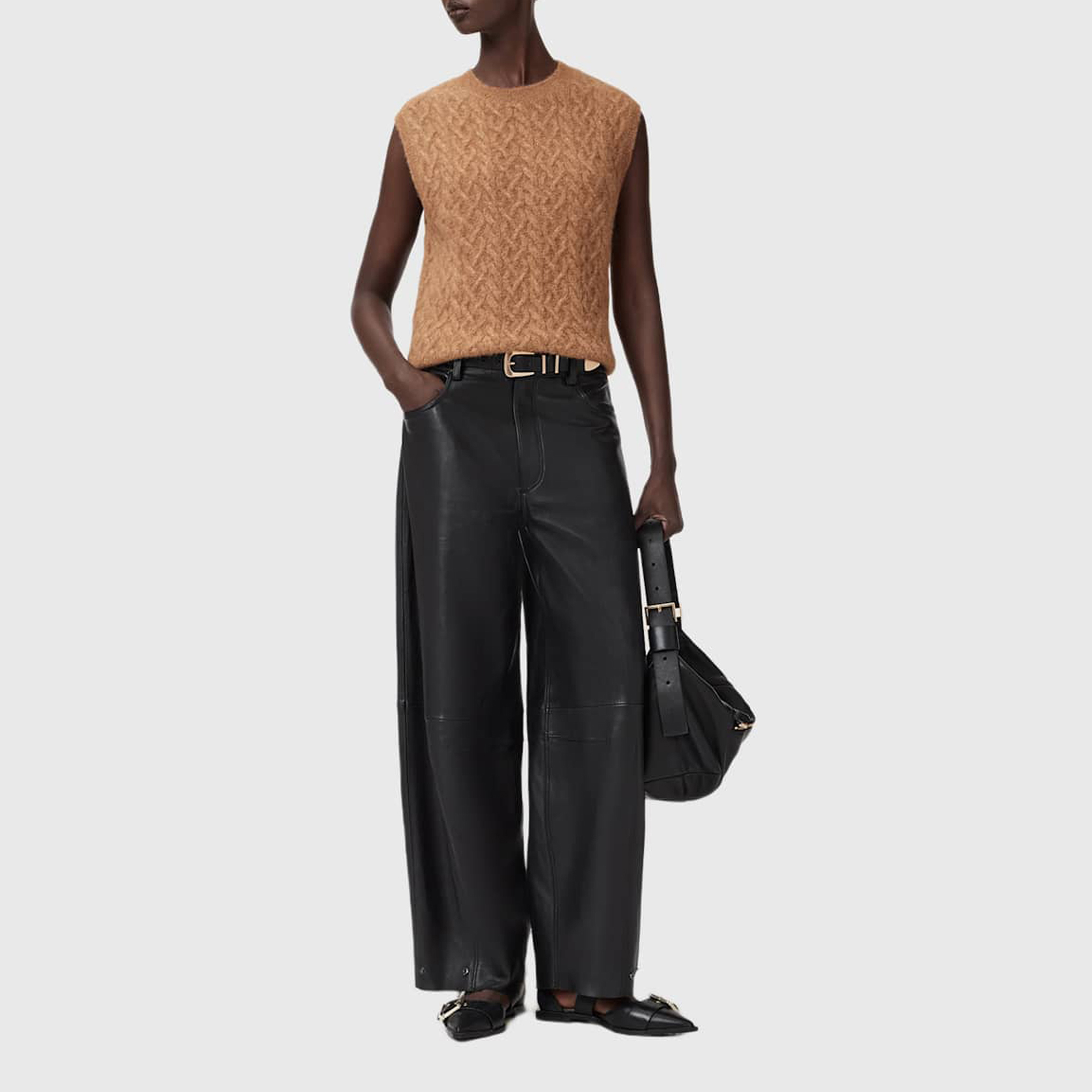 Founded in London in 1994, AllSaints has been crafting iconic leather pieces for decades. As well as statement jackets, biker boots, and accessories, the brand’s everyday items offer a dose of attitude with distressed detailing, daring prints and the signature Ramskull logo.